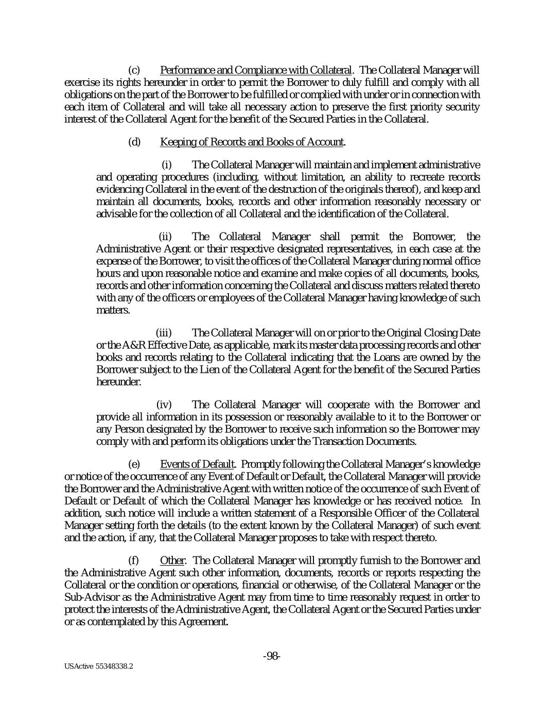 (c) Performance and Compliance with Collateral. The Collateral Manager will exercise its rights hereunder in order to permit the Borrower to duly fulfill and comply with all obligations on the part of the Borrower to be fulfilled or complied with under or in connection with each item of Collateral and will take all necessary action to preserve the first priority security interest of the Collateral Agent for the benefit of the Secured Parties in the Collateral. (d) Keeping of Records and Books of Account. (i) The Collateral Manager will maintain and implement administrative and operating procedures (including, without limitation, an ability to recreate records evidencing Collateral in the event of the destruction of the originals thereof), and keep and maintain all documents, books, records and other information reasonably necessary or advisable for the collection of all Collateral and the identification of the Collateral. (ii) The Collateral Manager shall permit the Borrower, the Administrative Agent or their respective designated representatives, in each case at the expense of the Borrower, to visit the offices of the Collateral Manager during normal office hours and upon reasonable notice and examine and make copies of all documents, books, records and other information concerning the Collateral and discuss matters related thereto with any of the officers or employees of the Collateral Manager having knowledge of such matters. (iii) The Collateral Manager will on or prior to the Original Closing Date or the A&R Effective Date, as applicable, mark its master data processing records and other books and records relating to the Collateral indicating that the Loans are owned by the Borrower subject to the Lien of the Collateral Agent for the benefit of the Secured Parties hereunder. (iv) The Collateral Manager will cooperate with the Borrower and provide all information in its possession or reasonably available to it to the Borrower or any Person designated by the Borrower to receive such information so the Borrower may comply with and perform its obligations under the Transaction Documents. (e) Events of Default. Promptly following the Collateral Manager’s knowledge or notice of the occurrence of any Event of Default or Default, the Collateral Manager will provide the Borrower and the Administrative Agent with written notice of the occurrence of such Event of Default or Default of which the Collateral Manager has knowledge or has received notice. In addition, such notice will include a written statement of a Responsible Officer of the Collateral Manager setting forth the details (to the extent known by the Collateral Manager) of such event and the action, if any, that the Collateral Manager proposes to take with respect thereto. (f) Other. The Collateral Manager will promptly furnish to the Borrower and the Administrative Agent such other information, documents, records or reports respecting the Collateral or the condition or operations, financial or otherwise, of the Collateral Manager or the Sub-Advisor as the Administrative Agent may from time to time reasonably request in order to protect the interests of the Administrative Agent, the Collateral Agent or the Secured Parties under or as contemplated by this Agreement. -98- USActive 55348338.2