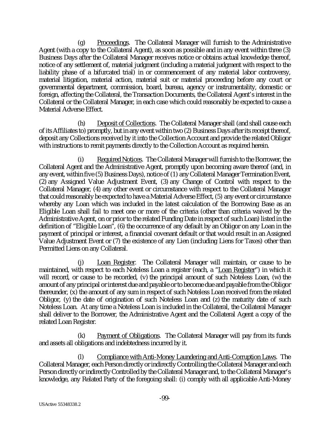 (g) Proceedings. The Collateral Manager will furnish to the Administrative Agent (with a copy to the Collateral Agent), as soon as possible and in any event within three (3) Business Days after the Collateral Manager receives notice or obtains actual knowledge thereof, notice of any settlement of, material judgment (including a material judgment with respect to the liability phase of a bifurcated trial) in or commencement of any material labor controversy, material litigation, material action, material suit or material proceeding before any court or governmental department, commission, board, bureau, agency or instrumentality, domestic or foreign, affecting the Collateral, the Transaction Documents, the Collateral Agent’s interest in the Collateral or the Collateral Manager, in each case which could reasonably be expected to cause a Material Adverse Effect. (h) Deposit of Collections. The Collateral Manager shall (and shall cause each of its Affiliates to) promptly, but in any event within two (2) Business Days after its receipt thereof, deposit any Collections received by it into the Collection Account and provide the related Obligor with instructions to remit payments directly to the Collection Account as required herein. (i) Required Notices. The Collateral Manager will furnish to the Borrower, the Collateral Agent and the Administrative Agent, promptly upon becoming aware thereof (and, in any event, within five (5) Business Days), notice of (1) any Collateral Manager Termination Event, (2) any Assigned Value Adjustment Event, (3) any Change of Control with respect to the Collateral Manager, (4) any other event or circumstance with respect to the Collateral Manager that could reasonably be expected to have a Material Adverse Effect, (5) any event or circumstance whereby any Loan which was included in the latest calculation of the Borrowing Base as an Eligible Loan shall fail to meet one or more of the criteria (other than criteria waived by the Administrative Agent, on or prior to the related Funding Date in respect of such Loan) listed in the definition of “Eligible Loan”, (6) the occurrence of any default by an Obligor on any Loan in the payment of principal or interest, a financial covenant default or that would result in an Assigned Value Adjustment Event or (7) the existence of any Lien (including Liens for Taxes) other than Permitted Liens on any Collateral. (j) Loan Register. The Collateral Manager will maintain, or cause to be maintained, with respect to each Noteless Loan a register (each, a “Loan Register”) in which it will record, or cause to be recorded, (v) the principal amount of such Noteless Loan, (w) the amount of any principal or interest due and payable or to become due and payable from the Obligor thereunder, (x) the amount of any sum in respect of such Noteless Loan received from the related Obligor, (y) the date of origination of such Noteless Loan and (z) the maturity date of such Noteless Loan. At any time a Noteless Loan is included in the Collateral, the Collateral Manager shall deliver to the Borrower, the Administrative Agent and the Collateral Agent a copy of the related Loan Register. (k) Payment of Obligations. The Collateral Manager will pay from its funds and assets all obligations and indebtedness incurred by it. (l) Compliance with Anti-Money Laundering and Anti-Corruption Laws. The Collateral Manager, each Person directly or indirectly Controlling the Collateral Manager and each Person directly or indirectly Controlled by the Collateral Manager and, to the Collateral Manager’s knowledge, any Related Party of the foregoing shall: (i) comply with all applicable Anti-Money -99- USActive 55348338.2