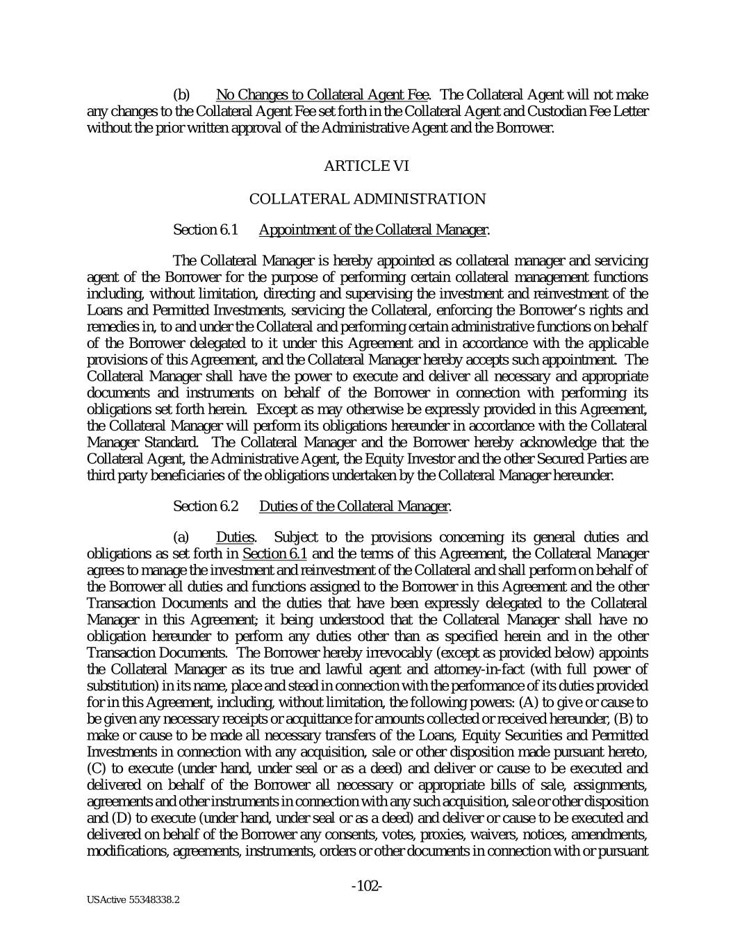 (b) No Changes to Collateral Agent Fee. The Collateral Agent will not make any changes to the Collateral Agent Fee set forth in the Collateral Agent and Custodian Fee Letter without the prior written approval of the Administrative Agent and the Borrower. ARTICLE VI COLLATERAL ADMINISTRATION Section 6.1 Appointment of the Collateral Manager. The Collateral Manager is hereby appointed as collateral manager and servicing agent of the Borrower for the purpose of performing certain collateral management functions including, without limitation, directing and supervising the investment and reinvestment of the Loans and Permitted Investments, servicing the Collateral, enforcing the Borrower’s rights and remedies in, to and under the Collateral and performing certain administrative functions on behalf of the Borrower delegated to it under this Agreement and in accordance with the applicable provisions of this Agreement, and the Collateral Manager hereby accepts such appointment. The Collateral Manager shall have the power to execute and deliver all necessary and appropriate documents and instruments on behalf of the Borrower in connection with performing its obligations set forth herein. Except as may otherwise be expressly provided in this Agreement, the Collateral Manager will perform its obligations hereunder in accordance with the Collateral Manager Standard. The Collateral Manager and the Borrower hereby acknowledge that the Collateral Agent, the Administrative Agent, the Equity Investor and the other Secured Parties are third party beneficiaries of the obligations undertaken by the Collateral Manager hereunder. Section 6.2 Duties of the Collateral Manager. (a) Duties. Subject to the provisions concerning its general duties and obligations as set forth in Section 6.1 and the terms of this Agreement, the Collateral Manager agrees to manage the investment and reinvestment of the Collateral and shall perform on behalf of the Borrower all duties and functions assigned to the Borrower in this Agreement and the other Transaction Documents and the duties that have been expressly delegated to the Collateral Manager in this Agreement; it being understood that the Collateral Manager shall have no obligation hereunder to perform any duties other than as specified herein and in the other Transaction Documents. The Borrower hereby irrevocably (except as provided below) appoints the Collateral Manager as its true and lawful agent and attorney-in-fact (with full power of substitution) in its name, place and stead in connection with the performance of its duties provided for in this Agreement, including, without limitation, the following powers: (A) to give or cause to be given any necessary receipts or acquittance for amounts collected or received hereunder, (B) to make or cause to be made all necessary transfers of the Loans, Equity Securities and Permitted Investments in connection with any acquisition, sale or other disposition made pursuant hereto, (C) to execute (under hand, under seal or as a deed) and deliver or cause to be executed and delivered on behalf of the Borrower all necessary or appropriate bills of sale, assignments, agreements and other instruments in connection with any such acquisition, sale or other disposition and (D) to execute (under hand, under seal or as a deed) and deliver or cause to be executed and delivered on behalf of the Borrower any consents, votes, proxies, waivers, notices, amendments, modifications, agreements, instruments, orders or other documents in connection with or pursuant -102- USActive 55348338.2