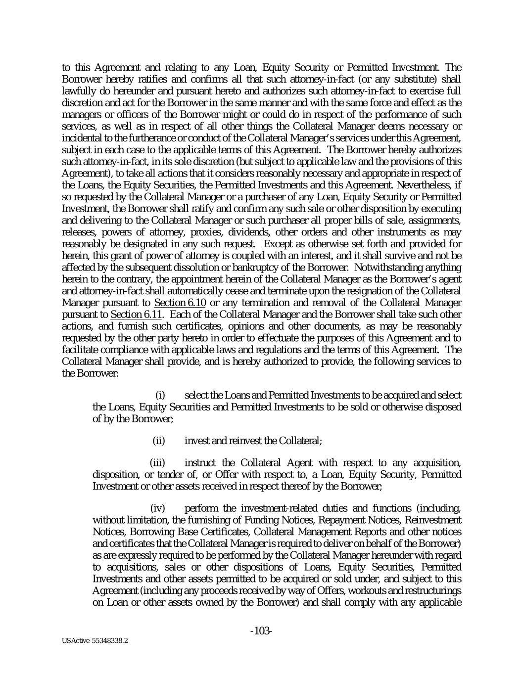 to this Agreement and relating to any Loan, Equity Security or Permitted Investment. The Borrower hereby ratifies and confirms all that such attorney-in-fact (or any substitute) shall lawfully do hereunder and pursuant hereto and authorizes such attorney-in-fact to exercise full discretion and act for the Borrower in the same manner and with the same force and effect as the managers or officers of the Borrower might or could do in respect of the performance of such services, as well as in respect of all other things the Collateral Manager deems necessary or incidental to the furtherance or conduct of the Collateral Manager’s services under this Agreement, subject in each case to the applicable terms of this Agreement. The Borrower hereby authorizes such attorney-in-fact, in its sole discretion (but subject to applicable law and the provisions of this Agreement), to take all actions that it considers reasonably necessary and appropriate in respect of the Loans, the Equity Securities, the Permitted Investments and this Agreement. Nevertheless, if so requested by the Collateral Manager or a purchaser of any Loan, Equity Security or Permitted Investment, the Borrower shall ratify and confirm any such sale or other disposition by executing and delivering to the Collateral Manager or such purchaser all proper bills of sale, assignments, releases, powers of attorney, proxies, dividends, other orders and other instruments as may reasonably be designated in any such request. Except as otherwise set forth and provided for herein, this grant of power of attorney is coupled with an interest, and it shall survive and not be affected by the subsequent dissolution or bankruptcy of the Borrower. Notwithstanding anything herein to the contrary, the appointment herein of the Collateral Manager as the Borrower’s agent and attorney-in-fact shall automatically cease and terminate upon the resignation of the Collateral Manager pursuant to Section 6.10 or any termination and removal of the Collateral Manager pursuant to Section 6.11. Each of the Collateral Manager and the Borrower shall take such other actions, and furnish such certificates, opinions and other documents, as may be reasonably requested by the other party hereto in order to effectuate the purposes of this Agreement and to facilitate compliance with applicable laws and regulations and the terms of this Agreement. The Collateral Manager shall provide, and is hereby authorized to provide, the following services to the Borrower: (i) select the Loans and Permitted Investments to be acquired and select the Loans, Equity Securities and Permitted Investments to be sold or otherwise disposed of by the Borrower; (ii) invest and reinvest the Collateral; (iii) instruct the Collateral Agent with respect to any acquisition, disposition, or tender of, or Offer with respect to, a Loan, Equity Security, Permitted Investment or other assets received in respect thereof by the Borrower; (iv) perform the investment-related duties and functions (including, without limitation, the furnishing of Funding Notices, Repayment Notices, Reinvestment Notices, Borrowing Base Certificates, Collateral Management Reports and other notices and certificates that the Collateral Manager is required to deliver on behalf of the Borrower) as are expressly required to be performed by the Collateral Manager hereunder with regard to acquisitions, sales or other dispositions of Loans, Equity Securities, Permitted Investments and other assets permitted to be acquired or sold under, and subject to this Agreement (including any proceeds received by way of Offers, workouts and restructurings on Loan or other assets owned by the Borrower) and shall comply with any applicable -103- USActive 55348338.2