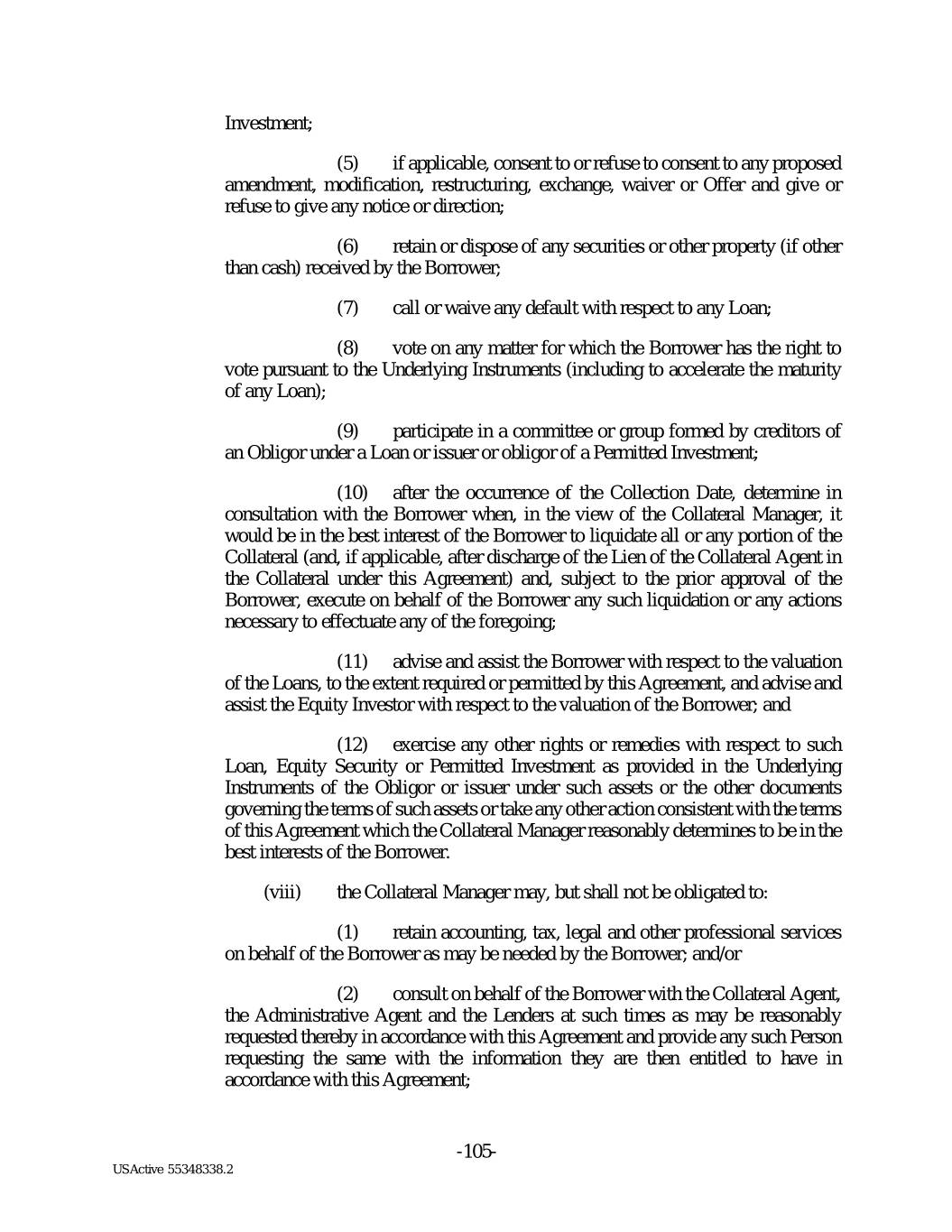 Investment; (5) if applicable, consent to or refuse to consent to any proposed amendment, modification, restructuring, exchange, waiver or Offer and give or refuse to give any notice or direction; (6) retain or dispose of any securities or other property (if other than cash) received by the Borrower; (7) call or waive any default with respect to any Loan; (8) vote on any matter for which the Borrower has the right to vote pursuant to the Underlying Instruments (including to accelerate the maturity of any Loan); (9) participate in a committee or group formed by creditors of an Obligor under a Loan or issuer or obligor of a Permitted Investment; (10) after the occurrence of the Collection Date, determine in consultation with the Borrower when, in the view of the Collateral Manager, it would be in the best interest of the Borrower to liquidate all or any portion of the Collateral (and, if applicable, after discharge of the Lien of the Collateral Agent in the Collateral under this Agreement) and, subject to the prior approval of the Borrower, execute on behalf of the Borrower any such liquidation or any actions necessary to effectuate any of the foregoing; (11) advise and assist the Borrower with respect to the valuation of the Loans, to the extent required or permitted by this Agreement, and advise and assist the Equity Investor with respect to the valuation of the Borrower; and (12) exercise any other rights or remedies with respect to such Loan, Equity Security or Permitted Investment as provided in the Underlying Instruments of the Obligor or issuer under such assets or the other documents governing the terms of such assets or take any other action consistent with the terms of this Agreement which the Collateral Manager reasonably determines to be in the best interests of the Borrower. (viii) the Collateral Manager may, but shall not be obligated to: (1) retain accounting, tax, legal and other professional services on behalf of the Borrower as may be needed by the Borrower; and/or (2) consult on behalf of the Borrower with the Collateral Agent, the Administrative Agent and the Lenders at such times as may be reasonably requested thereby in accordance with this Agreement and provide any such Person requesting the same with the information they are then entitled to have in accordance with this Agreement; -105- USActive 55348338.2