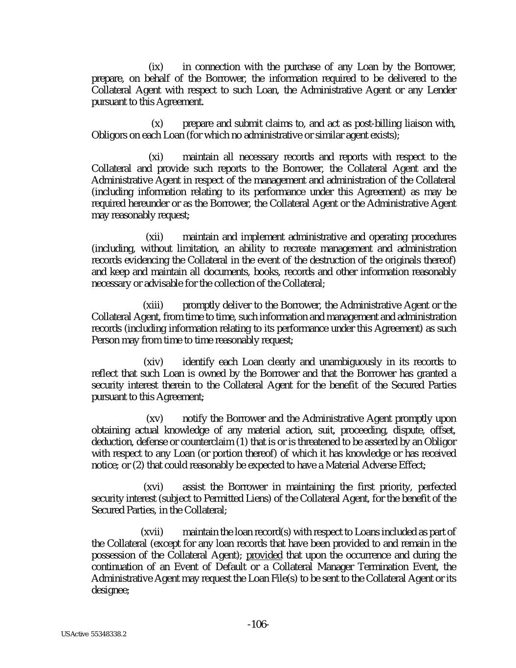 (ix) in connection with the purchase of any Loan by the Borrower, prepare, on behalf of the Borrower, the information required to be delivered to the Collateral Agent with respect to such Loan, the Administrative Agent or any Lender pursuant to this Agreement. (x) prepare and submit claims to, and act as post-billing liaison with, Obligors on each Loan (for which no administrative or similar agent exists); (xi) maintain all necessary records and reports with respect to the Collateral and provide such reports to the Borrower, the Collateral Agent and the Administrative Agent in respect of the management and administration of the Collateral (including information relating to its performance under this Agreement) as may be required hereunder or as the Borrower, the Collateral Agent or the Administrative Agent may reasonably request; (xii) maintain and implement administrative and operating procedures (including, without limitation, an ability to recreate management and administration records evidencing the Collateral in the event of the destruction of the originals thereof) and keep and maintain all documents, books, records and other information reasonably necessary or advisable for the collection of the Collateral; (xiii) promptly deliver to the Borrower, the Administrative Agent or the Collateral Agent, from time to time, such information and management and administration records (including information relating to its performance under this Agreement) as such Person may from time to time reasonably request; (xiv) identify each Loan clearly and unambiguously in its records to reflect that such Loan is owned by the Borrower and that the Borrower has granted a security interest therein to the Collateral Agent for the benefit of the Secured Parties pursuant to this Agreement; (xv) notify the Borrower and the Administrative Agent promptly upon obtaining actual knowledge of any material action, suit, proceeding, dispute, offset, deduction, defense or counterclaim (1) that is or is threatened to be asserted by an Obligor with respect to any Loan (or portion thereof) of which it has knowledge or has received notice; or (2) that could reasonably be expected to have a Material Adverse Effect; (xvi) assist the Borrower in maintaining the first priority, perfected security interest (subject to Permitted Liens) of the Collateral Agent, for the benefit of the Secured Parties, in the Collateral; (xvii) maintain the loan record(s) with respect to Loans included as part of the Collateral (except for any loan records that have been provided to and remain in the possession of the Collateral Agent); provided that upon the occurrence and during the continuation of an Event of Default or a Collateral Manager Termination Event, the Administrative Agent may request the Loan File(s) to be sent to the Collateral Agent or its designee; -106- USActive 55348338.2