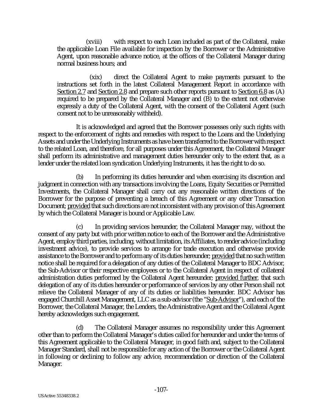 (xviii) with respect to each Loan included as part of the Collateral, make the applicable Loan File available for inspection by the Borrower or the Administrative Agent, upon reasonable advance notice, at the offices of the Collateral Manager during normal business hours; and (xix) direct the Collateral Agent to make payments pursuant to the instructions set forth in the latest Collateral Management Report in accordance with Section 2.7 and Section 2.8 and prepare such other reports pursuant to Section 6.8 as (A) required to be prepared by the Collateral Manager and (B) to the extent not otherwise expressly a duty of the Collateral Agent, with the consent of the Collateral Agent (such consent not to be unreasonably withheld). It is acknowledged and agreed that the Borrower possesses only such rights with respect to the enforcement of rights and remedies with respect to the Loans and the Underlying Assets and under the Underlying Instruments as have been transferred to the Borrower with respect to the related Loan, and therefore, for all purposes under this Agreement, the Collateral Manager shall perform its administrative and management duties hereunder only to the extent that, as a lender under the related loan syndication Underlying Instruments, it has the right to do so. (b) In performing its duties hereunder and when exercising its discretion and judgment in connection with any transactions involving the Loans, Equity Securities or Permitted Investments, the Collateral Manager shall carry out any reasonable written directions of the Borrower for the purpose of preventing a breach of this Agreement or any other Transaction Document; provided that such directions are not inconsistent with any provision of this Agreement by which the Collateral Manager is bound or Applicable Law. (c) In providing services hereunder, the Collateral Manager may, without the consent of any party but with prior written notice to each of the Borrower and the Administrative Agent, employ third parties, including, without limitation, its Affiliates, to render advice (including investment advice), to provide services to arrange for trade execution and otherwise provide assistance to the Borrower and to perform any of its duties hereunder; provided that no such written notice shall be required for a delegation of any duties of the Collateral Manager to BDC Advisor, the Sub-Advisor or their respective employees or to the Collateral Agent in respect of collateral administration duties performed by the Collateral Agent hereunder; provided further, that such delegation of any of its duties hereunder or performance of services by any other Person shall not relieve the Collateral Manager of any of its duties or liabilities hereunder. BDC Advisor has engaged Churchill Asset Management, LLC as a sub-advisor (the “Sub-Advisor”), and each of the Borrower, the Collateral Manager, the Lenders, the Administrative Agent and the Collateral Agent hereby acknowledges such engagement. (d) The Collateral Manager assumes no responsibility under this Agreement other than to perform the Collateral Manager’s duties called for hereunder and under the terms of this Agreement applicable to the Collateral Manager, in good faith and, subject to the Collateral Manager Standard, shall not be responsible for any action of the Borrower or the Collateral Agent in following or declining to follow any advice, recommendation or direction of the Collateral Manager. -107- USActive 55348338.2