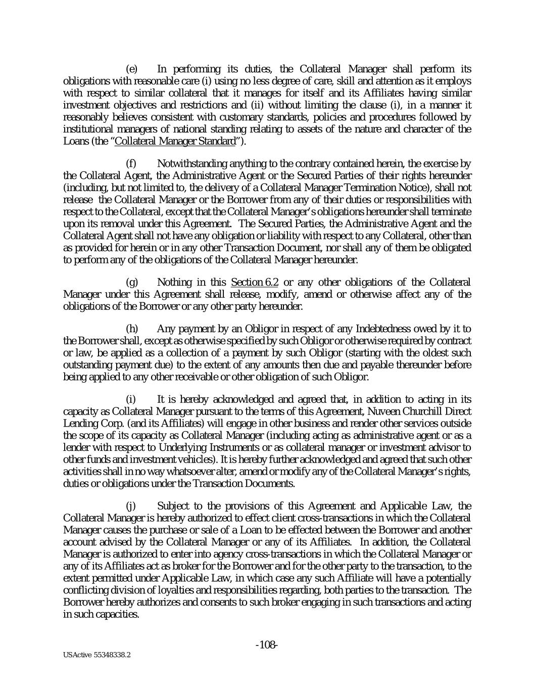 (e) In performing its duties, the Collateral Manager shall perform its obligations with reasonable care (i) using no less degree of care, skill and attention as it employs with respect to similar collateral that it manages for itself and its Affiliates having similar investment objectives and restrictions and (ii) without limiting the clause (i), in a manner it reasonably believes consistent with customary standards, policies and procedures followed by institutional managers of national standing relating to assets of the nature and character of the Loans (the “Collateral Manager Standard”). (f) Notwithstanding anything to the contrary contained herein, the exercise by the Collateral Agent, the Administrative Agent or the Secured Parties of their rights hereunder (including, but not limited to, the delivery of a Collateral Manager Termination Notice), shall not release the Collateral Manager or the Borrower from any of their duties or responsibilities with respect to the Collateral, except that the Collateral Manager’s obligations hereunder shall terminate upon its removal under this Agreement. The Secured Parties, the Administrative Agent and the Collateral Agent shall not have any obligation or liability with respect to any Collateral, other than as provided for herein or in any other Transaction Document, nor shall any of them be obligated to perform any of the obligations of the Collateral Manager hereunder. (g) Nothing in this Section 6.2 or any other obligations of the Collateral Manager under this Agreement shall release, modify, amend or otherwise affect any of the obligations of the Borrower or any other party hereunder. (h) Any payment by an Obligor in respect of any Indebtedness owed by it to the Borrower shall, except as otherwise specified by such Obligor or otherwise required by contract or law, be applied as a collection of a payment by such Obligor (starting with the oldest such outstanding payment due) to the extent of any amounts then due and payable thereunder before being applied to any other receivable or other obligation of such Obligor. (i) It is hereby acknowledged and agreed that, in addition to acting in its capacity as Collateral Manager pursuant to the terms of this Agreement, Nuveen Churchill Direct Lending Corp. (and its Affiliates) will engage in other business and render other services outside the scope of its capacity as Collateral Manager (including acting as administrative agent or as a lender with respect to Underlying Instruments or as collateral manager or investment advisor to other funds and investment vehicles). It is hereby further acknowledged and agreed that such other activities shall in no way whatsoever alter, amend or modify any of the Collateral Manager’s rights, duties or obligations under the Transaction Documents. (j) Subject to the provisions of this Agreement and Applicable Law, the Collateral Manager is hereby authorized to effect client cross-transactions in which the Collateral Manager causes the purchase or sale of a Loan to be effected between the Borrower and another account advised by the Collateral Manager or any of its Affiliates. In addition, the Collateral Manager is authorized to enter into agency cross-transactions in which the Collateral Manager or any of its Affiliates act as broker for the Borrower and for the other party to the transaction, to the extent permitted under Applicable Law, in which case any such Affiliate will have a potentially conflicting division of loyalties and responsibilities regarding, both parties to the transaction. The Borrower hereby authorizes and consents to such broker engaging in such transactions and acting in such capacities. -108- USActive 55348338.2