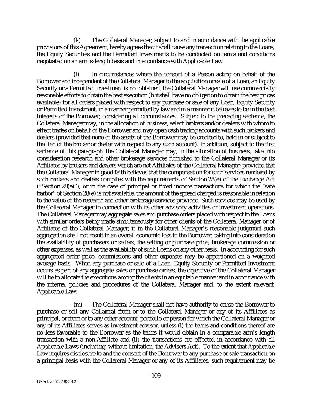 (k) The Collateral Manager, subject to and in accordance with the applicable provisions of this Agreement, hereby agrees that it shall cause any transaction relating to the Loans, the Equity Securities and the Permitted Investments to be conducted on terms and conditions negotiated on an arm’s-length basis and in accordance with Applicable Law. (l) In circumstances where the consent of a Person acting on behalf of the Borrower and independent of the Collateral Manager to the acquisition or sale of a Loan, an Equity Security or a Permitted Investment is not obtained, the Collateral Manager will use commercially reasonable efforts to obtain the best execution (but shall have no obligation to obtain the best prices available) for all orders placed with respect to any purchase or sale of any Loan, Equity Security or Permitted Investment, in a manner permitted by law and in a manner it believes to be in the best interests of the Borrower, considering all circumstances. Subject to the preceding sentence, the Collateral Manager may, in the allocation of business, select brokers and/or dealers with whom to effect trades on behalf of the Borrower and may open cash trading accounts with such brokers and dealers (provided that none of the assets of the Borrower may be credited to, held in or subject to the lien of the broker or dealer with respect to any such account). In addition, subject to the first sentence of this paragraph, the Collateral Manager may, in the allocation of business, take into consideration research and other brokerage services furnished to the Collateral Manager or its Affiliates by brokers and dealers which are not Affiliates of the Collateral Manager; provided that the Collateral Manager in good faith believes that the compensation for such services rendered by such brokers and dealers complies with the requirements of Section 28(e) of the Exchange Act (“Section 28(e)”), or in the case of principal or fixed income transactions for which the “safe harbor” of Section 28(e) is not available, the amount of the spread charged is reasonable in relation to the value of the research and other brokerage services provided. Such services may be used by the Collateral Manager in connection with its other advisory activities or investment operations. The Collateral Manager may aggregate sales and purchase orders placed with respect to the Loans with similar orders being made simultaneously for other clients of the Collateral Manager or of Affiliates of the Collateral Manager, if in the Collateral Manager’s reasonable judgment such aggregation shall not result in an overall economic loss to the Borrower, taking into consideration the availability of purchasers or sellers, the selling or purchase price, brokerage commission or other expenses, as well as the availability of such Loans on any other basis. In accounting for such aggregated order price, commissions and other expenses may be apportioned on a weighted average basis. When any purchase or sale of a Loan, Equity Security or Permitted Investment occurs as part of any aggregate sales or purchase orders, the objective of the Collateral Manager will be to allocate the executions among the clients in an equitable manner and in accordance with the internal policies and procedures of the Collateral Manager and, to the extent relevant, Applicable Law. (m) The Collateral Manager shall not have authority to cause the Borrower to purchase or sell any Collateral from or to the Collateral Manager or any of its Affiliates as principal, or from or to any other account, portfolio or person for which the Collateral Manager or any of its Affiliates serves as investment advisor, unless (i) the terms and conditions thereof are no less favorable to the Borrower as the terms it would obtain in a comparable arm’s length transaction with a non-Affiliate and (ii) the transactions are effected in accordance with all Applicable Laws (including, without limitation, the Advisers Act). To the extent that Applicable Law requires disclosure to and the consent of the Borrower to any purchase or sale transaction on a principal basis with the Collateral Manager or any of its Affiliates, such requirement may be -109- USActive 55348338.2