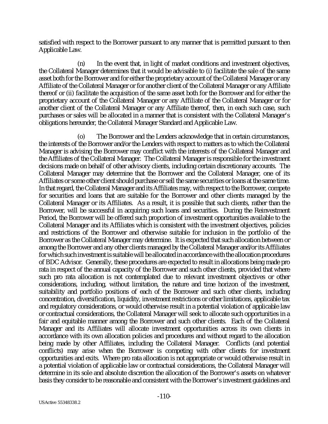 satisfied with respect to the Borrower pursuant to any manner that is permitted pursuant to then Applicable Law. (n) In the event that, in light of market conditions and investment objectives, the Collateral Manager determines that it would be advisable to (i) facilitate the sale of the same asset both for the Borrower and for either the proprietary account of the Collateral Manager or any Affiliate of the Collateral Manager or for another client of the Collateral Manager or any Affiliate thereof or (ii) facilitate the acquisition of the same asset both for the Borrower and for either the proprietary account of the Collateral Manager or any Affiliate of the Collateral Manager or for another client of the Collateral Manager or any Affiliate thereof, then, in each such case, such purchases or sales will be allocated in a manner that is consistent with the Collateral Manager’s obligations hereunder, the Collateral Manager Standard and Applicable Law. (o) The Borrower and the Lenders acknowledge that in certain circumstances, the interests of the Borrower and/or the Lenders with respect to matters as to which the Collateral Manager is advising the Borrower may conflict with the interests of the Collateral Manager and the Affiliates of the Collateral Manager. The Collateral Manager is responsible for the investment decisions made on behalf of other advisory clients, including certain discretionary accounts. The Collateral Manager may determine that the Borrower and the Collateral Manager, one of its Affiliates or some other client should purchase or sell the same securities or loans at the same time. In that regard, the Collateral Manager and its Affiliates may, with respect to the Borrower, compete for securities and loans that are suitable for the Borrower and other clients managed by the Collateral Manager or its Affiliates. As a result, it is possible that such clients, rather than the Borrower, will be successful in acquiring such loans and securities. During the Reinvestment Period, the Borrower will be offered such proportion of investment opportunities available to the Collateral Manager and its Affiliates which is consistent with the investment objectives, policies and restrictions of the Borrower and otherwise suitable for inclusion in the portfolio of the Borrower as the Collateral Manager may determine. It is expected that such allocation between or among the Borrower and any other clients managed by the Collateral Manager and/or its Affiliates for which such investment is suitable will be allocated in accordance with the allocation procedures of BDC Advisor. Generally, these procedures are expected to result in allocations being made pro rata in respect of the annual capacity of the Borrower and such other clients, provided that where such pro rata allocation is not contemplated due to relevant investment objectives or other considerations, including, without limitation, the nature and time horizon of the investment, suitability and portfolio positions of each of the Borrower and such other clients, including concentration, diversification, liquidity, investment restrictions or other limitations, applicable tax and regulatory considerations, or would otherwise result in a potential violation of applicable law or contractual considerations, the Collateral Manager will seek to allocate such opportunities in a fair and equitable manner among the Borrower and such other clients. Each of the Collateral Manager and its Affiliates will allocate investment opportunities across its own clients in accordance with its own allocation policies and procedures and without regard to the allocation being made by other Affiliates, including the Collateral Manager. Conflicts (and potential conflicts) may arise when the Borrower is competing with other clients for investment opportunities and exits. Where pro rata allocation is not appropriate or would otherwise result in a potential violation of applicable law or contractual considerations, the Collateral Manager will determine in its sole and absolute discretion the allocation of the Borrower’s assets on whatever basis they consider to be reasonable and consistent with the Borrower’s investment guidelines and -110- USActive 55348338.2