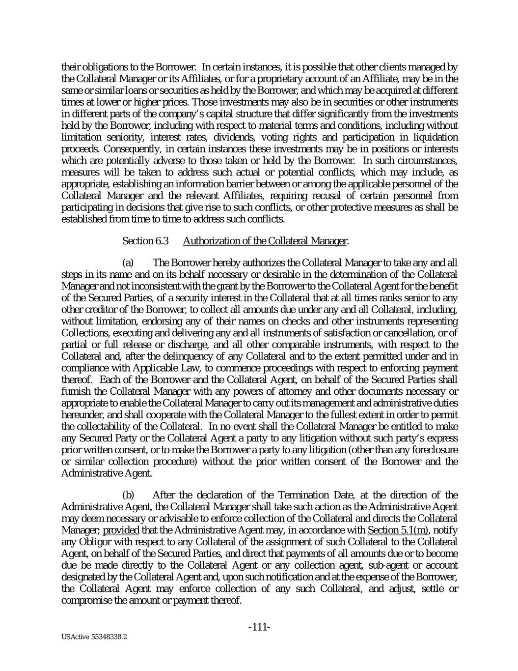 their obligations to the Borrower. In certain instances, it is possible that other clients managed by the Collateral Manager or its Affiliates, or for a proprietary account of an Affiliate, may be in the same or similar loans or securities as held by the Borrower, and which may be acquired at different times at lower or higher prices. Those investments may also be in securities or other instruments in different parts of the company’s capital structure that differ significantly from the investments held by the Borrower, including with respect to material terms and conditions, including without limitation seniority, interest rates, dividends, voting rights and participation in liquidation proceeds. Consequently, in certain instances these investments may be in positions or interests which are potentially adverse to those taken or held by the Borrower. In such circumstances, measures will be taken to address such actual or potential conflicts, which may include, as appropriate, establishing an information barrier between or among the applicable personnel of the Collateral Manager and the relevant Affiliates, requiring recusal of certain personnel from participating in decisions that give rise to such conflicts, or other protective measures as shall be established from time to time to address such conflicts. Section 6.3 Authorization of the Collateral Manager. (a) The Borrower hereby authorizes the Collateral Manager to take any and all steps in its name and on its behalf necessary or desirable in the determination of the Collateral Manager and not inconsistent with the grant by the Borrower to the Collateral Agent for the benefit of the Secured Parties, of a security interest in the Collateral that at all times ranks senior to any other creditor of the Borrower, to collect all amounts due under any and all Collateral, including, without limitation, endorsing any of their names on checks and other instruments representing Collections, executing and delivering any and all instruments of satisfaction or cancellation, or of partial or full release or discharge, and all other comparable instruments, with respect to the Collateral and, after the delinquency of any Collateral and to the extent permitted under and in compliance with Applicable Law, to commence proceedings with respect to enforcing payment thereof. Each of the Borrower and the Collateral Agent, on behalf of the Secured Parties shall furnish the Collateral Manager with any powers of attorney and other documents necessary or appropriate to enable the Collateral Manager to carry out its management and administrative duties hereunder, and shall cooperate with the Collateral Manager to the fullest extent in order to permit the collectability of the Collateral. In no event shall the Collateral Manager be entitled to make any Secured Party or the Collateral Agent a party to any litigation without such party’s express prior written consent, or to make the Borrower a party to any litigation (other than any foreclosure or similar collection procedure) without the prior written consent of the Borrower and the Administrative Agent. (b) After the declaration of the Termination Date, at the direction of the Administrative Agent, the Collateral Manager shall take such action as the Administrative Agent may deem necessary or advisable to enforce collection of the Collateral and directs the Collateral Manager; provided that the Administrative Agent may, in accordance with Section 5.1(m), notify any Obligor with respect to any Collateral of the assignment of such Collateral to the Collateral Agent, on behalf of the Secured Parties, and direct that payments of all amounts due or to become due be made directly to the Collateral Agent or any collection agent, sub-agent or account designated by the Collateral Agent and, upon such notification and at the expense of the Borrower, the Collateral Agent may enforce collection of any such Collateral, and adjust, settle or compromise the amount or payment thereof. -111- USActive 55348338.2