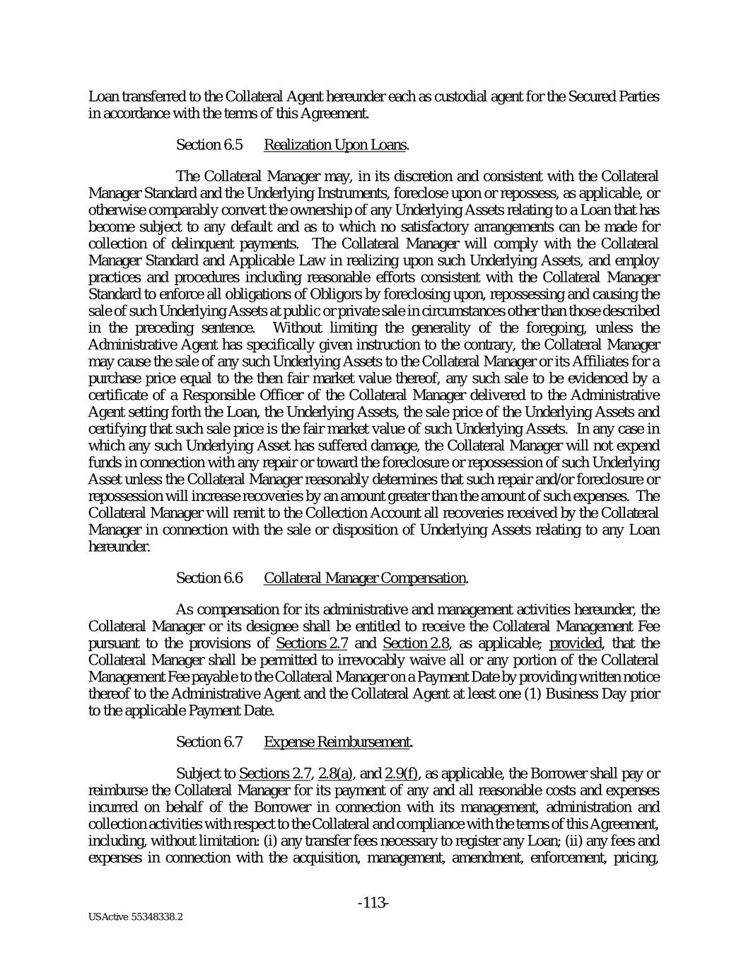 Loan transferred to the Collateral Agent hereunder each as custodial agent for the Secured Parties in accordance with the terms of this Agreement. Section 6.5 Realization Upon Loans. The Collateral Manager may, in its discretion and consistent with the Collateral Manager Standard and the Underlying Instruments, foreclose upon or repossess, as applicable, or otherwise comparably convert the ownership of any Underlying Assets relating to a Loan that has become subject to any default and as to which no satisfactory arrangements can be made for collection of delinquent payments. The Collateral Manager will comply with the Collateral Manager Standard and Applicable Law in realizing upon such Underlying Assets, and employ practices and procedures including reasonable efforts consistent with the Collateral Manager Standard to enforce all obligations of Obligors by foreclosing upon, repossessing and causing the sale of such Underlying Assets at public or private sale in circumstances other than those described in the preceding sentence. Without limiting the generality of the foregoing, unless the Administrative Agent has specifically given instruction to the contrary, the Collateral Manager may cause the sale of any such Underlying Assets to the Collateral Manager or its Affiliates for a purchase price equal to the then fair market value thereof, any such sale to be evidenced by a certificate of a Responsible Officer of the Collateral Manager delivered to the Administrative Agent setting forth the Loan, the Underlying Assets, the sale price of the Underlying Assets and certifying that such sale price is the fair market value of such Underlying Assets. In any case in which any such Underlying Asset has suffered damage, the Collateral Manager will not expend funds in connection with any repair or toward the foreclosure or repossession of such Underlying Asset unless the Collateral Manager reasonably determines that such repair and/or foreclosure or repossession will increase recoveries by an amount greater than the amount of such expenses. The Collateral Manager will remit to the Collection Account all recoveries received by the Collateral Manager in connection with the sale or disposition of Underlying Assets relating to any Loan hereunder. Section 6.6 Collateral Manager Compensation. As compensation for its administrative and management activities hereunder, the Collateral Manager or its designee shall be entitled to receive the Collateral Management Fee pursuant to the provisions of Sections 2.7 and Section 2.8, as applicable; provided, that the Collateral Manager shall be permitted to irrevocably waive all or any portion of the Collateral Management Fee payable to the Collateral Manager on a Payment Date by providing written notice thereof to the Administrative Agent and the Collateral Agent at least one (1) Business Day prior to the applicable Payment Date. Section 6.7 Expense Reimbursement. Subject to Sections 2.7, 2.8(a), and 2.9(f), as applicable, the Borrower shall pay or reimburse the Collateral Manager for its payment of any and all reasonable costs and expenses incurred on behalf of the Borrower in connection with its management, administration and collection activities with respect to the Collateral and compliance with the terms of this Agreement, including, without limitation: (i) any transfer fees necessary to register any Loan; (ii) any fees and expenses in connection with the acquisition, management, amendment, enforcement, pricing, -113- USActive 55348338.2
