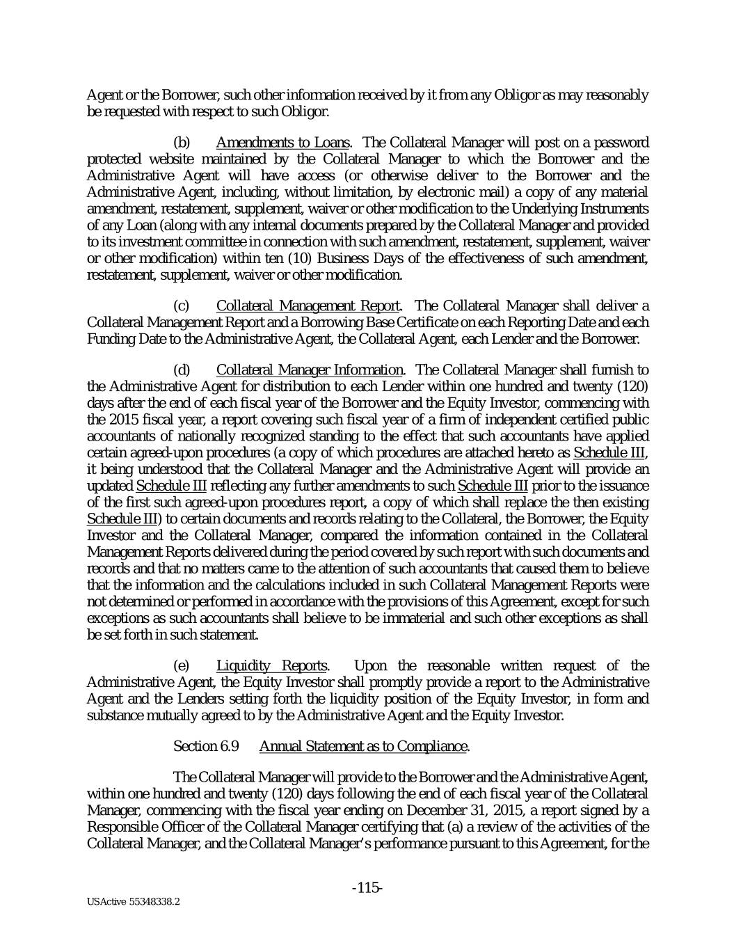 Agent or the Borrower, such other information received by it from any Obligor as may reasonably be requested with respect to such Obligor. (b) Amendments to Loans. The Collateral Manager will post on a password protected website maintained by the Collateral Manager to which the Borrower and the Administrative Agent will have access (or otherwise deliver to the Borrower and the Administrative Agent, including, without limitation, by electronic mail) a copy of any material amendment, restatement, supplement, waiver or other modification to the Underlying Instruments of any Loan (along with any internal documents prepared by the Collateral Manager and provided to its investment committee in connection with such amendment, restatement, supplement, waiver or other modification) within ten (10) Business Days of the effectiveness of such amendment, restatement, supplement, waiver or other modification. (c) Collateral Management Report. The Collateral Manager shall deliver a Collateral Management Report and a Borrowing Base Certificate on each Reporting Date and each Funding Date to the Administrative Agent, the Collateral Agent, each Lender and the Borrower. (d) Collateral Manager Information. The Collateral Manager shall furnish to the Administrative Agent for distribution to each Lender within one hundred and twenty (120) days after the end of each fiscal year of the Borrower and the Equity Investor, commencing with the 2015 fiscal year, a report covering such fiscal year of a firm of independent certified public accountants of nationally recognized standing to the effect that such accountants have applied certain agreed-upon procedures (a copy of which procedures are attached hereto as Schedule III, it being understood that the Collateral Manager and the Administrative Agent will provide an updated Schedule III reflecting any further amendments to such Schedule III prior to the issuance of the first such agreed-upon procedures report, a copy of which shall replace the then existing Schedule III) to certain documents and records relating to the Collateral, the Borrower, the Equity Investor and the Collateral Manager, compared the information contained in the Collateral Management Reports delivered during the period covered by such report with such documents and records and that no matters came to the attention of such accountants that caused them to believe that the information and the calculations included in such Collateral Management Reports were not determined or performed in accordance with the provisions of this Agreement, except for such exceptions as such accountants shall believe to be immaterial and such other exceptions as shall be set forth in such statement. (e) Liquidity Reports. Upon the reasonable written request of the Administrative Agent, the Equity Investor shall promptly provide a report to the Administrative Agent and the Lenders setting forth the liquidity position of the Equity Investor, in form and substance mutually agreed to by the Administrative Agent and the Equity Investor. Section 6.9 Annual Statement as to Compliance. The Collateral Manager will provide to the Borrower and the Administrative Agent, within one hundred and twenty (120) days following the end of each fiscal year of the Collateral Manager, commencing with the fiscal year ending on December 31, 2015, a report signed by a Responsible Officer of the Collateral Manager certifying that (a) a review of the activities of the Collateral Manager, and the Collateral Manager’s performance pursuant to this Agreement, for the -115- USActive 55348338.2
