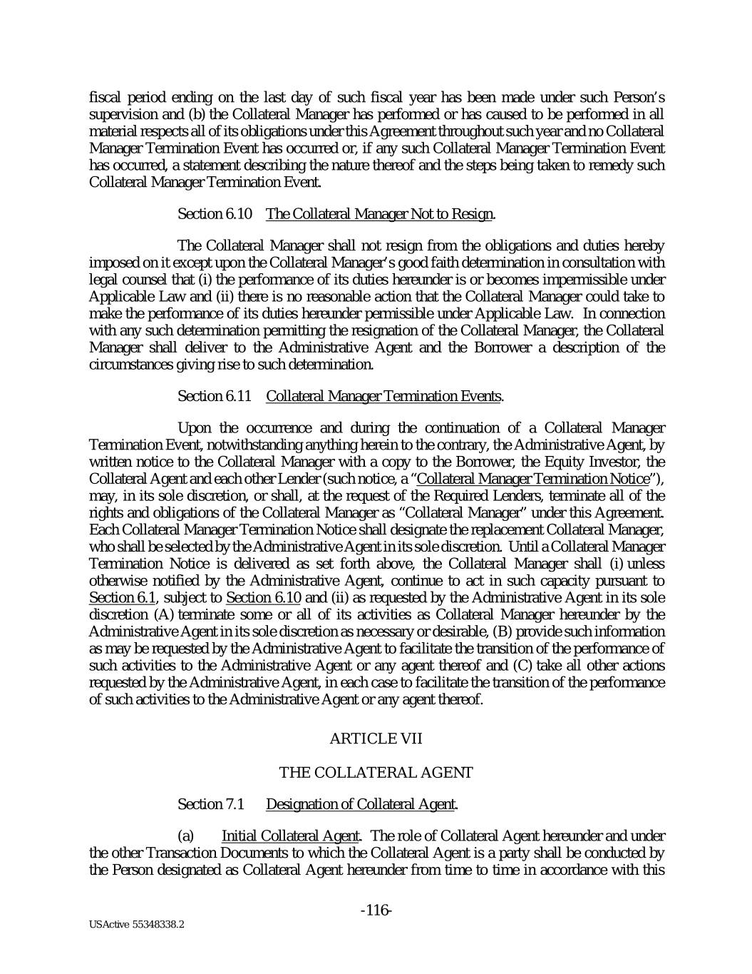 fiscal period ending on the last day of such fiscal year has been made under such Person’s supervision and (b) the Collateral Manager has performed or has caused to be performed in all material respects all of its obligations under this Agreement throughout such year and no Collateral Manager Termination Event has occurred or, if any such Collateral Manager Termination Event has occurred, a statement describing the nature thereof and the steps being taken to remedy such Collateral Manager Termination Event. Section 6.10 The Collateral Manager Not to Resign. The Collateral Manager shall not resign from the obligations and duties hereby imposed on it except upon the Collateral Manager’s good faith determination in consultation with legal counsel that (i) the performance of its duties hereunder is or becomes impermissible under Applicable Law and (ii) there is no reasonable action that the Collateral Manager could take to make the performance of its duties hereunder permissible under Applicable Law. In connection with any such determination permitting the resignation of the Collateral Manager, the Collateral Manager shall deliver to the Administrative Agent and the Borrower a description of the circumstances giving rise to such determination. Section 6.11 Collateral Manager Termination Events. Upon the occurrence and during the continuation of a Collateral Manager Termination Event, notwithstanding anything herein to the contrary, the Administrative Agent, by written notice to the Collateral Manager with a copy to the Borrower, the Equity Investor, the Collateral Agent and each other Lender (such notice, a “Collateral Manager Termination Notice”), may, in its sole discretion, or shall, at the request of the Required Lenders, terminate all of the rights and obligations of the Collateral Manager as “Collateral Manager” under this Agreement. Each Collateral Manager Termination Notice shall designate the replacement Collateral Manager, who shall be selected by the Administrative Agent in its sole discretion. Until a Collateral Manager Termination Notice is delivered as set forth above, the Collateral Manager shall (i) unless otherwise notified by the Administrative Agent, continue to act in such capacity pursuant to Section 6.1, subject to Section 6.10 and (ii) as requested by the Administrative Agent in its sole discretion (A) terminate some or all of its activities as Collateral Manager hereunder by the Administrative Agent in its sole discretion as necessary or desirable, (B) provide such information as may be requested by the Administrative Agent to facilitate the transition of the performance of such activities to the Administrative Agent or any agent thereof and (C) take all other actions requested by the Administrative Agent, in each case to facilitate the transition of the performance of such activities to the Administrative Agent or any agent thereof. ARTICLE VII THE COLLATERAL AGENT Section 7.1 Designation of Collateral Agent. (a) Initial Collateral Agent. The role of Collateral Agent hereunder and under the other Transaction Documents to which the Collateral Agent is a party shall be conducted by the Person designated as Collateral Agent hereunder from time to time in accordance with this -116- USActive 55348338.2