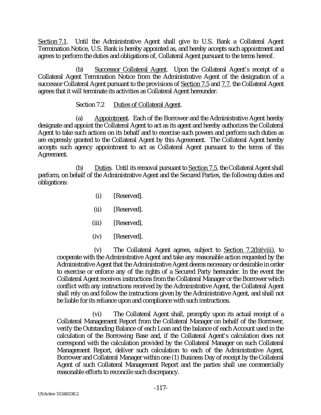 Section 7.1. Until the Administrative Agent shall give to U.S. Bank a Collateral Agent Termination Notice, U.S. Bank is hereby appointed as, and hereby accepts such appointment and agrees to perform the duties and obligations of, Collateral Agent pursuant to the terms hereof. (b) Successor Collateral Agent. Upon the Collateral Agent’s receipt of a Collateral Agent Termination Notice from the Administrative Agent of the designation of a successor Collateral Agent pursuant to the provisions of Section 7.5 and 7.7, the Collateral Agent agrees that it will terminate its activities as Collateral Agent hereunder. Section 7.2 Duties of Collateral Agent. (a) Appointment. Each of the Borrower and the Administrative Agent hereby designate and appoint the Collateral Agent to act as its agent and hereby authorizes the Collateral Agent to take such actions on its behalf and to exercise such powers and perform such duties as are expressly granted to the Collateral Agent by this Agreement. The Collateral Agent hereby accepts such agency appointment to act as Collateral Agent pursuant to the terms of this Agreement. (b) Duties. Until its removal pursuant to Section 7.5, the Collateral Agent shall perform, on behalf of the Administrative Agent and the Secured Parties, the following duties and obligations: (i) [Reserved]. (ii) [Reserved]. (iii) [Reserved]. (iv) [Reserved]. (v) The Collateral Agent agrees, subject to Section 7.2(b)(viii), to cooperate with the Administrative Agent and take any reasonable action requested by the Administrative Agent that the Administrative Agent deems necessary or desirable in order to exercise or enforce any of the rights of a Secured Party hereunder. In the event the Collateral Agent receives instructions from the Collateral Manager or the Borrower which conflict with any instructions received by the Administrative Agent, the Collateral Agent shall rely on and follow the instructions given by the Administrative Agent, and shall not be liable for its reliance upon and compliance with such instructions. (vi) The Collateral Agent shall, promptly upon its actual receipt of a Collateral Management Report from the Collateral Manager on behalf of the Borrower, verify the Outstanding Balance of each Loan and the balance of each Account used in the calculation of the Borrowing Base and, if the Collateral Agent’s calculation does not correspond with the calculation provided by the Collateral Manager on such Collateral Management Report, deliver such calculation to each of the Administrative Agent, Borrower and Collateral Manager within one (1) Business Day of receipt by the Collateral Agent of such Collateral Management Report and the parties shall use commercially reasonable efforts to reconcile such discrepancy. -117- USActive 55348338.2