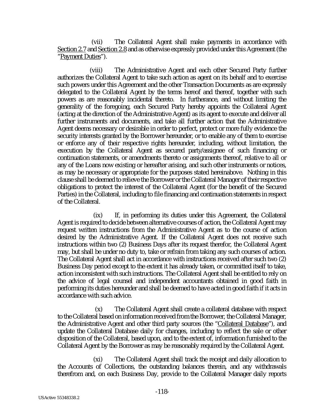 (vii) The Collateral Agent shall make payments in accordance with Section 2.7 and Section 2.8 and as otherwise expressly provided under this Agreement (the “Payment Duties”). (viii) The Administrative Agent and each other Secured Party further authorizes the Collateral Agent to take such action as agent on its behalf and to exercise such powers under this Agreement and the other Transaction Documents as are expressly delegated to the Collateral Agent by the terms hereof and thereof, together with such powers as are reasonably incidental thereto. In furtherance, and without limiting the generality of the foregoing, each Secured Party hereby appoints the Collateral Agent (acting at the direction of the Administrative Agent) as its agent to execute and deliver all further instruments and documents, and take all further action that the Administrative Agent deems necessary or desirable in order to perfect, protect or more fully evidence the security interests granted by the Borrower hereunder, or to enable any of them to exercise or enforce any of their respective rights hereunder, including, without limitation, the execution by the Collateral Agent as secured party/assignee of such financing or continuation statements, or amendments thereto or assignments thereof, relative to all or any of the Loans now existing or hereafter arising, and such other instruments or notices, as may be necessary or appropriate for the purposes stated hereinabove. Nothing in this clause shall be deemed to relieve the Borrower or the Collateral Manager of their respective obligations to protect the interest of the Collateral Agent (for the benefit of the Secured Parties) in the Collateral, including to file financing and continuation statements in respect of the Collateral. (ix) If, in performing its duties under this Agreement, the Collateral Agent is required to decide between alternative courses of action, the Collateral Agent may request written instructions from the Administrative Agent as to the course of action desired by the Administrative Agent. If the Collateral Agent does not receive such instructions within two (2) Business Days after its request therefor, the Collateral Agent may, but shall be under no duty to, take or refrain from taking any such courses of action. The Collateral Agent shall act in accordance with instructions received after such two (2) Business Day period except to the extent it has already taken, or committed itself to take, action inconsistent with such instructions. The Collateral Agent shall be entitled to rely on the advice of legal counsel and independent accountants obtained in good faith in performing its duties hereunder and shall be deemed to have acted in good faith if it acts in accordance with such advice. (x) The Collateral Agent shall create a collateral database with respect to the Collateral based on information received from the Borrower, the Collateral Manager, the Administrative Agent and other third party sources (the “Collateral Database”), and update the Collateral Database daily for changes, including to reflect the sale or other disposition of the Collateral, based upon, and to the extent of, information furnished to the Collateral Agent by the Borrower as may be reasonably required by the Collateral Agent. (xi) The Collateral Agent shall track the receipt and daily allocation to the Accounts of Collections, the outstanding balances therein, and any withdrawals therefrom and, on each Business Day, provide to the Collateral Manager daily reports -118- USActive 55348338.2
