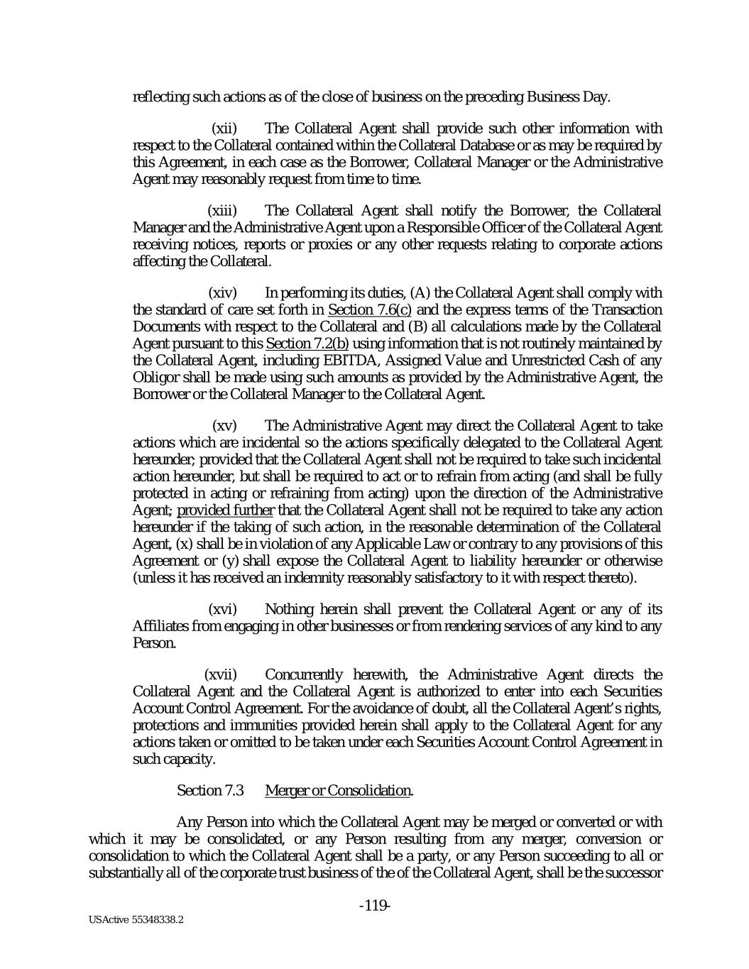 reflecting such actions as of the close of business on the preceding Business Day. (xii) The Collateral Agent shall provide such other information with respect to the Collateral contained within the Collateral Database or as may be required by this Agreement, in each case as the Borrower, Collateral Manager or the Administrative Agent may reasonably request from time to time. (xiii) The Collateral Agent shall notify the Borrower, the Collateral Manager and the Administrative Agent upon a Responsible Officer of the Collateral Agent receiving notices, reports or proxies or any other requests relating to corporate actions affecting the Collateral. (xiv) In performing its duties, (A) the Collateral Agent shall comply with the standard of care set forth in Section 7.6(c) and the express terms of the Transaction Documents with respect to the Collateral and (B) all calculations made by the Collateral Agent pursuant to this Section 7.2(b) using information that is not routinely maintained by the Collateral Agent, including EBITDA, Assigned Value and Unrestricted Cash of any Obligor shall be made using such amounts as provided by the Administrative Agent, the Borrower or the Collateral Manager to the Collateral Agent. (xv) The Administrative Agent may direct the Collateral Agent to take actions which are incidental so the actions specifically delegated to the Collateral Agent hereunder; provided that the Collateral Agent shall not be required to take such incidental action hereunder, but shall be required to act or to refrain from acting (and shall be fully protected in acting or refraining from acting) upon the direction of the Administrative Agent; provided further that the Collateral Agent shall not be required to take any action hereunder if the taking of such action, in the reasonable determination of the Collateral Agent, (x) shall be in violation of any Applicable Law or contrary to any provisions of this Agreement or (y) shall expose the Collateral Agent to liability hereunder or otherwise (unless it has received an indemnity reasonably satisfactory to it with respect thereto). (xvi) Nothing herein shall prevent the Collateral Agent or any of its Affiliates from engaging in other businesses or from rendering services of any kind to any Person. (xvii) Concurrently herewith, the Administrative Agent directs the Collateral Agent and the Collateral Agent is authorized to enter into each Securities Account Control Agreement. For the avoidance of doubt, all the Collateral Agent’s rights, protections and immunities provided herein shall apply to the Collateral Agent for any actions taken or omitted to be taken under each Securities Account Control Agreement in such capacity. Section 7.3 Merger or Consolidation. Any Person into which the Collateral Agent may be merged or converted or with which it may be consolidated, or any Person resulting from any merger, conversion or consolidation to which the Collateral Agent shall be a party, or any Person succeeding to all or substantially all of the corporate trust business of the of the Collateral Agent, shall be the successor -119- USActive 55348338.2