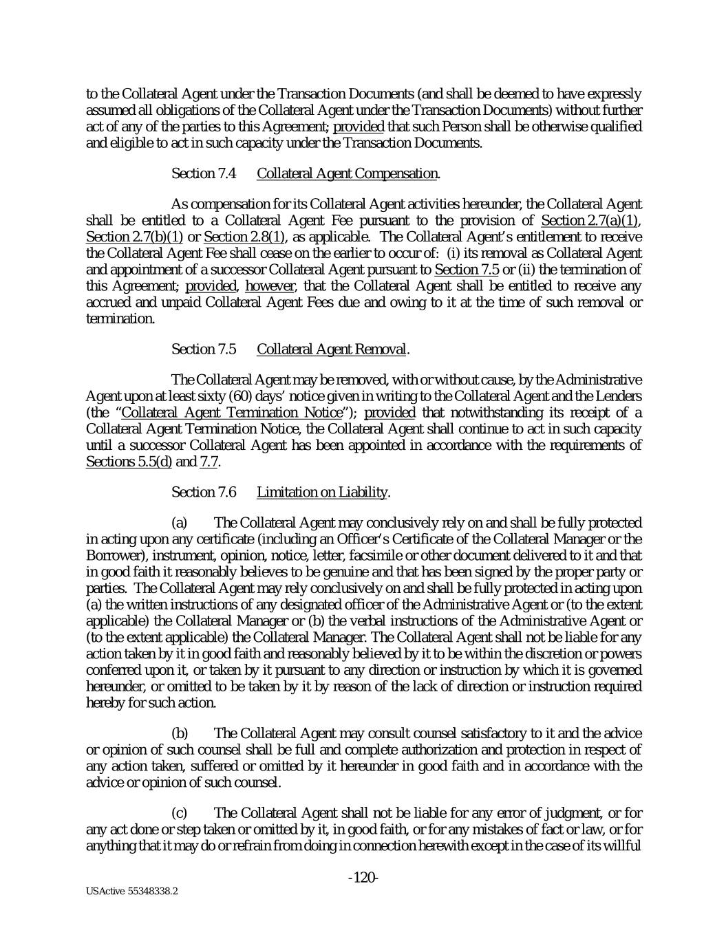 to the Collateral Agent under the Transaction Documents (and shall be deemed to have expressly assumed all obligations of the Collateral Agent under the Transaction Documents) without further act of any of the parties to this Agreement; provided that such Person shall be otherwise qualified and eligible to act in such capacity under the Transaction Documents. Section 7.4 Collateral Agent Compensation. As compensation for its Collateral Agent activities hereunder, the Collateral Agent shall be entitled to a Collateral Agent Fee pursuant to the provision of Section 2.7(a)(1), Section 2.7(b)(1) or Section 2.8(1), as applicable. The Collateral Agent’s entitlement to receive the Collateral Agent Fee shall cease on the earlier to occur of: (i) its removal as Collateral Agent and appointment of a successor Collateral Agent pursuant to Section 7.5 or (ii) the termination of this Agreement; provided, however, that the Collateral Agent shall be entitled to receive any accrued and unpaid Collateral Agent Fees due and owing to it at the time of such removal or termination. Section 7.5 Collateral Agent Removal. The Collateral Agent may be removed, with or without cause, by the Administrative Agent upon at least sixty (60) days’ notice given in writing to the Collateral Agent and the Lenders (the “Collateral Agent Termination Notice”); provided that notwithstanding its receipt of a Collateral Agent Termination Notice, the Collateral Agent shall continue to act in such capacity until a successor Collateral Agent has been appointed in accordance with the requirements of Sections 5.5(d) and 7.7. Section 7.6 Limitation on Liability. (a) The Collateral Agent may conclusively rely on and shall be fully protected in acting upon any certificate (including an Officer’s Certificate of the Collateral Manager or the Borrower), instrument, opinion, notice, letter, facsimile or other document delivered to it and that in good faith it reasonably believes to be genuine and that has been signed by the proper party or parties. The Collateral Agent may rely conclusively on and shall be fully protected in acting upon (a) the written instructions of any designated officer of the Administrative Agent or (to the extent applicable) the Collateral Manager or (b) the verbal instructions of the Administrative Agent or (to the extent applicable) the Collateral Manager. The Collateral Agent shall not be liable for any action taken by it in good faith and reasonably believed by it to be within the discretion or powers conferred upon it, or taken by it pursuant to any direction or instruction by which it is governed hereunder, or omitted to be taken by it by reason of the lack of direction or instruction required hereby for such action. (b) The Collateral Agent may consult counsel satisfactory to it and the advice or opinion of such counsel shall be full and complete authorization and protection in respect of any action taken, suffered or omitted by it hereunder in good faith and in accordance with the advice or opinion of such counsel. (c) The Collateral Agent shall not be liable for any error of judgment, or for any act done or step taken or omitted by it, in good faith, or for any mistakes of fact or law, or for anything that it may do or refrain from doing in connection herewith except in the case of its willful -120- USActive 55348338.2