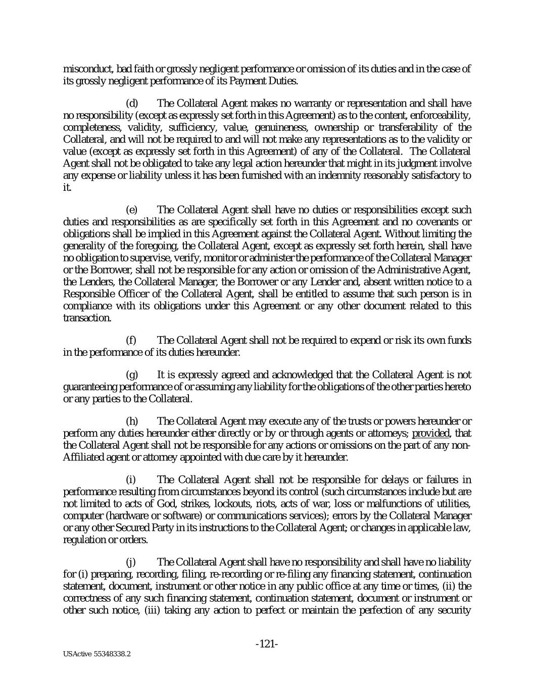 misconduct, bad faith or grossly negligent performance or omission of its duties and in the case of its grossly negligent performance of its Payment Duties. (d) The Collateral Agent makes no warranty or representation and shall have no responsibility (except as expressly set forth in this Agreement) as to the content, enforceability, completeness, validity, sufficiency, value, genuineness, ownership or transferability of the Collateral, and will not be required to and will not make any representations as to the validity or value (except as expressly set forth in this Agreement) of any of the Collateral. The Collateral Agent shall not be obligated to take any legal action hereunder that might in its judgment involve any expense or liability unless it has been furnished with an indemnity reasonably satisfactory to it. (e) The Collateral Agent shall have no duties or responsibilities except such duties and responsibilities as are specifically set forth in this Agreement and no covenants or obligations shall be implied in this Agreement against the Collateral Agent. Without limiting the generality of the foregoing, the Collateral Agent, except as expressly set forth herein, shall have no obligation to supervise, verify, monitor or administer the performance of the Collateral Manager or the Borrower, shall not be responsible for any action or omission of the Administrative Agent, the Lenders, the Collateral Manager, the Borrower or any Lender and, absent written notice to a Responsible Officer of the Collateral Agent, shall be entitled to assume that such person is in compliance with its obligations under this Agreement or any other document related to this transaction. (f) The Collateral Agent shall not be required to expend or risk its own funds in the performance of its duties hereunder. (g) It is expressly agreed and acknowledged that the Collateral Agent is not guaranteeing performance of or assuming any liability for the obligations of the other parties hereto or any parties to the Collateral. (h) The Collateral Agent may execute any of the trusts or powers hereunder or perform any duties hereunder either directly or by or through agents or attorneys; provided, that the Collateral Agent shall not be responsible for any actions or omissions on the part of any non- Affiliated agent or attorney appointed with due care by it hereunder. (i) The Collateral Agent shall not be responsible for delays or failures in performance resulting from circumstances beyond its control (such circumstances include but are not limited to acts of God, strikes, lockouts, riots, acts of war, loss or malfunctions of utilities, computer (hardware or software) or communications services); errors by the Collateral Manager or any other Secured Party in its instructions to the Collateral Agent; or changes in applicable law, regulation or orders. (j) The Collateral Agent shall have no responsibility and shall have no liability for (i) preparing, recording, filing, re-recording or re-filing any financing statement, continuation statement, document, instrument or other notice in any public office at any time or times, (ii) the correctness of any such financing statement, continuation statement, document or instrument or other such notice, (iii) taking any action to perfect or maintain the perfection of any security -121- USActive 55348338.2