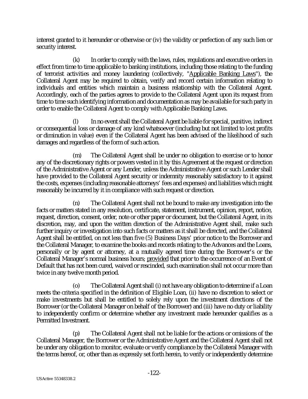 interest granted to it hereunder or otherwise or (iv) the validity or perfection of any such lien or security interest. (k) In order to comply with the laws, rules, regulations and executive orders in effect from time to time applicable to banking institutions, including those relating to the funding of terrorist activities and money laundering (collectively, "Applicable Banking Laws"), the Collateral Agent may be required to obtain, verify and record certain information relating to individuals and entities which maintain a business relationship with the Collateral Agent. Accordingly, each of the parties agrees to provide to the Collateral Agent upon its request from time to time such identifying information and documentation as may be available for such party in order to enable the Collateral Agent to comply with Applicable Banking Laws. (l) In no event shall the Collateral Agent be liable for special, punitive, indirect or consequential loss or damage of any kind whatsoever (including but not limited to lost profits or diminution in value) even if the Collateral Agent has been advised of the likelihood of such damages and regardless of the form of such action. (m) The Collateral Agent shall be under no obligation to exercise or to honor any of the discretionary rights or powers vested in it by this Agreement at the request or direction of the Administrative Agent or any Lender, unless the Administrative Agent or such Lender shall have provided to the Collateral Agent security or indemnity reasonably satisfactory to it against the costs, expenses (including reasonable attorneys’ fees and expenses) and liabilities which might reasonably be incurred by it in compliance with such request or direction. (n) The Collateral Agent shall not be bound to make any investigation into the facts or matters stated in any resolution, certificate, statement, instrument, opinion, report, notice, request, direction, consent, order, note or other paper or document, but the Collateral Agent, in its discretion, may, and upon the written direction of the Administrative Agent shall, make such further inquiry or investigation into such facts or matters as it shall be directed, and the Collateral Agent shall be entitled, on not less than five (5) Business Days’ prior notice to the Borrower and the Collateral Manager, to examine the books and records relating to the Advances and the Loans, personally or by agent or attorney, at a mutually agreed time during the Borrower’s or the Collateral Manager’s normal business hours; provided that prior to the occurrence of an Event of Default that has not been cured, waived or rescinded, such examination shall not occur more than twice in any twelve month period. (o) The Collateral Agent shall (i) not have any obligation to determine if a Loan meets the criteria specified in the definition of Eligible Loan, (ii) have no discretion to select or make investments but shall be entitled to solely rely upon the investment directions of the Borrower (or the Collateral Manager on behalf of the Borrower) and (iii) have no duty or liability to independently confirm or determine whether any investment made hereunder qualifies as a Permitted Investment. (p) The Collateral Agent shall not be liable for the actions or omissions of the Collateral Manager, the Borrower or the Administrative Agent and the Collateral Agent shall not be under any obligation to monitor, evaluate or verify compliance by the Collateral Manager with the terms hereof, or, other than as expressly set forth herein, to verify or independently determine -122- USActive 55348338.2