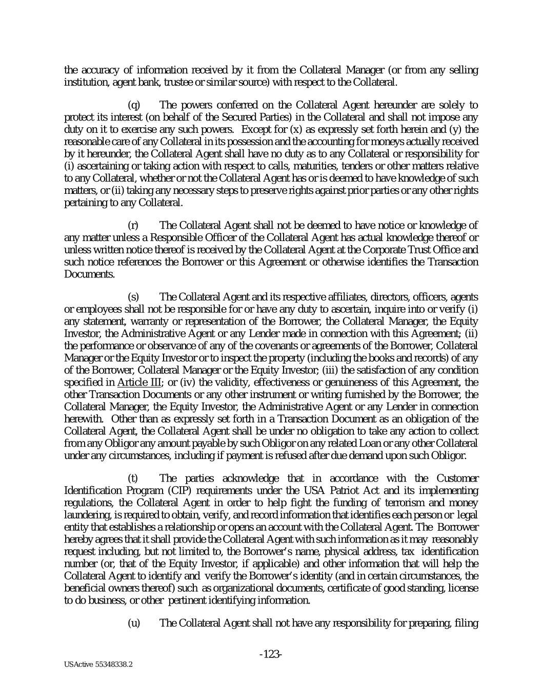 the accuracy of information received by it from the Collateral Manager (or from any selling institution, agent bank, trustee or similar source) with respect to the Collateral. (q) The powers conferred on the Collateral Agent hereunder are solely to protect its interest (on behalf of the Secured Parties) in the Collateral and shall not impose any duty on it to exercise any such powers. Except for (x) as expressly set forth herein and (y) the reasonable care of any Collateral in its possession and the accounting for moneys actually received by it hereunder, the Collateral Agent shall have no duty as to any Collateral or responsibility for (i) ascertaining or taking action with respect to calls, maturities, tenders or other matters relative to any Collateral, whether or not the Collateral Agent has or is deemed to have knowledge of such matters, or (ii) taking any necessary steps to preserve rights against prior parties or any other rights pertaining to any Collateral. (r) The Collateral Agent shall not be deemed to have notice or knowledge of any matter unless a Responsible Officer of the Collateral Agent has actual knowledge thereof or unless written notice thereof is received by the Collateral Agent at the Corporate Trust Office and such notice references the Borrower or this Agreement or otherwise identifies the Transaction Documents. (s) The Collateral Agent and its respective affiliates, directors, officers, agents or employees shall not be responsible for or have any duty to ascertain, inquire into or verify (i) any statement, warranty or representation of the Borrower, the Collateral Manager, the Equity Investor, the Administrative Agent or any Lender made in connection with this Agreement; (ii) the performance or observance of any of the covenants or agreements of the Borrower, Collateral Manager or the Equity Investor or to inspect the property (including the books and records) of any of the Borrower, Collateral Manager or the Equity Investor; (iii) the satisfaction of any condition specified in Article III; or (iv) the validity, effectiveness or genuineness of this Agreement, the other Transaction Documents or any other instrument or writing furnished by the Borrower, the Collateral Manager, the Equity Investor, the Administrative Agent or any Lender in connection herewith. Other than as expressly set forth in a Transaction Document as an obligation of the Collateral Agent, the Collateral Agent shall be under no obligation to take any action to collect from any Obligor any amount payable by such Obligor on any related Loan or any other Collateral under any circumstances, including if payment is refused after due demand upon such Obligor. (t) The parties acknowledge that in accordance with the Customer Identification Program (CIP) requirements under the USA Patriot Act and its implementing regulations, the Collateral Agent in order to help fight the funding of terrorism and money laundering, is required to obtain, verify, and record information that identifies each person or legal entity that establishes a relationship or opens an account with the Collateral Agent. The Borrower hereby agrees that it shall provide the Collateral Agent with such information as it may reasonably request including, but not limited to, the Borrower’s name, physical address, tax identification number (or, that of the Equity Investor, if applicable) and other information that will help the Collateral Agent to identify and verify the Borrower’s identity (and in certain circumstances, the beneficial owners thereof) such as organizational documents, certificate of good standing, license to do business, or other pertinent identifying information. (u) The Collateral Agent shall not have any responsibility for preparing, filing -123- USActive 55348338.2
