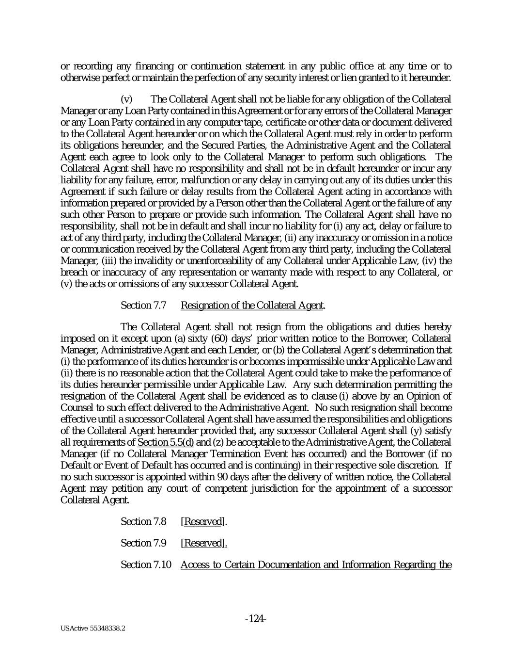 or recording any financing or continuation statement in any public office at any time or to otherwise perfect or maintain the perfection of any security interest or lien granted to it hereunder. (v) The Collateral Agent shall not be liable for any obligation of the Collateral Manager or any Loan Party contained in this Agreement or for any errors of the Collateral Manager or any Loan Party contained in any computer tape, certificate or other data or document delivered to the Collateral Agent hereunder or on which the Collateral Agent must rely in order to perform its obligations hereunder, and the Secured Parties, the Administrative Agent and the Collateral Agent each agree to look only to the Collateral Manager to perform such obligations. The Collateral Agent shall have no responsibility and shall not be in default hereunder or incur any liability for any failure, error, malfunction or any delay in carrying out any of its duties under this Agreement if such failure or delay results from the Collateral Agent acting in accordance with information prepared or provided by a Person other than the Collateral Agent or the failure of any such other Person to prepare or provide such information. The Collateral Agent shall have no responsibility, shall not be in default and shall incur no liability for (i) any act, delay or failure to act of any third party, including the Collateral Manager, (ii) any inaccuracy or omission in a notice or communication received by the Collateral Agent from any third party, including the Collateral Manager, (iii) the invalidity or unenforceability of any Collateral under Applicable Law, (iv) the breach or inaccuracy of any representation or warranty made with respect to any Collateral, or (v) the acts or omissions of any successor Collateral Agent. Section 7.7 Resignation of the Collateral Agent. The Collateral Agent shall not resign from the obligations and duties hereby imposed on it except upon (a) sixty (60) days’ prior written notice to the Borrower, Collateral Manager, Administrative Agent and each Lender, or (b) the Collateral Agent’s determination that (i) the performance of its duties hereunder is or becomes impermissible under Applicable Law and (ii) there is no reasonable action that the Collateral Agent could take to make the performance of its duties hereunder permissible under Applicable Law. Any such determination permitting the resignation of the Collateral Agent shall be evidenced as to clause (i) above by an Opinion of Counsel to such effect delivered to the Administrative Agent. No such resignation shall become effective until a successor Collateral Agent shall have assumed the responsibilities and obligations of the Collateral Agent hereunder provided that, any successor Collateral Agent shall (y) satisfy all requirements of Section 5.5(d) and (z) be acceptable to the Administrative Agent, the Collateral Manager (if no Collateral Manager Termination Event has occurred) and the Borrower (if no Default or Event of Default has occurred and is continuing) in their respective sole discretion. If no such successor is appointed within 90 days after the delivery of written notice, the Collateral Agent may petition any court of competent jurisdiction for the appointment of a successor Collateral Agent. Section 7.8 [Reserved]. Section 7.9 [Reserved]. Section 7.10 Access to Certain Documentation and Information Regarding the -124- USActive 55348338.2