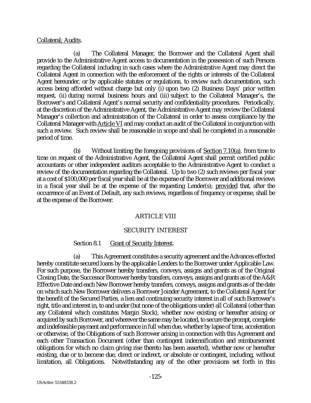 Collateral; Audits. (a) The Collateral Manager, the Borrower and the Collateral Agent shall provide to the Administrative Agent access to documentation in the possession of such Persons regarding the Collateral including in such cases where the Administrative Agent may direct the Collateral Agent in connection with the enforcement of the rights or interests of the Collateral Agent hereunder, or by applicable statutes or regulations, to review such documentation, such access being afforded without charge but only (i) upon two (2) Business Days’ prior written request, (ii) during normal business hours and (iii) subject to the Collateral Manager’s, the Borrower’s and Collateral Agent’s normal security and confidentiality procedures. Periodically, at the discretion of the Administrative Agent, the Administrative Agent may review the Collateral Manager’s collection and administration of the Collateral in order to assess compliance by the Collateral Manager with Article VI and may conduct an audit of the Collateral in conjunction with such a review. Such review shall be reasonable in scope and shall be completed in a reasonable period of time. (b) Without limiting the foregoing provisions of Section 7.10(a), from time to time on request of the Administrative Agent, the Collateral Agent shall permit certified public accountants or other independent auditors acceptable to the Administrative Agent to conduct a review of the documentation regarding the Collateral. Up to two (2) such reviews per fiscal year at a cost of $100,000 per fiscal year shall be at the expense of the Borrower and additional reviews in a fiscal year shall be at the expense of the requesting Lender(s); provided that, after the occurrence of an Event of Default, any such reviews, regardless of frequency or expense, shall be at the expense of the Borrower. ARTICLE VIII SECURITY INTEREST Section 8.1 Grant of Security Interest. (a) This Agreement constitutes a security agreement and the Advances effected hereby constitute secured loans by the applicable Lenders to the Borrower under Applicable Law. For such purpose, the Borrower hereby transfers, conveys, assigns and grants as of the Original Closing Date, the Successor Borrower hereby transfers, conveys, assigns and grants as of the A&R Effective Date and each New Borrower hereby transfers, conveys, assigns and grants as of the date on which such New Borrower delivers a Borrower Joinder Agreement, to the Collateral Agent for the benefit of the Secured Parties, a lien and continuing security interest in all of such Borrower’s right, title and interest in, to and under (but none of the obligations under) all Collateral (other than any Collateral which constitutes Margin Stock), whether now existing or hereafter arising or acquired by such Borrower, and wherever the same may be located, to secure the prompt, complete and indefeasible payment and performance in full when due, whether by lapse of time, acceleration or otherwise, of the Obligations of such Borrower arising in connection with this Agreement and each other Transaction Document (other than contingent indemnification and reimbursement obligations for which no claim giving rise thereto has been asserted), whether now or hereafter existing, due or to become due, direct or indirect, or absolute or contingent, including, without limitation, all Obligations. Notwithstanding any of the other provisions set forth in this -125- USActive 55348338.2