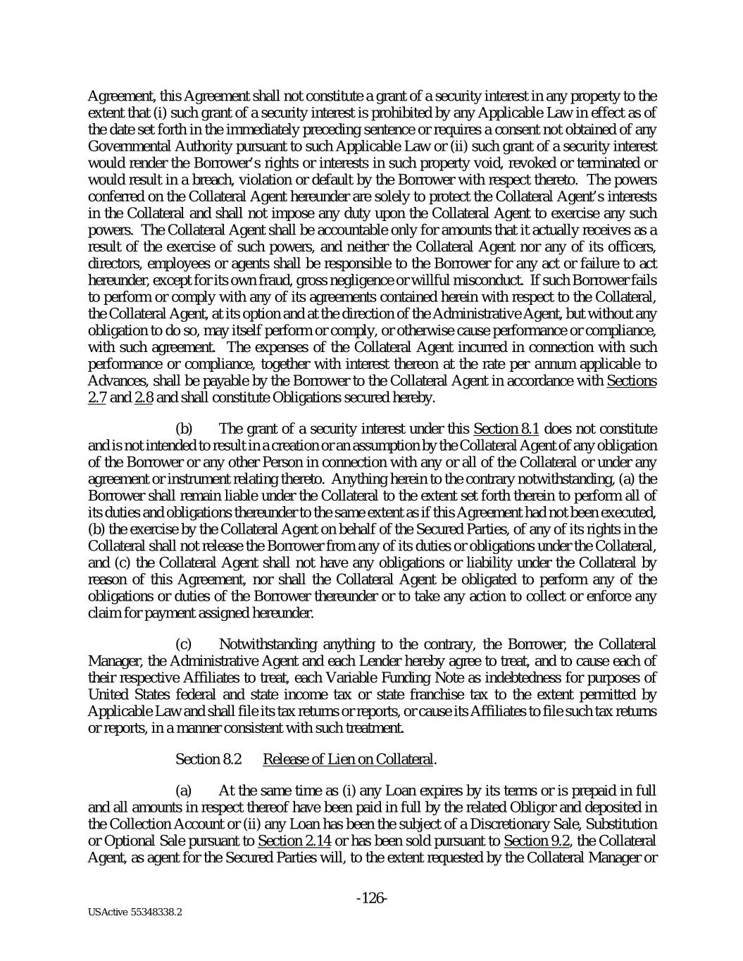 Agreement, this Agreement shall not constitute a grant of a security interest in any property to the extent that (i) such grant of a security interest is prohibited by any Applicable Law in effect as of the date set forth in the immediately preceding sentence or requires a consent not obtained of any Governmental Authority pursuant to such Applicable Law or (ii) such grant of a security interest would render the Borrower’s rights or interests in such property void, revoked or terminated or would result in a breach, violation or default by the Borrower with respect thereto. The powers conferred on the Collateral Agent hereunder are solely to protect the Collateral Agent’s interests in the Collateral and shall not impose any duty upon the Collateral Agent to exercise any such powers. The Collateral Agent shall be accountable only for amounts that it actually receives as a result of the exercise of such powers, and neither the Collateral Agent nor any of its officers, directors, employees or agents shall be responsible to the Borrower for any act or failure to act hereunder, except for its own fraud, gross negligence or willful misconduct. If such Borrower fails to perform or comply with any of its agreements contained herein with respect to the Collateral, the Collateral Agent, at its option and at the direction of the Administrative Agent, but without any obligation to do so, may itself perform or comply, or otherwise cause performance or compliance, with such agreement. The expenses of the Collateral Agent incurred in connection with such performance or compliance, together with interest thereon at the rate per annum applicable to Advances, shall be payable by the Borrower to the Collateral Agent in accordance with Sections 2.7 and 2.8 and shall constitute Obligations secured hereby. (b) The grant of a security interest under this Section 8.1 does not constitute and is not intended to result in a creation or an assumption by the Collateral Agent of any obligation of the Borrower or any other Person in connection with any or all of the Collateral or under any agreement or instrument relating thereto. Anything herein to the contrary notwithstanding, (a) the Borrower shall remain liable under the Collateral to the extent set forth therein to perform all of its duties and obligations thereunder to the same extent as if this Agreement had not been executed, (b) the exercise by the Collateral Agent on behalf of the Secured Parties, of any of its rights in the Collateral shall not release the Borrower from any of its duties or obligations under the Collateral, and (c) the Collateral Agent shall not have any obligations or liability under the Collateral by reason of this Agreement, nor shall the Collateral Agent be obligated to perform any of the obligations or duties of the Borrower thereunder or to take any action to collect or enforce any claim for payment assigned hereunder. (c) Notwithstanding anything to the contrary, the Borrower, the Collateral Manager, the Administrative Agent and each Lender hereby agree to treat, and to cause each of their respective Affiliates to treat, each Variable Funding Note as indebtedness for purposes of United States federal and state income tax or state franchise tax to the extent permitted by Applicable Law and shall file its tax returns or reports, or cause its Affiliates to file such tax returns or reports, in a manner consistent with such treatment. Section 8.2 Release of Lien on Collateral. (a) At the same time as (i) any Loan expires by its terms or is prepaid in full and all amounts in respect thereof have been paid in full by the related Obligor and deposited in the Collection Account or (ii) any Loan has been the subject of a Discretionary Sale, Substitution or Optional Sale pursuant to Section 2.14 or has been sold pursuant to Section 9.2, the Collateral Agent, as agent for the Secured Parties will, to the extent requested by the Collateral Manager or -126- USActive 55348338.2