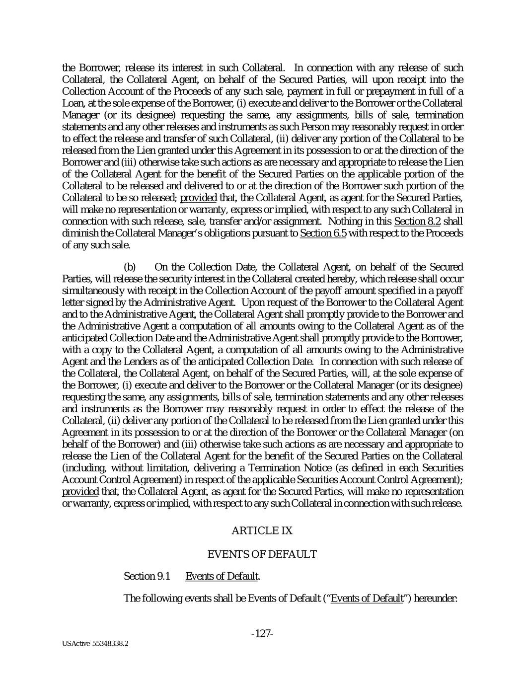 the Borrower, release its interest in such Collateral. In connection with any release of such Collateral, the Collateral Agent, on behalf of the Secured Parties, will upon receipt into the Collection Account of the Proceeds of any such sale, payment in full or prepayment in full of a Loan, at the sole expense of the Borrower, (i) execute and deliver to the Borrower or the Collateral Manager (or its designee) requesting the same, any assignments, bills of sale, termination statements and any other releases and instruments as such Person may reasonably request in order to effect the release and transfer of such Collateral, (ii) deliver any portion of the Collateral to be released from the Lien granted under this Agreement in its possession to or at the direction of the Borrower and (iii) otherwise take such actions as are necessary and appropriate to release the Lien of the Collateral Agent for the benefit of the Secured Parties on the applicable portion of the Collateral to be released and delivered to or at the direction of the Borrower such portion of the Collateral to be so released; provided that, the Collateral Agent, as agent for the Secured Parties, will make no representation or warranty, express or implied, with respect to any such Collateral in connection with such release, sale, transfer and/or assignment. Nothing in this Section 8.2 shall diminish the Collateral Manager’s obligations pursuant to Section 6.5 with respect to the Proceeds of any such sale. (b) On the Collection Date, the Collateral Agent, on behalf of the Secured Parties, will release the security interest in the Collateral created hereby, which release shall occur simultaneously with receipt in the Collection Account of the payoff amount specified in a payoff letter signed by the Administrative Agent. Upon request of the Borrower to the Collateral Agent and to the Administrative Agent, the Collateral Agent shall promptly provide to the Borrower and the Administrative Agent a computation of all amounts owing to the Collateral Agent as of the anticipated Collection Date and the Administrative Agent shall promptly provide to the Borrower, with a copy to the Collateral Agent, a computation of all amounts owing to the Administrative Agent and the Lenders as of the anticipated Collection Date. In connection with such release of the Collateral, the Collateral Agent, on behalf of the Secured Parties, will, at the sole expense of the Borrower, (i) execute and deliver to the Borrower or the Collateral Manager (or its designee) requesting the same, any assignments, bills of sale, termination statements and any other releases and instruments as the Borrower may reasonably request in order to effect the release of the Collateral, (ii) deliver any portion of the Collateral to be released from the Lien granted under this Agreement in its possession to or at the direction of the Borrower or the Collateral Manager (on behalf of the Borrower) and (iii) otherwise take such actions as are necessary and appropriate to release the Lien of the Collateral Agent for the benefit of the Secured Parties on the Collateral (including, without limitation, delivering a Termination Notice (as defined in each Securities Account Control Agreement) in respect of the applicable Securities Account Control Agreement); provided that, the Collateral Agent, as agent for the Secured Parties, will make no representation or warranty, express or implied, with respect to any such Collateral in connection with such release. ARTICLE IX EVENTS OF DEFAULT Section 9.1 Events of Default. The following events shall be Events of Default (“Events of Default”) hereunder: -127- USActive 55348338.2