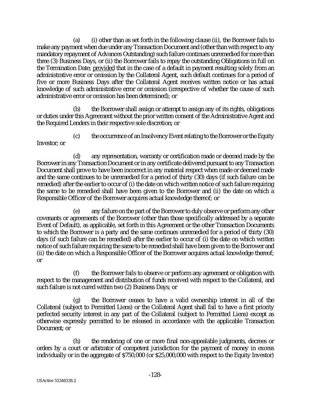 (a) (i) other than as set forth in the following clause (ii), the Borrower fails to make any payment when due under any Transaction Document and (other than with respect to any mandatory repayment of Advances Outstanding) such failure continues unremedied for more than three (3) Business Days, or (ii) the Borrower fails to repay the outstanding Obligations in full on the Termination Date; provided that in the case of a default in payment resulting solely from an administrative error or omission by the Collateral Agent, such default continues for a period of five or more Business Days after the Collateral Agent receives written notice or has actual knowledge of such administrative error or omission (irrespective of whether the cause of such administrative error or omission has been determined); or (b) the Borrower shall assign or attempt to assign any of its rights, obligations or duties under this Agreement without the prior written consent of the Administrative Agent and the Required Lenders in their respective sole discretion; or (c) the occurrence of an Insolvency Event relating to the Borrower or the Equity Investor; or (d) any representation, warranty or certification made or deemed made by the Borrower in any Transaction Document or in any certificate delivered pursuant to any Transaction Document shall prove to have been incorrect in any material respect when made or deemed made and the same continues to be unremedied for a period of thirty (30) days (if such failure can be remedied) after the earlier to occur of (i) the date on which written notice of such failure requiring the same to be remedied shall have been given to the Borrower and (ii) the date on which a Responsible Officer of the Borrower acquires actual knowledge thereof; or (e) any failure on the part of the Borrower to duly observe or perform any other covenants or agreements of the Borrower (other than those specifically addressed by a separate Event of Default), as applicable, set forth in this Agreement or the other Transaction Documents to which the Borrower is a party and the same continues unremedied for a period of thirty (30) days (if such failure can be remedied) after the earlier to occur of (i) the date on which written notice of such failure requiring the same to be remedied shall have been given to the Borrower and (ii) the date on which a Responsible Officer of the Borrower acquires actual knowledge thereof; or (f) the Borrower fails to observe or perform any agreement or obligation with respect to the management and distribution of funds received with respect to the Collateral, and such failure is not cured within two (2) Business Days; or (g) the Borrower ceases to have a valid ownership interest in all of the Collateral (subject to Permitted Liens) or the Collateral Agent shall fail to have a first priority perfected security interest in any part of the Collateral (subject to Permitted Liens) except as otherwise expressly permitted to be released in accordance with the applicable Transaction Document; or (h) the rendering of one or more final non-appealable judgments, decrees or orders by a court or arbitrator of competent jurisdiction for the payment of money in excess individually or in the aggregate of $750,000 (or $25,000,000 with respect to the Equity Investor) -128- USActive 55348338.2