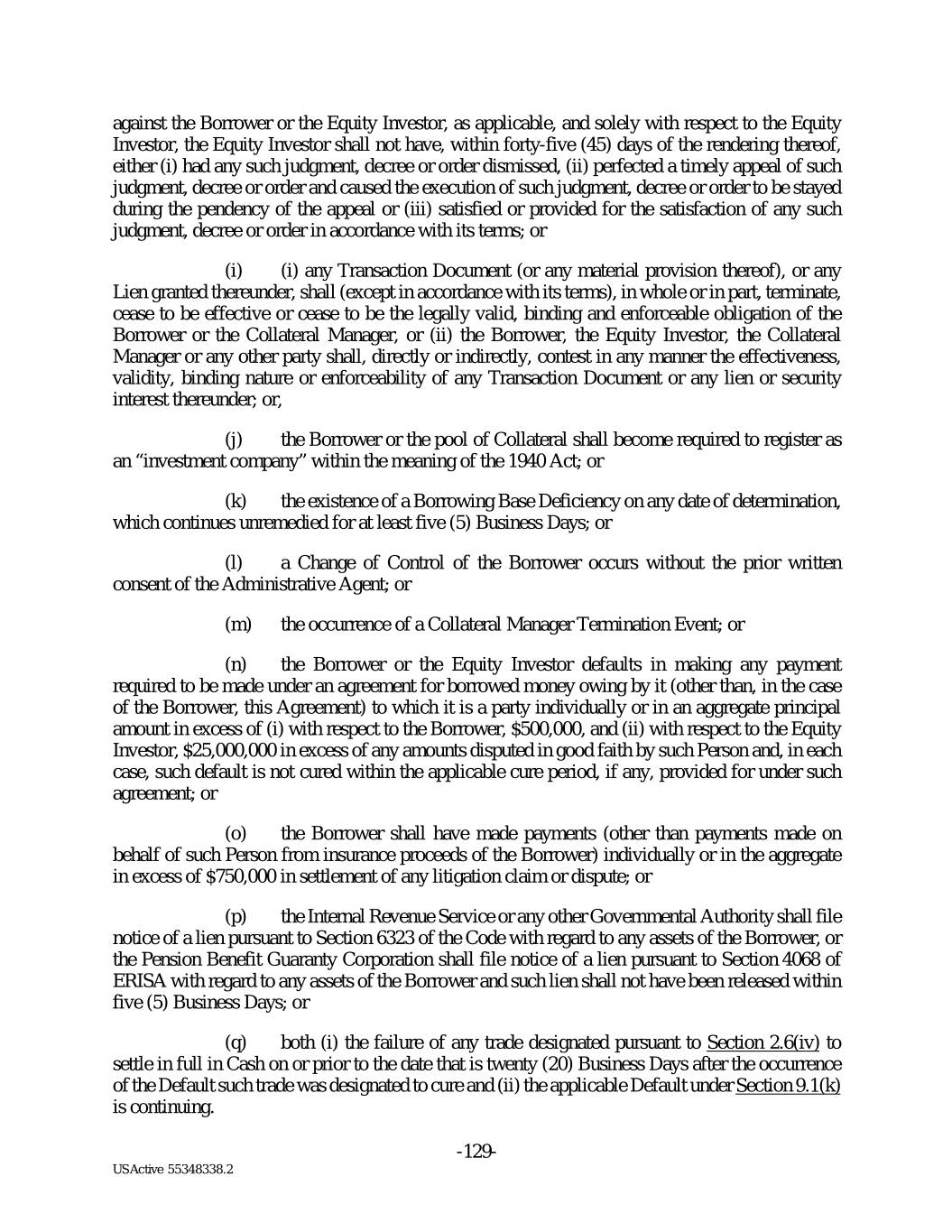 against the Borrower or the Equity Investor, as applicable, and solely with respect to the Equity Investor, the Equity Investor shall not have, within forty-five (45) days of the rendering thereof, either (i) had any such judgment, decree or order dismissed, (ii) perfected a timely appeal of such judgment, decree or order and caused the execution of such judgment, decree or order to be stayed during the pendency of the appeal or (iii) satisfied or provided for the satisfaction of any such judgment, decree or order in accordance with its terms; or (i) (i) any Transaction Document (or any material provision thereof), or any Lien granted thereunder, shall (except in accordance with its terms), in whole or in part, terminate, cease to be effective or cease to be the legally valid, binding and enforceable obligation of the Borrower or the Collateral Manager, or (ii) the Borrower, the Equity Investor, the Collateral Manager or any other party shall, directly or indirectly, contest in any manner the effectiveness, validity, binding nature or enforceability of any Transaction Document or any lien or security interest thereunder; or, (j) the Borrower or the pool of Collateral shall become required to register as an “investment company” within the meaning of the 1940 Act; or (k) the existence of a Borrowing Base Deficiency on any date of determination, which continues unremedied for at least five (5) Business Days; or (l) a Change of Control of the Borrower occurs without the prior written consent of the Administrative Agent; or (m) the occurrence of a Collateral Manager Termination Event; or (n) the Borrower or the Equity Investor defaults in making any payment required to be made under an agreement for borrowed money owing by it (other than, in the case of the Borrower, this Agreement) to which it is a party individually or in an aggregate principal amount in excess of (i) with respect to the Borrower, $500,000, and (ii) with respect to the Equity Investor, $25,000,000 in excess of any amounts disputed in good faith by such Person and, in each case, such default is not cured within the applicable cure period, if any, provided for under such agreement; or (o) the Borrower shall have made payments (other than payments made on behalf of such Person from insurance proceeds of the Borrower) individually or in the aggregate in excess of $750,000 in settlement of any litigation claim or dispute; or (p) the Internal Revenue Service or any other Governmental Authority shall file notice of a lien pursuant to Section 6323 of the Code with regard to any assets of the Borrower, or the Pension Benefit Guaranty Corporation shall file notice of a lien pursuant to Section 4068 of ERISA with regard to any assets of the Borrower and such lien shall not have been released within five (5) Business Days; or (q) both (i) the failure of any trade designated pursuant to Section 2.6(iv) to settle in full in Cash on or prior to the date that is twenty (20) Business Days after the occurrence of the Default such trade was designated to cure and (ii) the applicable Default under Section 9.1(k) is continuing. -129- USActive 55348338.2