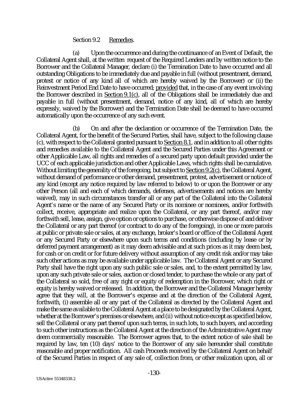 Section 9.2 Remedies. (a) Upon the occurrence and during the continuance of an Event of Default, the Collateral Agent shall, at the written request of the Required Lenders and by written notice to the Borrower and the Collateral Manager, declare (i) the Termination Date to have occurred and all outstanding Obligations to be immediately due and payable in full (without presentment, demand, protest or notice of any kind all of which are hereby waived by the Borrower) or (ii) the Reinvestment Period End Date to have occurred; provided that, in the case of any event involving the Borrower described in Section 9.1(c), all of the Obligations shall be immediately due and payable in full (without presentment, demand, notice of any kind, all of which are hereby expressly, waived by the Borrower) and the Termination Date shall be deemed to have occurred automatically upon the occurrence of any such event. (b) On and after the declaration or occurrence of the Termination Date, the Collateral Agent, for the benefit of the Secured Parties, shall have, subject to the following clause (c), with respect to the Collateral granted pursuant to Section 8.1, and in addition to all other rights and remedies available to the Collateral Agent and the Secured Parties under this Agreement or other Applicable Law, all rights and remedies of a secured party upon default provided under the UCC of each applicable jurisdiction and other Applicable Laws, which rights shall be cumulative. Without limiting the generality of the foregoing, but subject to Section 9.2(c), the Collateral Agent, without demand of performance or other demand, presentment, protest, advertisement or notice of any kind (except any notice required by law referred to below) to or upon the Borrower or any other Person (all and each of which demands, defenses, advertisements and notices are hereby waived), may in such circumstances transfer all or any part of the Collateral into the Collateral Agent’s name or the name of any Secured Party or its nominee or nominees, and/or forthwith collect, receive, appropriate and realize upon the Collateral, or any part thereof, and/or may forthwith sell, lease, assign, give option or options to purchase, or otherwise dispose of and deliver the Collateral or any part thereof (or contract to do any of the foregoing), in one or more parcels at public or private sale or sales, at any exchange, broker’s board or office of the Collateral Agent or any Secured Party or elsewhere upon such terms and conditions (including by lease or by deferred payment arrangement) as it may deem advisable and at such prices as it may deem best, for cash or on credit or for future delivery without assumption of any credit risk and/or may take such other actions as may be available under applicable law. The Collateral Agent or any Secured Party shall have the right upon any such public sale or sales, and, to the extent permitted by law, upon any such private sale or sales, auction or closed tender, to purchase the whole or any part of the Collateral so sold, free of any right or equity of redemption in the Borrower, which right or equity is hereby waived or released. In addition, the Borrower and the Collateral Manager hereby agree that they will, at the Borrower’s expense and at the direction of the Collateral Agent, forthwith, (i) assemble all or any part of the Collateral as directed by the Collateral Agent and make the same available to the Collateral Agent at a place to be designated by the Collateral Agent, whether at the Borrower’s premises or elsewhere, and (ii) without notice except as specified below, sell the Collateral or any part thereof upon such terms, in such lots, to such buyers, and according to such other instructions as the Collateral Agent at the direction of the Administrative Agent may deem commercially reasonable. The Borrower agrees that, to the extent notice of sale shall be required by law, ten (10) days’ notice to the Borrower of any sale hereunder shall constitute reasonable and proper notification. All cash Proceeds received by the Collateral Agent on behalf of the Secured Parties in respect of any sale of, collection from, or other realization upon, all or -130- USActive 55348338.2