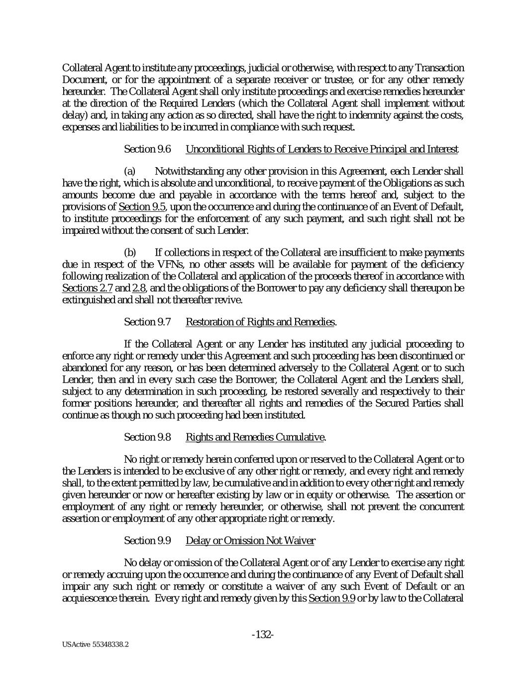 Collateral Agent to institute any proceedings, judicial or otherwise, with respect to any Transaction Document, or for the appointment of a separate receiver or trustee, or for any other remedy hereunder. The Collateral Agent shall only institute proceedings and exercise remedies hereunder at the direction of the Required Lenders (which the Collateral Agent shall implement without delay) and, in taking any action as so directed, shall have the right to indemnity against the costs, expenses and liabilities to be incurred in compliance with such request. Section 9.6 Unconditional Rights of Lenders to Receive Principal and Interest (a) Notwithstanding any other provision in this Agreement, each Lender shall have the right, which is absolute and unconditional, to receive payment of the Obligations as such amounts become due and payable in accordance with the terms hereof and, subject to the provisions of Section 9.5, upon the occurrence and during the continuance of an Event of Default, to institute proceedings for the enforcement of any such payment, and such right shall not be impaired without the consent of such Lender. (b) If collections in respect of the Collateral are insufficient to make payments due in respect of the VFNs, no other assets will be available for payment of the deficiency following realization of the Collateral and application of the proceeds thereof in accordance with Sections 2.7 and 2.8, and the obligations of the Borrower to pay any deficiency shall thereupon be extinguished and shall not thereafter revive. Section 9.7 Restoration of Rights and Remedies. If the Collateral Agent or any Lender has instituted any judicial proceeding to enforce any right or remedy under this Agreement and such proceeding has been discontinued or abandoned for any reason, or has been determined adversely to the Collateral Agent or to such Lender, then and in every such case the Borrower, the Collateral Agent and the Lenders shall, subject to any determination in such proceeding, be restored severally and respectively to their former positions hereunder, and thereafter all rights and remedies of the Secured Parties shall continue as though no such proceeding had been instituted. Section 9.8 Rights and Remedies Cumulative. No right or remedy herein conferred upon or reserved to the Collateral Agent or to the Lenders is intended to be exclusive of any other right or remedy, and every right and remedy shall, to the extent permitted by law, be cumulative and in addition to every other right and remedy given hereunder or now or hereafter existing by law or in equity or otherwise. The assertion or employment of any right or remedy hereunder, or otherwise, shall not prevent the concurrent assertion or employment of any other appropriate right or remedy. Section 9.9 Delay or Omission Not Waiver No delay or omission of the Collateral Agent or of any Lender to exercise any right or remedy accruing upon the occurrence and during the continuance of any Event of Default shall impair any such right or remedy or constitute a waiver of any such Event of Default or an acquiescence therein. Every right and remedy given by this Section 9.9 or by law to the Collateral -132- USActive 55348338.2
