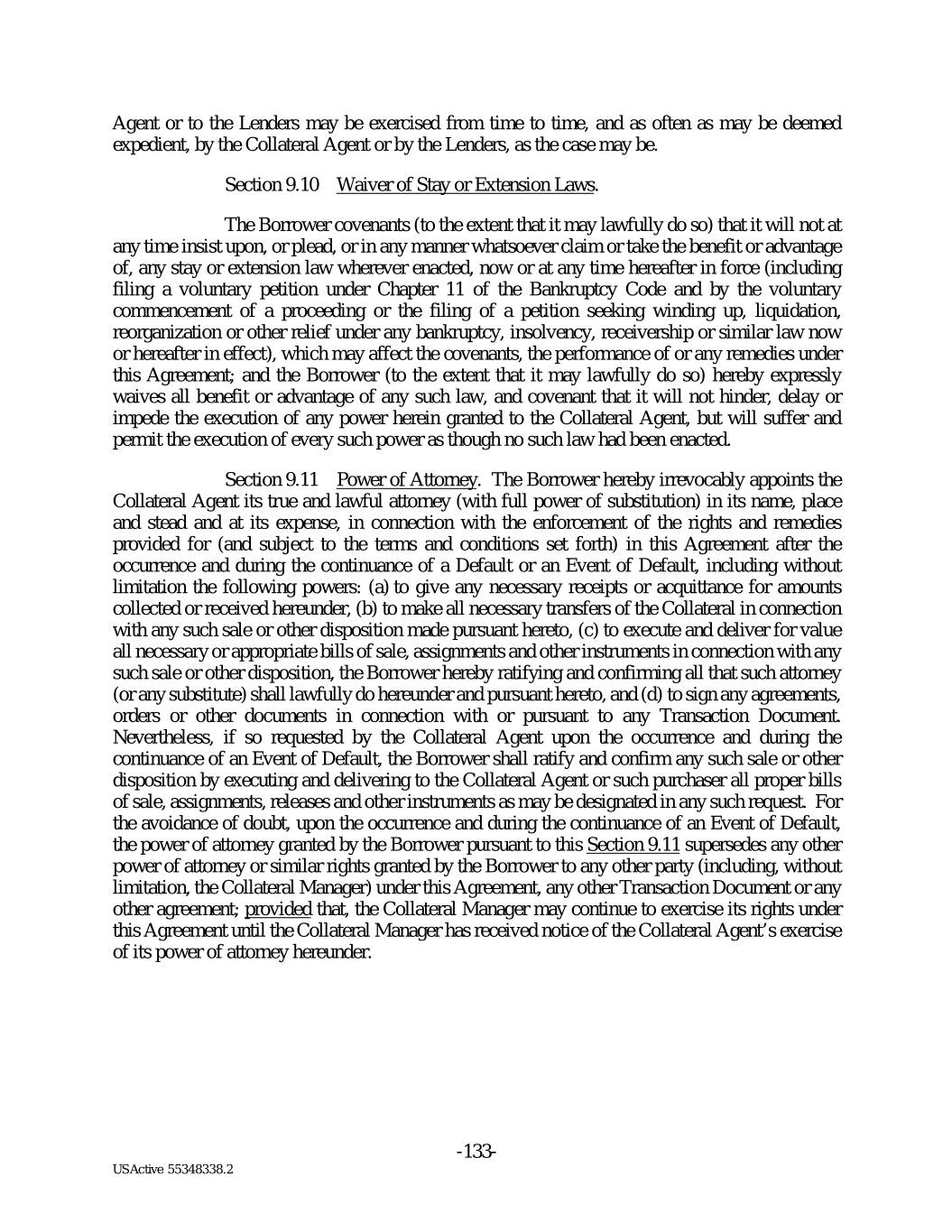 Agent or to the Lenders may be exercised from time to time, and as often as may be deemed expedient, by the Collateral Agent or by the Lenders, as the case may be. Section 9.10 Waiver of Stay or Extension Laws. The Borrower covenants (to the extent that it may lawfully do so) that it will not at any time insist upon, or plead, or in any manner whatsoever claim or take the benefit or advantage of, any stay or extension law wherever enacted, now or at any time hereafter in force (including filing a voluntary petition under Chapter 11 of the Bankruptcy Code and by the voluntary commencement of a proceeding or the filing of a petition seeking winding up, liquidation, reorganization or other relief under any bankruptcy, insolvency, receivership or similar law now or hereafter in effect), which may affect the covenants, the performance of or any remedies under this Agreement; and the Borrower (to the extent that it may lawfully do so) hereby expressly waives all benefit or advantage of any such law, and covenant that it will not hinder, delay or impede the execution of any power herein granted to the Collateral Agent, but will suffer and permit the execution of every such power as though no such law had been enacted. Section 9.11 Power of Attorney. The Borrower hereby irrevocably appoints the Collateral Agent its true and lawful attorney (with full power of substitution) in its name, place and stead and at its expense, in connection with the enforcement of the rights and remedies provided for (and subject to the terms and conditions set forth) in this Agreement after the occurrence and during the continuance of a Default or an Event of Default, including without limitation the following powers: (a) to give any necessary receipts or acquittance for amounts collected or received hereunder, (b) to make all necessary transfers of the Collateral in connection with any such sale or other disposition made pursuant hereto, (c) to execute and deliver for value all necessary or appropriate bills of sale, assignments and other instruments in connection with any such sale or other disposition, the Borrower hereby ratifying and confirming all that such attorney (or any substitute) shall lawfully do hereunder and pursuant hereto, and (d) to sign any agreements, orders or other documents in connection with or pursuant to any Transaction Document. Nevertheless, if so requested by the Collateral Agent upon the occurrence and during the continuance of an Event of Default, the Borrower shall ratify and confirm any such sale or other disposition by executing and delivering to the Collateral Agent or such purchaser all proper bills of sale, assignments, releases and other instruments as may be designated in any such request. For the avoidance of doubt, upon the occurrence and during the continuance of an Event of Default, the power of attorney granted by the Borrower pursuant to this Section 9.11 supersedes any other power of attorney or similar rights granted by the Borrower to any other party (including, without limitation, the Collateral Manager) under this Agreement, any other Transaction Document or any other agreement; provided that, the Collateral Manager may continue to exercise its rights under this Agreement until the Collateral Manager has received notice of the Collateral Agent’s exercise of its power of attorney hereunder. -133- USActive 55348338.2