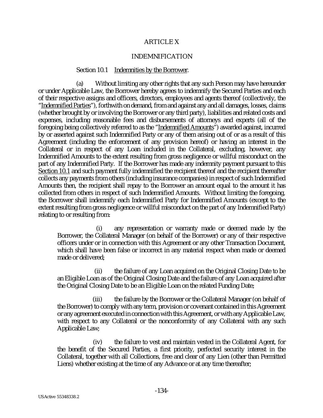 ARTICLE X INDEMNIFICATION Section 10.1 Indemnities by the Borrower. (a) Without limiting any other rights that any such Person may have hereunder or under Applicable Law, the Borrower hereby agrees to indemnify the Secured Parties and each of their respective assigns and officers, directors, employees and agents thereof (collectively, the “Indemnified Parties”), forthwith on demand, from and against any and all damages, losses, claims (whether brought by or involving the Borrower or any third party), liabilities and related costs and expenses, including reasonable fees and disbursements of attorneys and experts (all of the foregoing being collectively referred to as the “Indemnified Amounts”) awarded against, incurred by or asserted against such Indemnified Party or any of them arising out of or as a result of this Agreement (including the enforcement of any provision hereof) or having an interest in the Collateral or in respect of any Loan included in the Collateral, excluding, however, any Indemnified Amounts to the extent resulting from gross negligence or willful misconduct on the part of any Indemnified Party. If the Borrower has made any indemnity payment pursuant to this Section 10.1 and such payment fully indemnified the recipient thereof and the recipient thereafter collects any payments from others (including insurance companies) in respect of such Indemnified Amounts then, the recipient shall repay to the Borrower an amount equal to the amount it has collected from others in respect of such Indemnified Amounts. Without limiting the foregoing, the Borrower shall indemnify each Indemnified Party for Indemnified Amounts (except to the extent resulting from gross negligence or willful misconduct on the part of any Indemnified Party) relating to or resulting from: (i) any representation or warranty made or deemed made by the Borrower, the Collateral Manager (on behalf of the Borrower) or any of their respective officers under or in connection with this Agreement or any other Transaction Document, which shall have been false or incorrect in any material respect when made or deemed made or delivered; (ii) the failure of any Loan acquired on the Original Closing Date to be an Eligible Loan as of the Original Closing Date and the failure of any Loan acquired after the Original Closing Date to be an Eligible Loan on the related Funding Date; (iii) the failure by the Borrower or the Collateral Manager (on behalf of the Borrower) to comply with any term, provision or covenant contained in this Agreement or any agreement executed in connection with this Agreement, or with any Applicable Law, with respect to any Collateral or the nonconformity of any Collateral with any such Applicable Law; (iv) the failure to vest and maintain vested in the Collateral Agent, for the benefit of the Secured Parties, a first priority, perfected security interest in the Collateral, together with all Collections, free and clear of any Lien (other than Permitted Liens) whether existing at the time of any Advance or at any time thereafter; -134- USActive 55348338.2