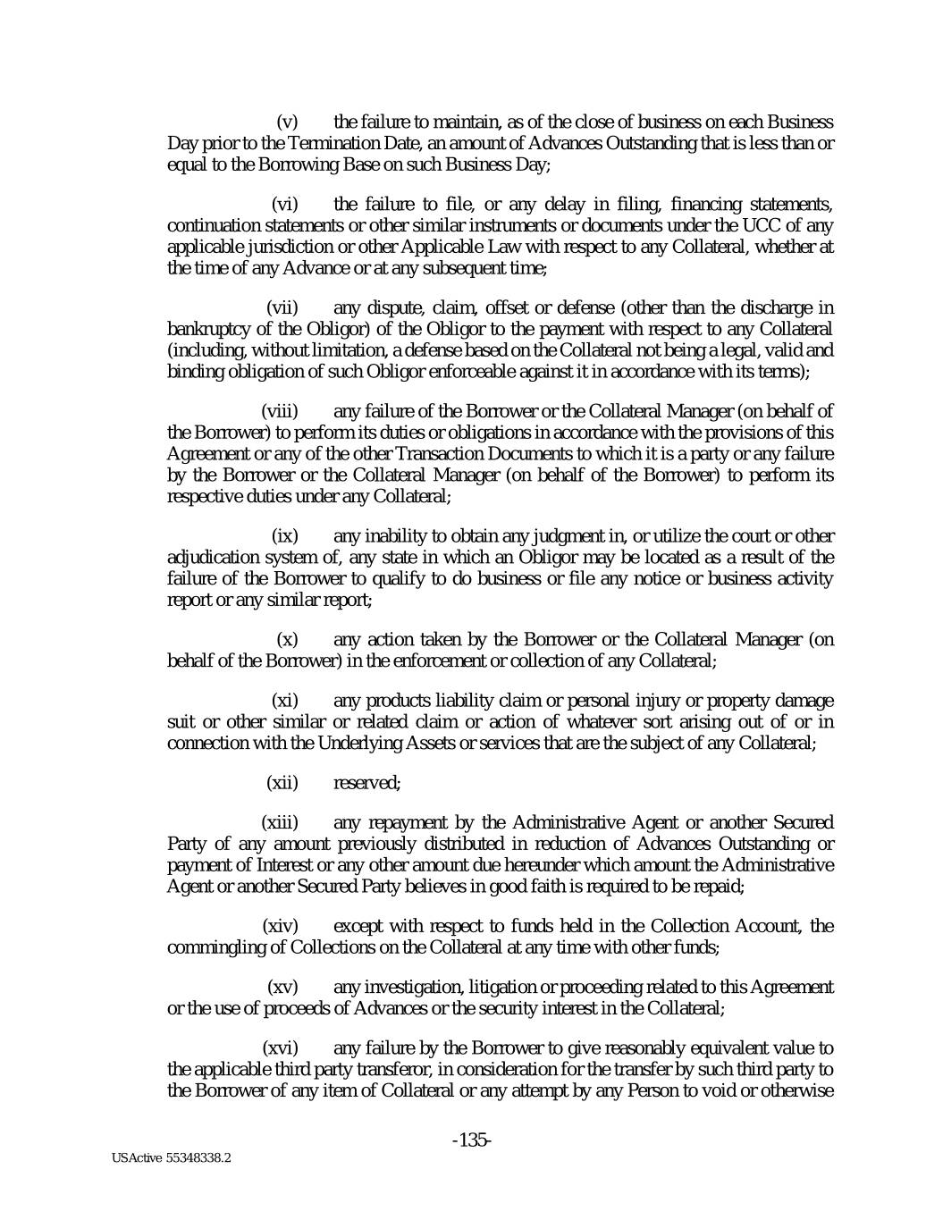 (v) the failure to maintain, as of the close of business on each Business Day prior to the Termination Date, an amount of Advances Outstanding that is less than or equal to the Borrowing Base on such Business Day; (vi) the failure to file, or any delay in filing, financing statements, continuation statements or other similar instruments or documents under the UCC of any applicable jurisdiction or other Applicable Law with respect to any Collateral, whether at the time of any Advance or at any subsequent time; (vii) any dispute, claim, offset or defense (other than the discharge in bankruptcy of the Obligor) of the Obligor to the payment with respect to any Collateral (including, without limitation, a defense based on the Collateral not being a legal, valid and binding obligation of such Obligor enforceable against it in accordance with its terms); (viii) any failure of the Borrower or the Collateral Manager (on behalf of the Borrower) to perform its duties or obligations in accordance with the provisions of this Agreement or any of the other Transaction Documents to which it is a party or any failure by the Borrower or the Collateral Manager (on behalf of the Borrower) to perform its respective duties under any Collateral; (ix) any inability to obtain any judgment in, or utilize the court or other adjudication system of, any state in which an Obligor may be located as a result of the failure of the Borrower to qualify to do business or file any notice or business activity report or any similar report; (x) any action taken by the Borrower or the Collateral Manager (on behalf of the Borrower) in the enforcement or collection of any Collateral; (xi) any products liability claim or personal injury or property damage suit or other similar or related claim or action of whatever sort arising out of or in connection with the Underlying Assets or services that are the subject of any Collateral; (xii) reserved; (xiii) any repayment by the Administrative Agent or another Secured Party of any amount previously distributed in reduction of Advances Outstanding or payment of Interest or any other amount due hereunder which amount the Administrative Agent or another Secured Party believes in good faith is required to be repaid; (xiv) except with respect to funds held in the Collection Account, the commingling of Collections on the Collateral at any time with other funds; (xv) any investigation, litigation or proceeding related to this Agreement or the use of proceeds of Advances or the security interest in the Collateral; (xvi) any failure by the Borrower to give reasonably equivalent value to the applicable third party transferor, in consideration for the transfer by such third party to the Borrower of any item of Collateral or any attempt by any Person to void or otherwise -135- USActive 55348338.2