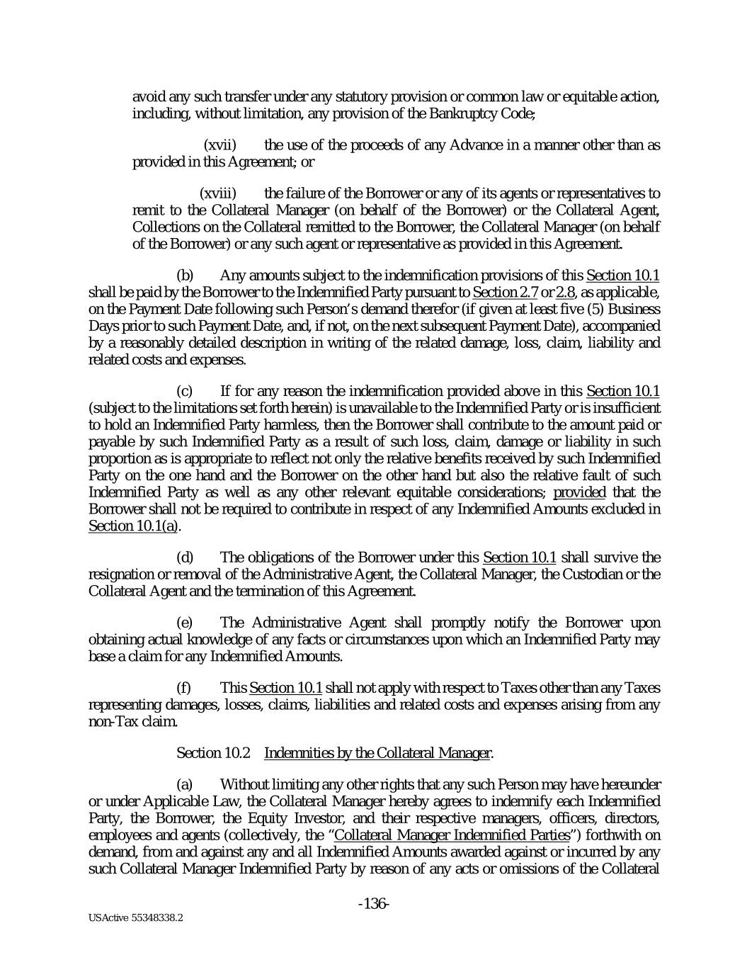 avoid any such transfer under any statutory provision or common law or equitable action, including, without limitation, any provision of the Bankruptcy Code; (xvii) the use of the proceeds of any Advance in a manner other than as provided in this Agreement; or (xviii) the failure of the Borrower or any of its agents or representatives to remit to the Collateral Manager (on behalf of the Borrower) or the Collateral Agent, Collections on the Collateral remitted to the Borrower, the Collateral Manager (on behalf of the Borrower) or any such agent or representative as provided in this Agreement. (b) Any amounts subject to the indemnification provisions of this Section 10.1 shall be paid by the Borrower to the Indemnified Party pursuant to Section 2.7 or 2.8, as applicable, on the Payment Date following such Person’s demand therefor (if given at least five (5) Business Days prior to such Payment Date, and, if not, on the next subsequent Payment Date), accompanied by a reasonably detailed description in writing of the related damage, loss, claim, liability and related costs and expenses. (c) If for any reason the indemnification provided above in this Section 10.1 (subject to the limitations set forth herein) is unavailable to the Indemnified Party or is insufficient to hold an Indemnified Party harmless, then the Borrower shall contribute to the amount paid or payable by such Indemnified Party as a result of such loss, claim, damage or liability in such proportion as is appropriate to reflect not only the relative benefits received by such Indemnified Party on the one hand and the Borrower on the other hand but also the relative fault of such Indemnified Party as well as any other relevant equitable considerations; provided that the Borrower shall not be required to contribute in respect of any Indemnified Amounts excluded in Section 10.1(a). (d) The obligations of the Borrower under this Section 10.1 shall survive the resignation or removal of the Administrative Agent, the Collateral Manager, the Custodian or the Collateral Agent and the termination of this Agreement. (e) The Administrative Agent shall promptly notify the Borrower upon obtaining actual knowledge of any facts or circumstances upon which an Indemnified Party may base a claim for any Indemnified Amounts. (f) This Section 10.1 shall not apply with respect to Taxes other than any Taxes representing damages, losses, claims, liabilities and related costs and expenses arising from any non-Tax claim. Section 10.2 Indemnities by the Collateral Manager. (a) Without limiting any other rights that any such Person may have hereunder or under Applicable Law, the Collateral Manager hereby agrees to indemnify each Indemnified Party, the Borrower, the Equity Investor, and their respective managers, officers, directors, employees and agents (collectively, the “Collateral Manager Indemnified Parties”) forthwith on demand, from and against any and all Indemnified Amounts awarded against or incurred by any such Collateral Manager Indemnified Party by reason of any acts or omissions of the Collateral -136- USActive 55348338.2