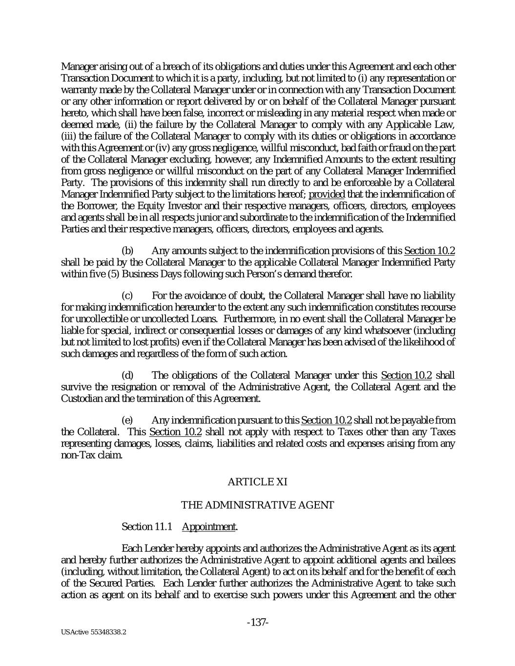 Manager arising out of a breach of its obligations and duties under this Agreement and each other Transaction Document to which it is a party, including, but not limited to (i) any representation or warranty made by the Collateral Manager under or in connection with any Transaction Document or any other information or report delivered by or on behalf of the Collateral Manager pursuant hereto, which shall have been false, incorrect or misleading in any material respect when made or deemed made, (ii) the failure by the Collateral Manager to comply with any Applicable Law, (iii) the failure of the Collateral Manager to comply with its duties or obligations in accordance with this Agreement or (iv) any gross negligence, willful misconduct, bad faith or fraud on the part of the Collateral Manager excluding, however, any Indemnified Amounts to the extent resulting from gross negligence or willful misconduct on the part of any Collateral Manager Indemnified Party. The provisions of this indemnity shall run directly to and be enforceable by a Collateral Manager Indemnified Party subject to the limitations hereof; provided that the indemnification of the Borrower, the Equity Investor and their respective managers, officers, directors, employees and agents shall be in all respects junior and subordinate to the indemnification of the Indemnified Parties and their respective managers, officers, directors, employees and agents. (b) Any amounts subject to the indemnification provisions of this Section 10.2 shall be paid by the Collateral Manager to the applicable Collateral Manager Indemnified Party within five (5) Business Days following such Person’s demand therefor. (c) For the avoidance of doubt, the Collateral Manager shall have no liability for making indemnification hereunder to the extent any such indemnification constitutes recourse for uncollectible or uncollected Loans. Furthermore, in no event shall the Collateral Manager be liable for special, indirect or consequential losses or damages of any kind whatsoever (including but not limited to lost profits) even if the Collateral Manager has been advised of the likelihood of such damages and regardless of the form of such action. (d) The obligations of the Collateral Manager under this Section 10.2 shall survive the resignation or removal of the Administrative Agent, the Collateral Agent and the Custodian and the termination of this Agreement. (e) Any indemnification pursuant to this Section 10.2 shall not be payable from the Collateral. This Section 10.2 shall not apply with respect to Taxes other than any Taxes representing damages, losses, claims, liabilities and related costs and expenses arising from any non-Tax claim. ARTICLE XI THE ADMINISTRATIVE AGENT Section 11.1 Appointment. Each Lender hereby appoints and authorizes the Administrative Agent as its agent and hereby further authorizes the Administrative Agent to appoint additional agents and bailees (including, without limitation, the Collateral Agent) to act on its behalf and for the benefit of each of the Secured Parties. Each Lender further authorizes the Administrative Agent to take such action as agent on its behalf and to exercise such powers under this Agreement and the other -137- USActive 55348338.2