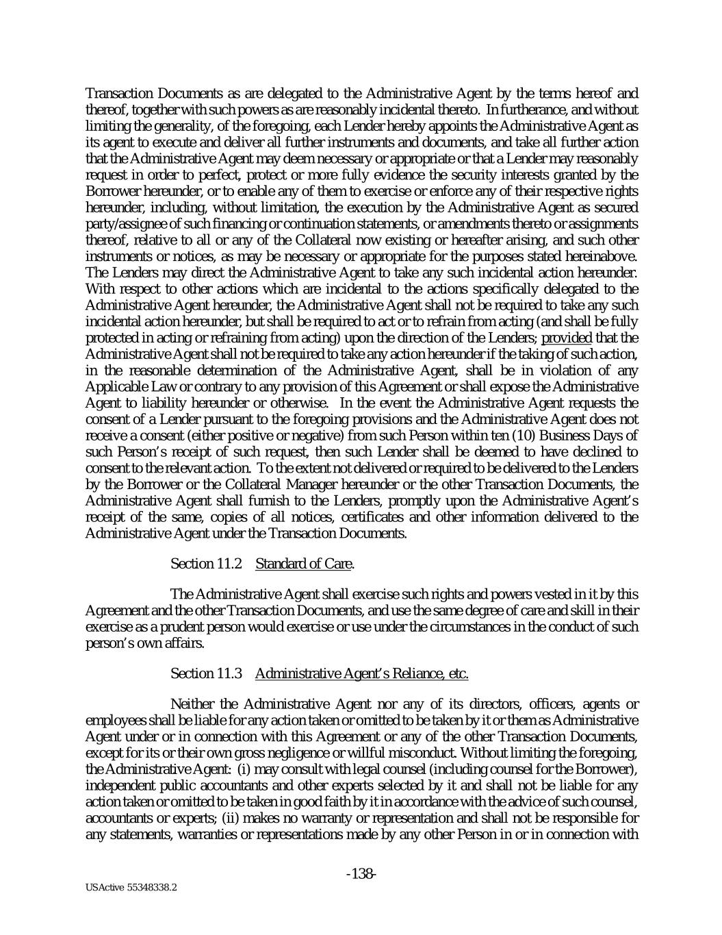 Transaction Documents as are delegated to the Administrative Agent by the terms hereof and thereof, together with such powers as are reasonably incidental thereto. In furtherance, and without limiting the generality, of the foregoing, each Lender hereby appoints the Administrative Agent as its agent to execute and deliver all further instruments and documents, and take all further action that the Administrative Agent may deem necessary or appropriate or that a Lender may reasonably request in order to perfect, protect or more fully evidence the security interests granted by the Borrower hereunder, or to enable any of them to exercise or enforce any of their respective rights hereunder, including, without limitation, the execution by the Administrative Agent as secured party/assignee of such financing or continuation statements, or amendments thereto or assignments thereof, relative to all or any of the Collateral now existing or hereafter arising, and such other instruments or notices, as may be necessary or appropriate for the purposes stated hereinabove. The Lenders may direct the Administrative Agent to take any such incidental action hereunder. With respect to other actions which are incidental to the actions specifically delegated to the Administrative Agent hereunder, the Administrative Agent shall not be required to take any such incidental action hereunder, but shall be required to act or to refrain from acting (and shall be fully protected in acting or refraining from acting) upon the direction of the Lenders; provided that the Administrative Agent shall not be required to take any action hereunder if the taking of such action, in the reasonable determination of the Administrative Agent, shall be in violation of any Applicable Law or contrary to any provision of this Agreement or shall expose the Administrative Agent to liability hereunder or otherwise. In the event the Administrative Agent requests the consent of a Lender pursuant to the foregoing provisions and the Administrative Agent does not receive a consent (either positive or negative) from such Person within ten (10) Business Days of such Person’s receipt of such request, then such Lender shall be deemed to have declined to consent to the relevant action. To the extent not delivered or required to be delivered to the Lenders by the Borrower or the Collateral Manager hereunder or the other Transaction Documents, the Administrative Agent shall furnish to the Lenders, promptly upon the Administrative Agent’s receipt of the same, copies of all notices, certificates and other information delivered to the Administrative Agent under the Transaction Documents. Section 11.2 Standard of Care. The Administrative Agent shall exercise such rights and powers vested in it by this Agreement and the other Transaction Documents, and use the same degree of care and skill in their exercise as a prudent person would exercise or use under the circumstances in the conduct of such person’s own affairs. Section 11.3 Administrative Agent’s Reliance, etc. Neither the Administrative Agent nor any of its directors, officers, agents or employees shall be liable for any action taken or omitted to be taken by it or them as Administrative Agent under or in connection with this Agreement or any of the other Transaction Documents, except for its or their own gross negligence or willful misconduct. Without limiting the foregoing, the Administrative Agent: (i) may consult with legal counsel (including counsel for the Borrower), independent public accountants and other experts selected by it and shall not be liable for any action taken or omitted to be taken in good faith by it in accordance with the advice of such counsel, accountants or experts; (ii) makes no warranty or representation and shall not be responsible for any statements, warranties or representations made by any other Person in or in connection with -138- USActive 55348338.2