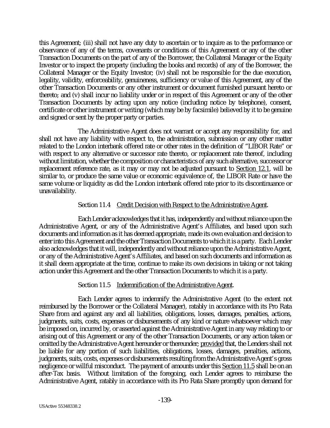 this Agreement; (iii) shall not have any duty to ascertain or to inquire as to the performance or observance of any of the terms, covenants or conditions of this Agreement or any of the other Transaction Documents on the part of any of the Borrower, the Collateral Manager or the Equity Investor or to inspect the property (including the books and records) of any of the Borrower, the Collateral Manager or the Equity Investor; (iv) shall not be responsible for the due execution, legality, validity, enforceability, genuineness, sufficiency or value of this Agreement, any of the other Transaction Documents or any other instrument or document furnished pursuant hereto or thereto; and (v) shall incur no liability under or in respect of this Agreement or any of the other Transaction Documents by acting upon any notice (including notice by telephone), consent, certificate or other instrument or writing (which may be by facsimile) believed by it to be genuine and signed or sent by the proper party or parties. The Administrative Agent does not warrant or accept any responsibility for, and shall not have any liability with respect to, the administration, submission or any other matter related to the London interbank offered rate or other rates in the definition of “LIBOR Rate” or with respect to any alternative or successor rate thereto, or replacement rate thereof, including without limitation, whether the composition or characteristics of any such alternative, successor or replacement reference rate, as it may or may not be adjusted pursuant to Section 12.1, will be similar to, or produce the same value or economic equivalence of, the LIBOR Rate or have the same volume or liquidity as did the London interbank offered rate prior to its discontinuance or unavailability. Section 11.4 Credit Decision with Respect to the Administrative Agent. Each Lender acknowledges that it has, independently and without reliance upon the Administrative Agent, or any of the Administrative Agent’s Affiliates, and based upon such documents and information as it has deemed appropriate, made its own evaluation and decision to enter into this Agreement and the other Transaction Documents to which it is a party. Each Lender also acknowledges that it will, independently and without reliance upon the Administrative Agent, or any of the Administrative Agent’s Affiliates, and based on such documents and information as it shall deem appropriate at the time, continue to make its own decisions in taking or not taking action under this Agreement and the other Transaction Documents to which it is a party. Section 11.5 Indemnification of the Administrative Agent. Each Lender agrees to indemnify the Administrative Agent (to the extent not reimbursed by the Borrower or the Collateral Manager), ratably in accordance with its Pro Rata Share from and against any and all liabilities, obligations, losses, damages, penalties, actions, judgments, suits, costs, expenses or disbursements of any kind or nature whatsoever which may be imposed on, incurred by, or asserted against the Administrative Agent in any way relating to or arising out of this Agreement or any of the other Transaction Documents, or any action taken or omitted by the Administrative Agent hereunder or thereunder; provided that, the Lenders shall not be liable for any portion of such liabilities, obligations, losses, damages, penalties, actions, judgments, suits, costs, expenses or disbursements resulting from the Administrative Agent’s gross negligence or willful misconduct. The payment of amounts under this Section 11.5 shall be on an after-Tax basis. Without limitation of the foregoing, each Lender agrees to reimburse the Administrative Agent, ratably in accordance with its Pro Rata Share promptly upon demand for -139- USActive 55348338.2