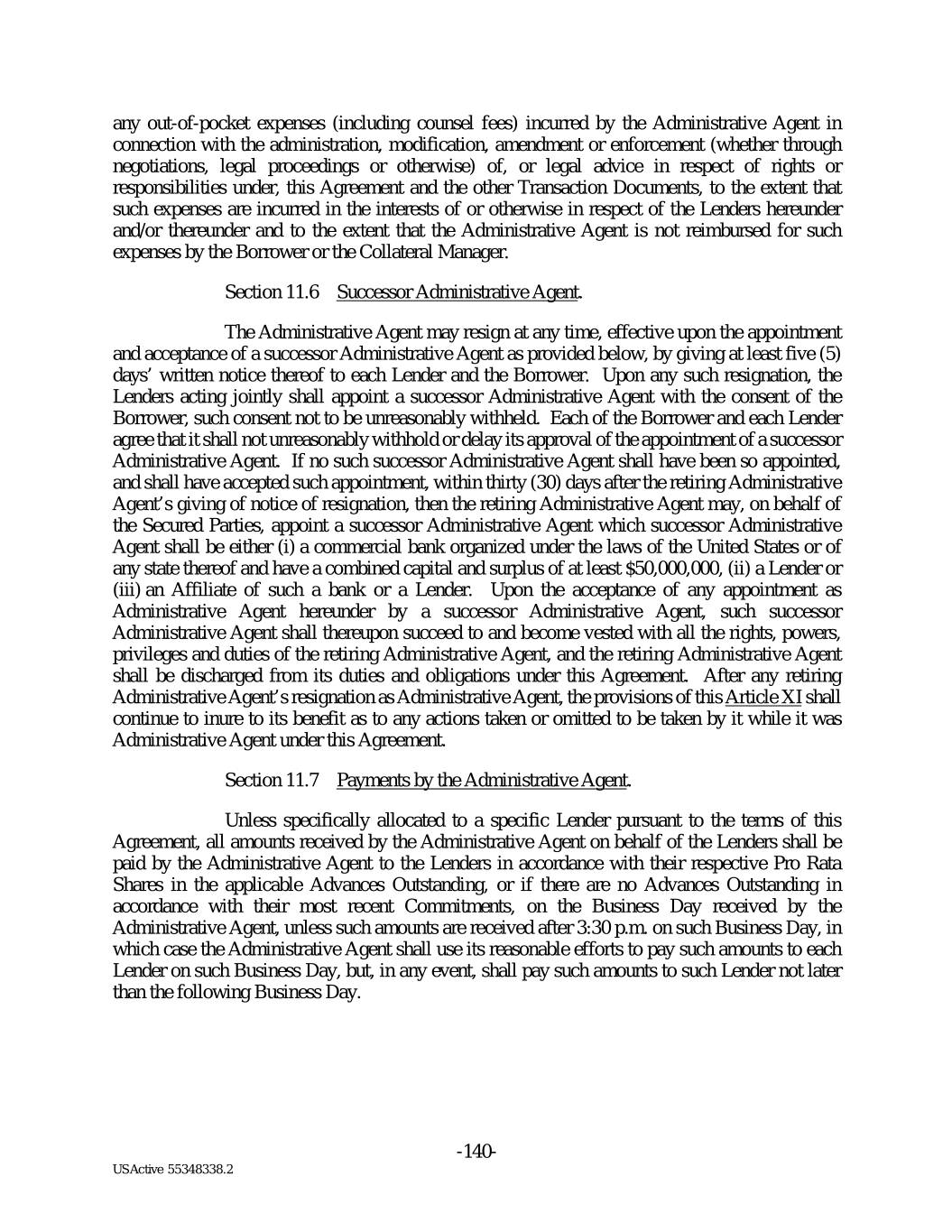 any out-of-pocket expenses (including counsel fees) incurred by the Administrative Agent in connection with the administration, modification, amendment or enforcement (whether through negotiations, legal proceedings or otherwise) of, or legal advice in respect of rights or responsibilities under, this Agreement and the other Transaction Documents, to the extent that such expenses are incurred in the interests of or otherwise in respect of the Lenders hereunder and/or thereunder and to the extent that the Administrative Agent is not reimbursed for such expenses by the Borrower or the Collateral Manager. Section 11.6 Successor Administrative Agent. The Administrative Agent may resign at any time, effective upon the appointment and acceptance of a successor Administrative Agent as provided below, by giving at least five (5) days’ written notice thereof to each Lender and the Borrower. Upon any such resignation, the Lenders acting jointly shall appoint a successor Administrative Agent with the consent of the Borrower, such consent not to be unreasonably withheld. Each of the Borrower and each Lender agree that it shall not unreasonably withhold or delay its approval of the appointment of a successor Administrative Agent. If no such successor Administrative Agent shall have been so appointed, and shall have accepted such appointment, within thirty (30) days after the retiring Administrative Agent’s giving of notice of resignation, then the retiring Administrative Agent may, on behalf of the Secured Parties, appoint a successor Administrative Agent which successor Administrative Agent shall be either (i) a commercial bank organized under the laws of the United States or of any state thereof and have a combined capital and surplus of at least $50,000,000, (ii) a Lender or (iii) an Affiliate of such a bank or a Lender. Upon the acceptance of any appointment as Administrative Agent hereunder by a successor Administrative Agent, such successor Administrative Agent shall thereupon succeed to and become vested with all the rights, powers, privileges and duties of the retiring Administrative Agent, and the retiring Administrative Agent shall be discharged from its duties and obligations under this Agreement. After any retiring Administrative Agent’s resignation as Administrative Agent, the provisions of this Article XI shall continue to inure to its benefit as to any actions taken or omitted to be taken by it while it was Administrative Agent under this Agreement. Section 11.7 Payments by the Administrative Agent. Unless specifically allocated to a specific Lender pursuant to the terms of this Agreement, all amounts received by the Administrative Agent on behalf of the Lenders shall be paid by the Administrative Agent to the Lenders in accordance with their respective Pro Rata Shares in the applicable Advances Outstanding, or if there are no Advances Outstanding in accordance with their most recent Commitments, on the Business Day received by the Administrative Agent, unless such amounts are received after 3:30 p.m. on such Business Day, in which case the Administrative Agent shall use its reasonable efforts to pay such amounts to each Lender on such Business Day, but, in any event, shall pay such amounts to such Lender not later than the following Business Day. -140- USActive 55348338.2