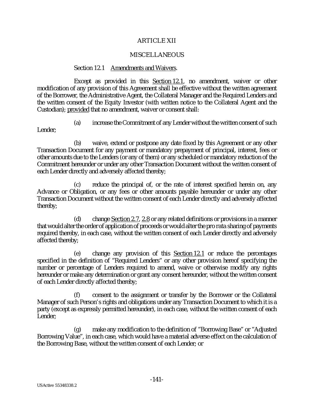 ARTICLE XII MISCELLANEOUS Section 12.1 Amendments and Waivers. Except as provided in this Section 12.1, no amendment, waiver or other modification of any provision of this Agreement shall be effective without the written agreement of the Borrower, the Administrative Agent, the Collateral Manager and the Required Lenders and the written consent of the Equity Investor (with written notice to the Collateral Agent and the Custodian); provided that no amendment, waiver or consent shall: (a) increase the Commitment of any Lender without the written consent of such Lender; (b) waive, extend or postpone any date fixed by this Agreement or any other Transaction Document for any payment or mandatory prepayment of principal, interest, fees or other amounts due to the Lenders (or any of them) or any scheduled or mandatory reduction of the Commitment hereunder or under any other Transaction Document without the written consent of each Lender directly and adversely affected thereby; (c) reduce the principal of, or the rate of interest specified herein on, any Advance or Obligation, or any fees or other amounts payable hereunder or under any other Transaction Document without the written consent of each Lender directly and adversely affected thereby; (d) change Section 2.7, 2.8 or any related definitions or provisions in a manner that would alter the order of application of proceeds or would alter the pro rata sharing of payments required thereby, in each case, without the written consent of each Lender directly and adversely affected thereby; (e) change any provision of this Section 12.1 or reduce the percentages specified in the definition of “Required Lenders” or any other provision hereof specifying the number or percentage of Lenders required to amend, waive or otherwise modify any rights hereunder or make any determination or grant any consent hereunder, without the written consent of each Lender directly affected thereby; (f) consent to the assignment or transfer by the Borrower or the Collateral Manager of such Person’s rights and obligations under any Transaction Document to which it is a party (except as expressly permitted hereunder), in each case, without the written consent of each Lender; (g) make any modification to the definition of “Borrowing Base” or “Adjusted Borrowing Value”, in each case, which would have a material adverse effect on the calculation of the Borrowing Base, without the written consent of each Lender; or -141- USActive 55348338.2