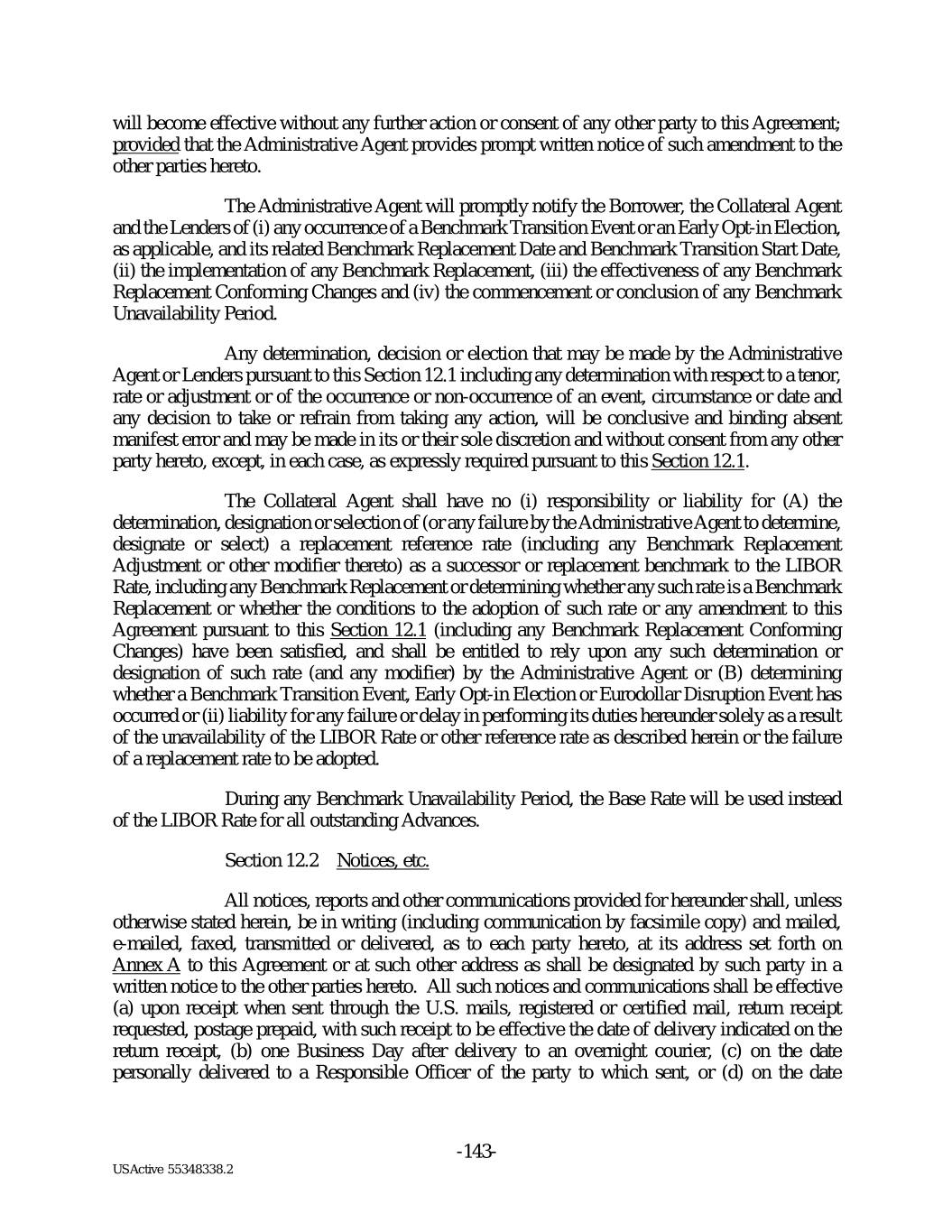 will become effective without any further action or consent of any other party to this Agreement; provided that the Administrative Agent provides prompt written notice of such amendment to the other parties hereto. The Administrative Agent will promptly notify the Borrower, the Collateral Agent and the Lenders of (i) any occurrence of a Benchmark Transition Event or an Early Opt-in Election, as applicable, and its related Benchmark Replacement Date and Benchmark Transition Start Date, (ii) the implementation of any Benchmark Replacement, (iii) the effectiveness of any Benchmark Replacement Conforming Changes and (iv) the commencement or conclusion of any Benchmark Unavailability Period. Any determination, decision or election that may be made by the Administrative Agent or Lenders pursuant to this Section 12.1 including any determination with respect to a tenor, rate or adjustment or of the occurrence or non-occurrence of an event, circumstance or date and any decision to take or refrain from taking any action, will be conclusive and binding absent manifest error and may be made in its or their sole discretion and without consent from any other party hereto, except, in each case, as expressly required pursuant to this Section 12.1. The Collateral Agent shall have no (i) responsibility or liability for (A) the determination, designation or selection of (or any failure by the Administrative Agent to determine, designate or select) a replacement reference rate (including any Benchmark Replacement Adjustment or other modifier thereto) as a successor or replacement benchmark to the LIBOR Rate, including any Benchmark Replacement or determining whether any such rate is a Benchmark Replacement or whether the conditions to the adoption of such rate or any amendment to this Agreement pursuant to this Section 12.1 (including any Benchmark Replacement Conforming Changes) have been satisfied, and shall be entitled to rely upon any such determination or designation of such rate (and any modifier) by the Administrative Agent or (B) determining whether a Benchmark Transition Event, Early Opt-in Election or Eurodollar Disruption Event has occurred or (ii) liability for any failure or delay in performing its duties hereunder solely as a result of the unavailability of the LIBOR Rate or other reference rate as described herein or the failure of a replacement rate to be adopted. During any Benchmark Unavailability Period, the Base Rate will be used instead of the LIBOR Rate for all outstanding Advances. Section 12.2 Notices, etc. All notices, reports and other communications provided for hereunder shall, unless otherwise stated herein, be in writing (including communication by facsimile copy) and mailed, e-mailed, faxed, transmitted or delivered, as to each party hereto, at its address set forth on Annex A to this Agreement or at such other address as shall be designated by such party in a written notice to the other parties hereto. All such notices and communications shall be effective (a) upon receipt when sent through the U.S. mails, registered or certified mail, return receipt requested, postage prepaid, with such receipt to be effective the date of delivery indicated on the return receipt, (b) one Business Day after delivery to an overnight courier, (c) on the date personally delivered to a Responsible Officer of the party to which sent, or (d) on the date -143- USActive 55348338.2