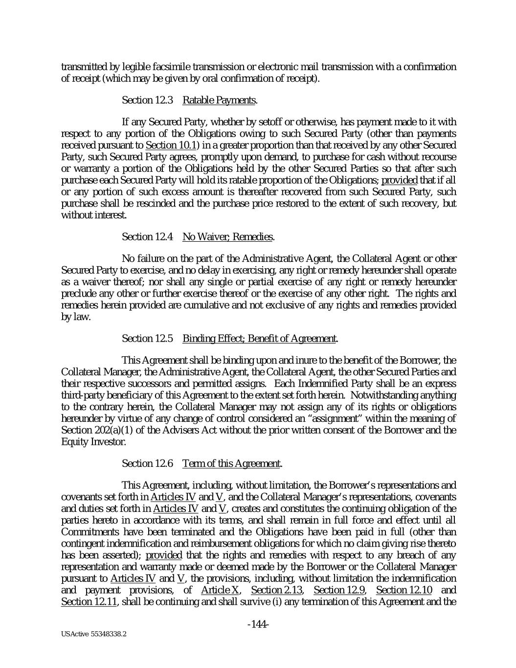 transmitted by legible facsimile transmission or electronic mail transmission with a confirmation of receipt (which may be given by oral confirmation of receipt). Section 12.3 Ratable Payments. If any Secured Party, whether by setoff or otherwise, has payment made to it with respect to any portion of the Obligations owing to such Secured Party (other than payments received pursuant to Section 10.1) in a greater proportion than that received by any other Secured Party, such Secured Party agrees, promptly upon demand, to purchase for cash without recourse or warranty a portion of the Obligations held by the other Secured Parties so that after such purchase each Secured Party will hold its ratable proportion of the Obligations; provided that if all or any portion of such excess amount is thereafter recovered from such Secured Party, such purchase shall be rescinded and the purchase price restored to the extent of such recovery, but without interest. Section 12.4 No Waiver; Remedies. No failure on the part of the Administrative Agent, the Collateral Agent or other Secured Party to exercise, and no delay in exercising, any right or remedy hereunder shall operate as a waiver thereof; nor shall any single or partial exercise of any right or remedy hereunder preclude any other or further exercise thereof or the exercise of any other right. The rights and remedies herein provided are cumulative and not exclusive of any rights and remedies provided by law. Section 12.5 Binding Effect; Benefit of Agreement. This Agreement shall be binding upon and inure to the benefit of the Borrower, the Collateral Manager, the Administrative Agent, the Collateral Agent, the other Secured Parties and their respective successors and permitted assigns. Each Indemnified Party shall be an express third-party beneficiary of this Agreement to the extent set forth herein. Notwithstanding anything to the contrary herein, the Collateral Manager may not assign any of its rights or obligations hereunder by virtue of any change of control considered an “assignment” within the meaning of Section 202(a)(1) of the Advisers Act without the prior written consent of the Borrower and the Equity Investor. Section 12.6 Term of this Agreement. This Agreement, including, without limitation, the Borrower’s representations and covenants set forth in Articles IV and V, and the Collateral Manager’s representations, covenants and duties set forth in Articles IV and V, creates and constitutes the continuing obligation of the parties hereto in accordance with its terms, and shall remain in full force and effect until all Commitments have been terminated and the Obligations have been paid in full (other than contingent indemnification and reimbursement obligations for which no claim giving rise thereto has been asserted); provided that the rights and remedies with respect to any breach of any representation and warranty made or deemed made by the Borrower or the Collateral Manager pursuant to Articles IV and V, the provisions, including, without limitation the indemnification and payment provisions, of Article X, Section 2.13, Section 12.9, Section 12.10 and Section 12.11, shall be continuing and shall survive (i) any termination of this Agreement and the -144- USActive 55348338.2