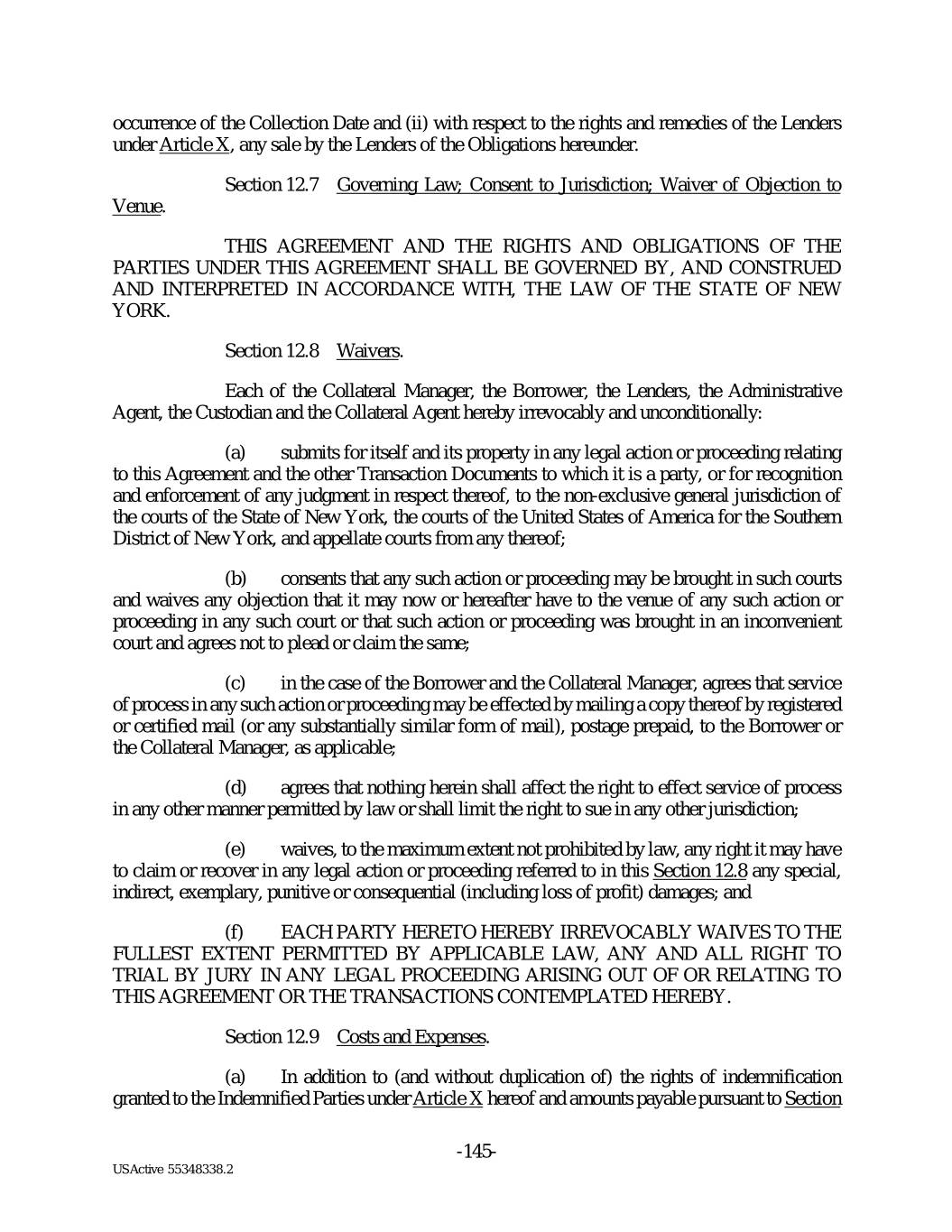 occurrence of the Collection Date and (ii) with respect to the rights and remedies of the Lenders under Article X, any sale by the Lenders of the Obligations hereunder. Section 12.7 Governing Law; Consent to Jurisdiction; Waiver of Objection to Venue. THIS AGREEMENT AND THE RIGHTS AND OBLIGATIONS OF THE PARTIES UNDER THIS AGREEMENT SHALL BE GOVERNED BY, AND CONSTRUED AND INTERPRETED IN ACCORDANCE WITH, THE LAW OF THE STATE OF NEW YORK. Section 12.8 Waivers. Each of the Collateral Manager, the Borrower, the Lenders, the Administrative Agent, the Custodian and the Collateral Agent hereby irrevocably and unconditionally: (a) submits for itself and its property in any legal action or proceeding relating to this Agreement and the other Transaction Documents to which it is a party, or for recognition and enforcement of any judgment in respect thereof, to the non-exclusive general jurisdiction of the courts of the State of New York, the courts of the United States of America for the Southern District of New York, and appellate courts from any thereof; (b) consents that any such action or proceeding may be brought in such courts and waives any objection that it may now or hereafter have to the venue of any such action or proceeding in any such court or that such action or proceeding was brought in an inconvenient court and agrees not to plead or claim the same; (c) in the case of the Borrower and the Collateral Manager, agrees that service of process in any such action or proceeding may be effected by mailing a copy thereof by registered or certified mail (or any substantially similar form of mail), postage prepaid, to the Borrower or the Collateral Manager, as applicable; (d) agrees that nothing herein shall affect the right to effect service of process in any other manner permitted by law or shall limit the right to sue in any other jurisdiction; (e) waives, to the maximum extent not prohibited by law, any right it may have to claim or recover in any legal action or proceeding referred to in this Section 12.8 any special, indirect, exemplary, punitive or consequential (including loss of profit) damages; and (f) EACH PARTY HERETO HEREBY IRREVOCABLY WAIVES TO THE FULLEST EXTENT PERMITTED BY APPLICABLE LAW, ANY AND ALL RIGHT TO TRIAL BY JURY IN ANY LEGAL PROCEEDING ARISING OUT OF OR RELATING TO THIS AGREEMENT OR THE TRANSACTIONS CONTEMPLATED HEREBY. Section 12.9 Costs and Expenses. (a) In addition to (and without duplication of) the rights of indemnification granted to the Indemnified Parties under Article X hereof and amounts payable pursuant to Section -145- USActive 55348338.2