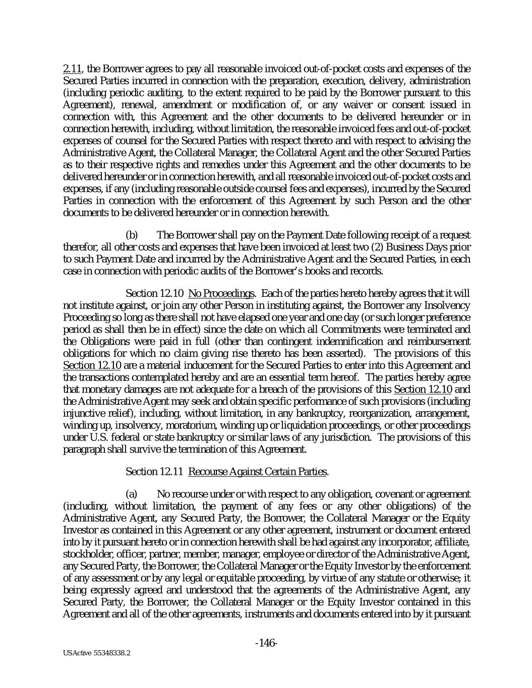 2.11, the Borrower agrees to pay all reasonable invoiced out-of-pocket costs and expenses of the Secured Parties incurred in connection with the preparation, execution, delivery, administration (including periodic auditing, to the extent required to be paid by the Borrower pursuant to this Agreement), renewal, amendment or modification of, or any waiver or consent issued in connection with, this Agreement and the other documents to be delivered hereunder or in connection herewith, including, without limitation, the reasonable invoiced fees and out-of-pocket expenses of counsel for the Secured Parties with respect thereto and with respect to advising the Administrative Agent, the Collateral Manager, the Collateral Agent and the other Secured Parties as to their respective rights and remedies under this Agreement and the other documents to be delivered hereunder or in connection herewith, and all reasonable invoiced out-of-pocket costs and expenses, if any (including reasonable outside counsel fees and expenses), incurred by the Secured Parties in connection with the enforcement of this Agreement by such Person and the other documents to be delivered hereunder or in connection herewith. (b) The Borrower shall pay on the Payment Date following receipt of a request therefor, all other costs and expenses that have been invoiced at least two (2) Business Days prior to such Payment Date and incurred by the Administrative Agent and the Secured Parties, in each case in connection with periodic audits of the Borrower’s books and records. Section 12.10 No Proceedings. Each of the parties hereto hereby agrees that it will not institute against, or join any other Person in instituting against, the Borrower any Insolvency Proceeding so long as there shall not have elapsed one year and one day (or such longer preference period as shall then be in effect) since the date on which all Commitments were terminated and the Obligations were paid in full (other than contingent indemnification and reimbursement obligations for which no claim giving rise thereto has been asserted). The provisions of this Section 12.10 are a material inducement for the Secured Parties to enter into this Agreement and the transactions contemplated hereby and are an essential term hereof. The parties hereby agree that monetary damages are not adequate for a breach of the provisions of this Section 12.10 and the Administrative Agent may seek and obtain specific performance of such provisions (including injunctive relief), including, without limitation, in any bankruptcy, reorganization, arrangement, winding up, insolvency, moratorium, winding up or liquidation proceedings, or other proceedings under U.S. federal or state bankruptcy or similar laws of any jurisdiction. The provisions of this paragraph shall survive the termination of this Agreement. Section 12.11 Recourse Against Certain Parties. (a) No recourse under or with respect to any obligation, covenant or agreement (including, without limitation, the payment of any fees or any other obligations) of the Administrative Agent, any Secured Party, the Borrower, the Collateral Manager or the Equity Investor as contained in this Agreement or any other agreement, instrument or document entered into by it pursuant hereto or in connection herewith shall be had against any incorporator, affiliate, stockholder, officer, partner, member, manager, employee or director of the Administrative Agent, any Secured Party, the Borrower, the Collateral Manager or the Equity Investor by the enforcement of any assessment or by any legal or equitable proceeding, by virtue of any statute or otherwise; it being expressly agreed and understood that the agreements of the Administrative Agent, any Secured Party, the Borrower, the Collateral Manager or the Equity Investor contained in this Agreement and all of the other agreements, instruments and documents entered into by it pursuant -146- USActive 55348338.2