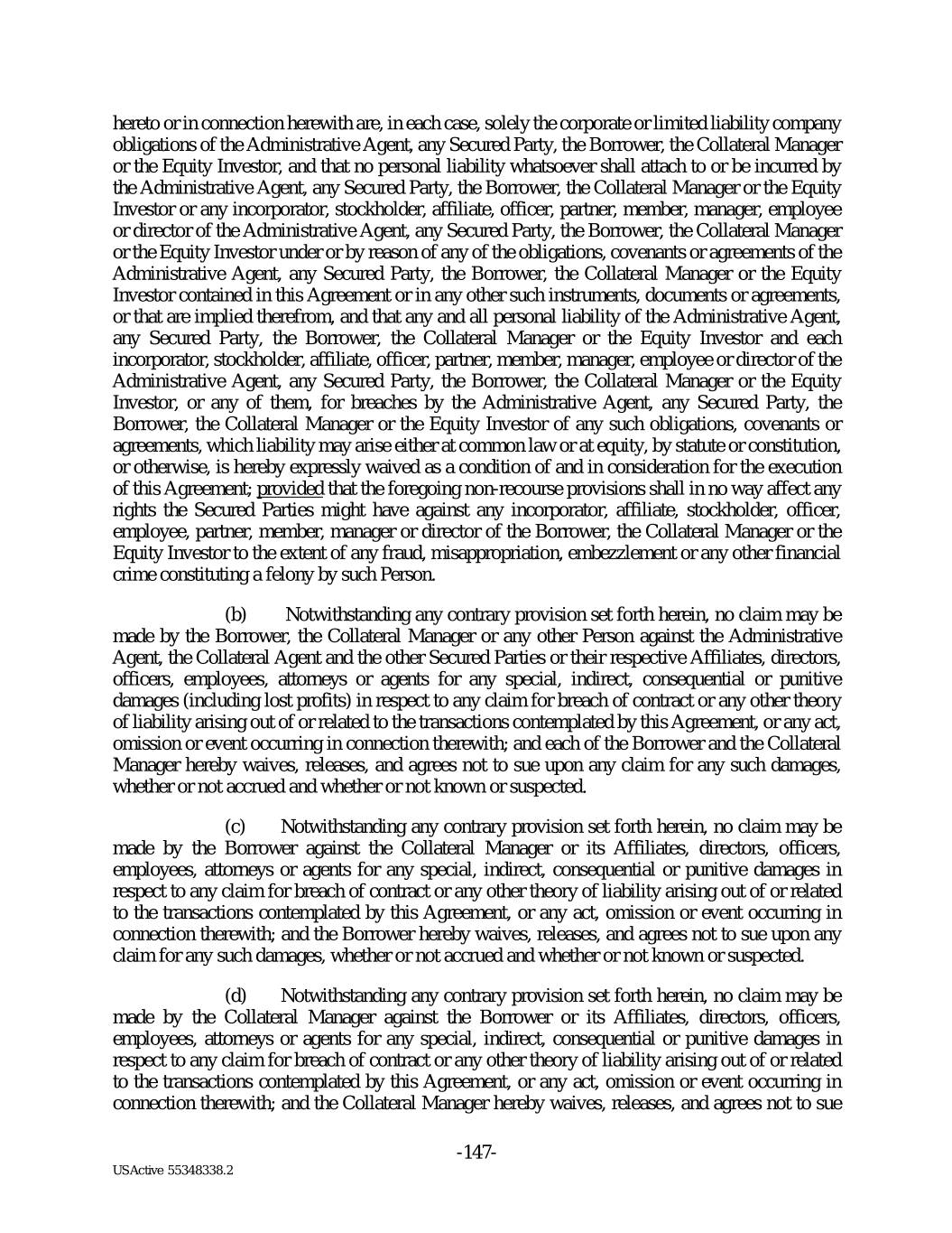 hereto or in connection herewith are, in each case, solely the corporate or limited liability company obligations of the Administrative Agent, any Secured Party, the Borrower, the Collateral Manager or the Equity Investor, and that no personal liability whatsoever shall attach to or be incurred by the Administrative Agent, any Secured Party, the Borrower, the Collateral Manager or the Equity Investor or any incorporator, stockholder, affiliate, officer, partner, member, manager, employee or director of the Administrative Agent, any Secured Party, the Borrower, the Collateral Manager or the Equity Investor under or by reason of any of the obligations, covenants or agreements of the Administrative Agent, any Secured Party, the Borrower, the Collateral Manager or the Equity Investor contained in this Agreement or in any other such instruments, documents or agreements, or that are implied therefrom, and that any and all personal liability of the Administrative Agent, any Secured Party, the Borrower, the Collateral Manager or the Equity Investor and each incorporator, stockholder, affiliate, officer, partner, member, manager, employee or director of the Administrative Agent, any Secured Party, the Borrower, the Collateral Manager or the Equity Investor, or any of them, for breaches by the Administrative Agent, any Secured Party, the Borrower, the Collateral Manager or the Equity Investor of any such obligations, covenants or agreements, which liability may arise either at common law or at equity, by statute or constitution, or otherwise, is hereby expressly waived as a condition of and in consideration for the execution of this Agreement; provided that the foregoing non-recourse provisions shall in no way affect any rights the Secured Parties might have against any incorporator, affiliate, stockholder, officer, employee, partner, member, manager or director of the Borrower, the Collateral Manager or the Equity Investor to the extent of any fraud, misappropriation, embezzlement or any other financial crime constituting a felony by such Person. (b) Notwithstanding any contrary provision set forth herein, no claim may be made by the Borrower, the Collateral Manager or any other Person against the Administrative Agent, the Collateral Agent and the other Secured Parties or their respective Affiliates, directors, officers, employees, attorneys or agents for any special, indirect, consequential or punitive damages (including lost profits) in respect to any claim for breach of contract or any other theory of liability arising out of or related to the transactions contemplated by this Agreement, or any act, omission or event occurring in connection therewith; and each of the Borrower and the Collateral Manager hereby waives, releases, and agrees not to sue upon any claim for any such damages, whether or not accrued and whether or not known or suspected. (c) Notwithstanding any contrary provision set forth herein, no claim may be made by the Borrower against the Collateral Manager or its Affiliates, directors, officers, employees, attorneys or agents for any special, indirect, consequential or punitive damages in respect to any claim for breach of contract or any other theory of liability arising out of or related to the transactions contemplated by this Agreement, or any act, omission or event occurring in connection therewith; and the Borrower hereby waives, releases, and agrees not to sue upon any claim for any such damages, whether or not accrued and whether or not known or suspected. (d) Notwithstanding any contrary provision set forth herein, no claim may be made by the Collateral Manager against the Borrower or its Affiliates, directors, officers, employees, attorneys or agents for any special, indirect, consequential or punitive damages in respect to any claim for breach of contract or any other theory of liability arising out of or related to the transactions contemplated by this Agreement, or any act, omission or event occurring in connection therewith; and the Collateral Manager hereby waives, releases, and agrees not to sue -147- USActive 55348338.2