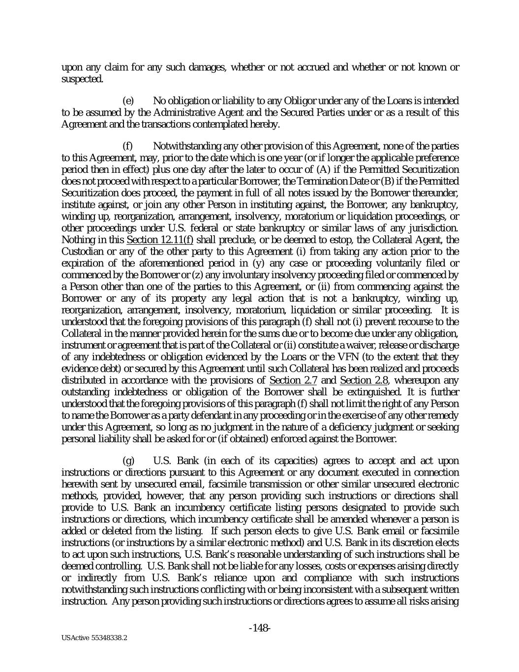 upon any claim for any such damages, whether or not accrued and whether or not known or suspected. (e) No obligation or liability to any Obligor under any of the Loans is intended to be assumed by the Administrative Agent and the Secured Parties under or as a result of this Agreement and the transactions contemplated hereby. (f) Notwithstanding any other provision of this Agreement, none of the parties to this Agreement, may, prior to the date which is one year (or if longer the applicable preference period then in effect) plus one day after the later to occur of (A) if the Permitted Securitization does not proceed with respect to a particular Borrower, the Termination Date or (B) if the Permitted Securitization does proceed, the payment in full of all notes issued by the Borrower thereunder, institute against, or join any other Person in instituting against, the Borrower, any bankruptcy, winding up, reorganization, arrangement, insolvency, moratorium or liquidation proceedings, or other proceedings under U.S. federal or state bankruptcy or similar laws of any jurisdiction. Nothing in this Section 12.11(f) shall preclude, or be deemed to estop, the Collateral Agent, the Custodian or any of the other party to this Agreement (i) from taking any action prior to the expiration of the aforementioned period in (y) any case or proceeding voluntarily filed or commenced by the Borrower or (z) any involuntary insolvency proceeding filed or commenced by a Person other than one of the parties to this Agreement, or (ii) from commencing against the Borrower or any of its property any legal action that is not a bankruptcy, winding up, reorganization, arrangement, insolvency, moratorium, liquidation or similar proceeding. It is understood that the foregoing provisions of this paragraph (f) shall not (i) prevent recourse to the Collateral in the manner provided herein for the sums due or to become due under any obligation, instrument or agreement that is part of the Collateral or (ii) constitute a waiver, release or discharge of any indebtedness or obligation evidenced by the Loans or the VFN (to the extent that they evidence debt) or secured by this Agreement until such Collateral has been realized and proceeds distributed in accordance with the provisions of Section 2.7 and Section 2.8, whereupon any outstanding indebtedness or obligation of the Borrower shall be extinguished. It is further understood that the foregoing provisions of this paragraph (f) shall not limit the right of any Person to name the Borrower as a party defendant in any proceeding or in the exercise of any other remedy under this Agreement, so long as no judgment in the nature of a deficiency judgment or seeking personal liability shall be asked for or (if obtained) enforced against the Borrower. (g) U.S. Bank (in each of its capacities) agrees to accept and act upon instructions or directions pursuant to this Agreement or any document executed in connection herewith sent by unsecured email, facsimile transmission or other similar unsecured electronic methods, provided, however, that any person providing such instructions or directions shall provide to U.S. Bank an incumbency certificate listing persons designated to provide such instructions or directions, which incumbency certificate shall be amended whenever a person is added or deleted from the listing. If such person elects to give U.S. Bank email or facsimile instructions (or instructions by a similar electronic method) and U.S. Bank in its discretion elects to act upon such instructions, U.S. Bank’s reasonable understanding of such instructions shall be deemed controlling. U.S. Bank shall not be liable for any losses, costs or expenses arising directly or indirectly from U.S. Bank’s reliance upon and compliance with such instructions notwithstanding such instructions conflicting with or being inconsistent with a subsequent written instruction. Any person providing such instructions or directions agrees to assume all risks arising -148- USActive 55348338.2