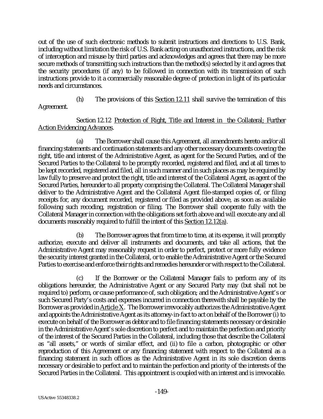 out of the use of such electronic methods to submit instructions and directions to U.S. Bank, including without limitation the risk of U.S. Bank acting on unauthorized instructions, and the risk of interception and misuse by third parties and acknowledges and agrees that there may be more secure methods of transmitting such instructions than the method(s) selected by it and agrees that the security procedures (if any) to be followed in connection with its transmission of such instructions provide to it a commercially reasonable degree of protection in light of its particular needs and circumstances. (h) The provisions of this Section 12.11 shall survive the termination of this Agreement. Section 12.12 Protection of Right, Title and Interest in the Collateral; Further Action Evidencing Advances. (a) The Borrower shall cause this Agreement, all amendments hereto and/or all financing statements and continuation statements and any other necessary documents covering the right, title and interest of the Administrative Agent, as agent for the Secured Parties, and of the Secured Parties to the Collateral to be promptly recorded, registered and filed, and at all times to be kept recorded, registered and filed, all in such manner and in such places as may be required by law fully to preserve and protect the right, title and interest of the Collateral Agent, as agent of the Secured Parties, hereunder to all property comprising the Collateral. The Collateral Manager shall deliver to the Administrative Agent and the Collateral Agent file-stamped copies of, or filing receipts for, any document recorded, registered or filed as provided above, as soon as available following such recoding, registration or filing. The Borrower shall cooperate fully with the Collateral Manager in connection with the obligations set forth above and will execute any and all documents reasonably required to fulfill the intent of this Section 12.12(a). (b) The Borrower agrees that from time to time, at its expense, it will promptly authorize, execute and deliver all instruments and documents, and take all actions, that the Administrative Agent may reasonably request in order to perfect, protect or more fully evidence the security interest granted in the Collateral, or to enable the Administrative Agent or the Secured Parties to exercise and enforce their rights and remedies hereunder or with respect to the Collateral. (c) If the Borrower or the Collateral Manager fails to perform any of its obligations hereunder, the Administrative Agent or any Secured Party may (but shall not be required to) perform, or cause performance of, such obligation; and the Administrative Agent’s or such Secured Party’s costs and expenses incurred in connection therewith shall be payable by the Borrower as provided in Article X. The Borrower irrevocably authorizes the Administrative Agent and appoints the Administrative Agent as its attorney-in-fact to act on behalf of the Borrower (i) to execute on behalf of the Borrower as debtor and to file financing statements necessary or desirable in the Administrative Agent’s sole discretion to perfect and to maintain the perfection and priority of the interest of the Secured Parties in the Collateral, including those that describe the Collateral as “all assets,” or words of similar effect, and (ii) to file a carbon, photographic or other reproduction of this Agreement or any financing statement with respect to the Collateral as a financing statement in such offices as the Administrative Agent in its sole discretion deems necessary or desirable to perfect and to maintain the perfection and priority of the interests of the Secured Parties in the Collateral. This appointment is coupled with an interest and is irrevocable. -149- USActive 55348338.2