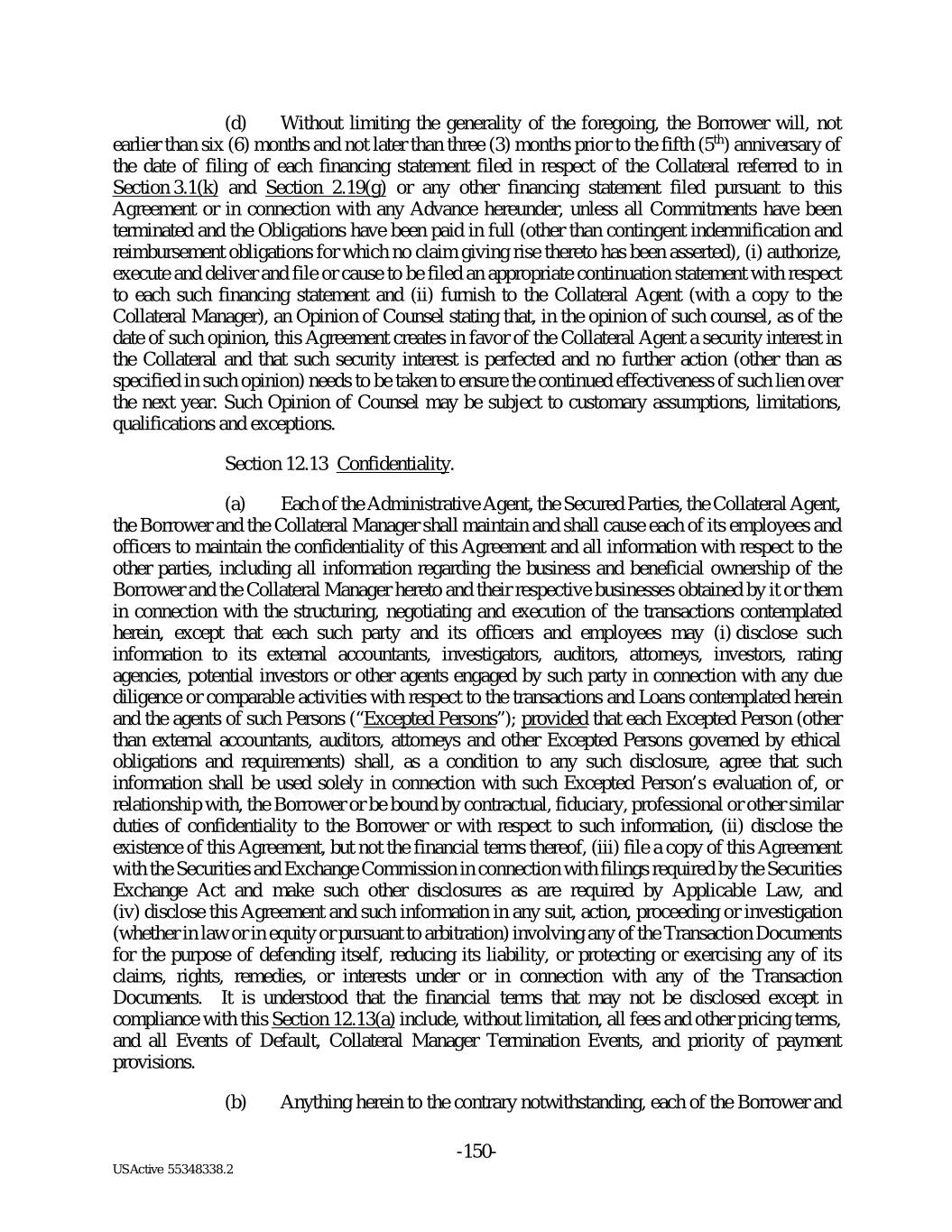 (d) Without limiting the generality of the foregoing, the Borrower will, not earlier than six (6) months and not later than three (3) months prior to the fifth (5th) anniversary of the date of filing of each financing statement filed in respect of the Collateral referred to in Section 3.1(k) and Section 2.19(g) or any other financing statement filed pursuant to this Agreement or in connection with any Advance hereunder, unless all Commitments have been terminated and the Obligations have been paid in full (other than contingent indemnification and reimbursement obligations for which no claim giving rise thereto has been asserted), (i) authorize, execute and deliver and file or cause to be filed an appropriate continuation statement with respect to each such financing statement and (ii) furnish to the Collateral Agent (with a copy to the Collateral Manager), an Opinion of Counsel stating that, in the opinion of such counsel, as of the date of such opinion, this Agreement creates in favor of the Collateral Agent a security interest in the Collateral and that such security interest is perfected and no further action (other than as specified in such opinion) needs to be taken to ensure the continued effectiveness of such lien over the next year. Such Opinion of Counsel may be subject to customary assumptions, limitations, qualifications and exceptions. Section 12.13 Confidentiality. (a) Each of the Administrative Agent, the Secured Parties, the Collateral Agent, the Borrower and the Collateral Manager shall maintain and shall cause each of its employees and officers to maintain the confidentiality of this Agreement and all information with respect to the other parties, including all information regarding the business and beneficial ownership of the Borrower and the Collateral Manager hereto and their respective businesses obtained by it or them in connection with the structuring, negotiating and execution of the transactions contemplated herein, except that each such party and its officers and employees may (i) disclose such information to its external accountants, investigators, auditors, attorneys, investors, rating agencies, potential investors or other agents engaged by such party in connection with any due diligence or comparable activities with respect to the transactions and Loans contemplated herein and the agents of such Persons (“Excepted Persons”); provided that each Excepted Person (other than external accountants, auditors, attorneys and other Excepted Persons governed by ethical obligations and requirements) shall, as a condition to any such disclosure, agree that such information shall be used solely in connection with such Excepted Person’s evaluation of, or relationship with, the Borrower or be bound by contractual, fiduciary, professional or other similar duties of confidentiality to the Borrower or with respect to such information, (ii) disclose the existence of this Agreement, but not the financial terms thereof, (iii) file a copy of this Agreement with the Securities and Exchange Commission in connection with filings required by the Securities Exchange Act and make such other disclosures as are required by Applicable Law, and (iv) disclose this Agreement and such information in any suit, action, proceeding or investigation (whether in law or in equity or pursuant to arbitration) involving any of the Transaction Documents for the purpose of defending itself, reducing its liability, or protecting or exercising any of its claims, rights, remedies, or interests under or in connection with any of the Transaction Documents. It is understood that the financial terms that may not be disclosed except in compliance with this Section 12.13(a) include, without limitation, all fees and other pricing terms, and all Events of Default, Collateral Manager Termination Events, and priority of payment provisions. (b) Anything herein to the contrary notwithstanding, each of the Borrower and -150- USActive 55348338.2