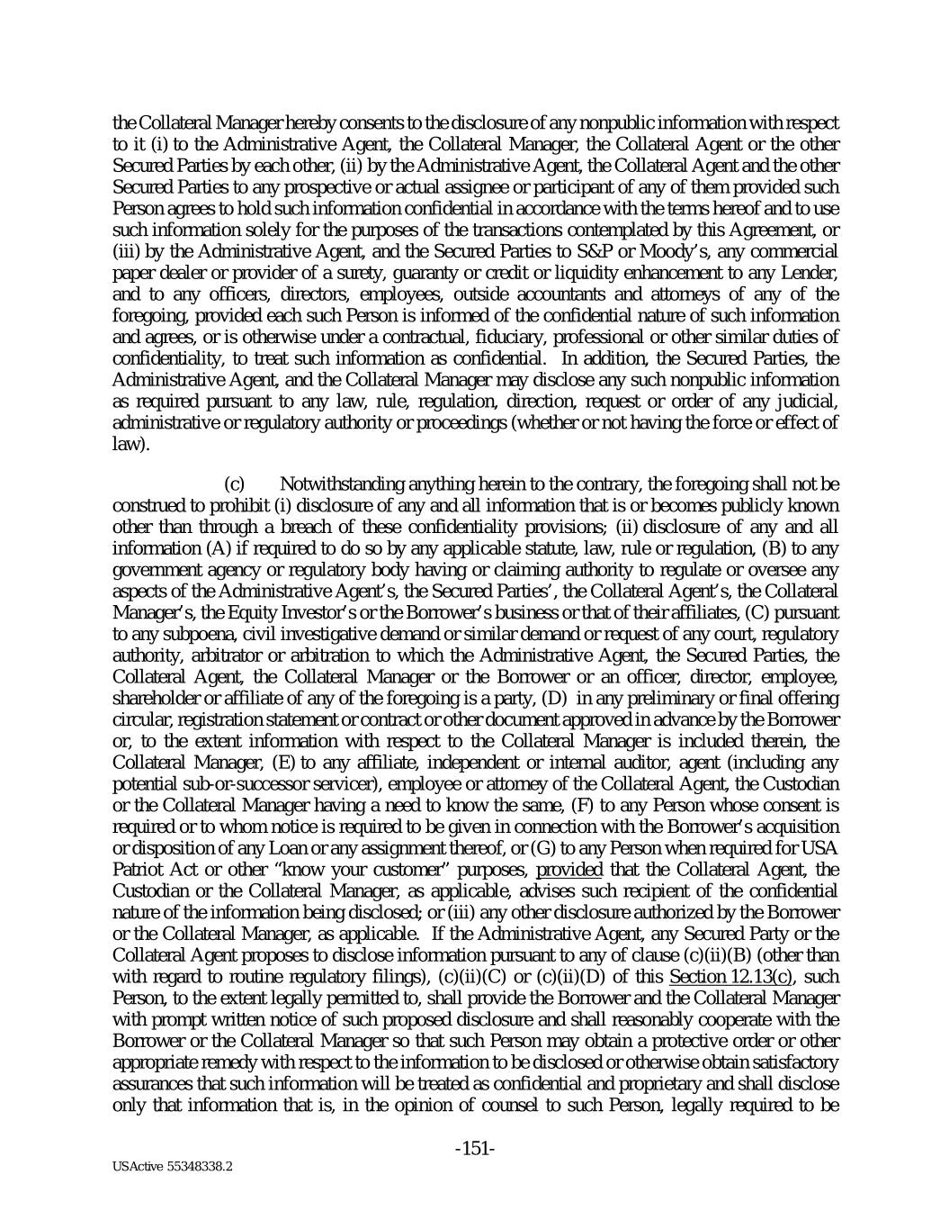 the Collateral Manager hereby consents to the disclosure of any nonpublic information with respect to it (i) to the Administrative Agent, the Collateral Manager, the Collateral Agent or the other Secured Parties by each other, (ii) by the Administrative Agent, the Collateral Agent and the other Secured Parties to any prospective or actual assignee or participant of any of them provided such Person agrees to hold such information confidential in accordance with the terms hereof and to use such information solely for the purposes of the transactions contemplated by this Agreement, or (iii) by the Administrative Agent, and the Secured Parties to S&P or Moody’s, any commercial paper dealer or provider of a surety, guaranty or credit or liquidity enhancement to any Lender, and to any officers, directors, employees, outside accountants and attorneys of any of the foregoing, provided each such Person is informed of the confidential nature of such information and agrees, or is otherwise under a contractual, fiduciary, professional or other similar duties of confidentiality, to treat such information as confidential. In addition, the Secured Parties, the Administrative Agent, and the Collateral Manager may disclose any such nonpublic information as required pursuant to any law, rule, regulation, direction, request or order of any judicial, administrative or regulatory authority or proceedings (whether or not having the force or effect of law). (c) Notwithstanding anything herein to the contrary, the foregoing shall not be construed to prohibit (i) disclosure of any and all information that is or becomes publicly known other than through a breach of these confidentiality provisions; (ii) disclosure of any and all information (A) if required to do so by any applicable statute, law, rule or regulation, (B) to any government agency or regulatory body having or claiming authority to regulate or oversee any aspects of the Administrative Agent’s, the Secured Parties’, the Collateral Agent’s, the Collateral Manager’s, the Equity Investor’s or the Borrower’s business or that of their affiliates, (C) pursuant to any subpoena, civil investigative demand or similar demand or request of any court, regulatory authority, arbitrator or arbitration to which the Administrative Agent, the Secured Parties, the Collateral Agent, the Collateral Manager or the Borrower or an officer, director, employee, shareholder or affiliate of any of the foregoing is a party, (D) in any preliminary or final offering circular, registration statement or contract or other document approved in advance by the Borrower or, to the extent information with respect to the Collateral Manager is included therein, the Collateral Manager, (E) to any affiliate, independent or internal auditor, agent (including any potential sub-or-successor servicer), employee or attorney of the Collateral Agent, the Custodian or the Collateral Manager having a need to know the same, (F) to any Person whose consent is required or to whom notice is required to be given in connection with the Borrower’s acquisition or disposition of any Loan or any assignment thereof, or (G) to any Person when required for USA Patriot Act or other “know your customer” purposes, provided that the Collateral Agent, the Custodian or the Collateral Manager, as applicable, advises such recipient of the confidential nature of the information being disclosed; or (iii) any other disclosure authorized by the Borrower or the Collateral Manager, as applicable. If the Administrative Agent, any Secured Party or the Collateral Agent proposes to disclose information pursuant to any of clause (c)(ii)(B) (other than with regard to routine regulatory filings), (c)(ii)(C) or (c)(ii)(D) of this Section 12.13(c), such Person, to the extent legally permitted to, shall provide the Borrower and the Collateral Manager with prompt written notice of such proposed disclosure and shall reasonably cooperate with the Borrower or the Collateral Manager so that such Person may obtain a protective order or other appropriate remedy with respect to the information to be disclosed or otherwise obtain satisfactory assurances that such information will be treated as confidential and proprietary and shall disclose only that information that is, in the opinion of counsel to such Person, legally required to be -151- USActive 55348338.2