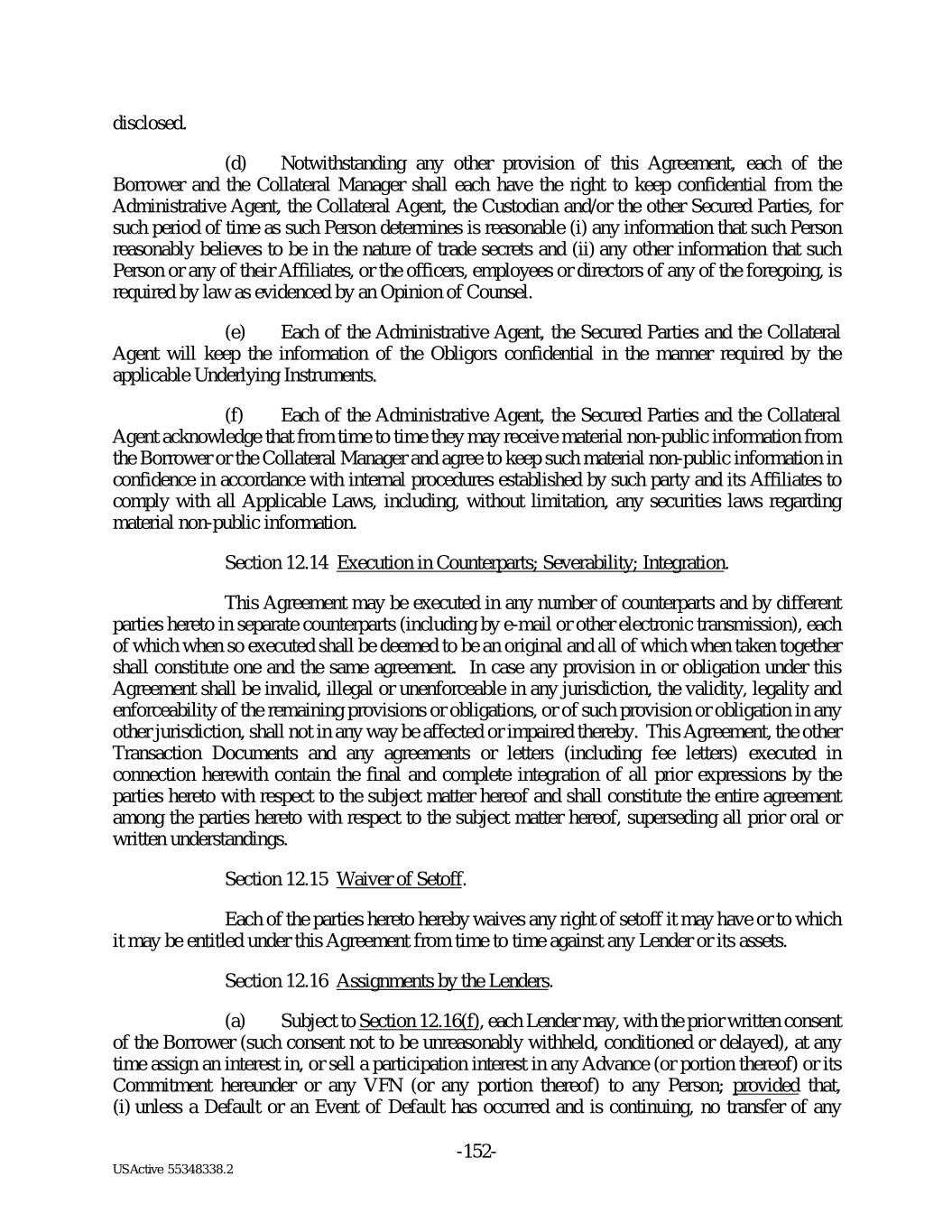disclosed. (d) Notwithstanding any other provision of this Agreement, each of the Borrower and the Collateral Manager shall each have the right to keep confidential from the Administrative Agent, the Collateral Agent, the Custodian and/or the other Secured Parties, for such period of time as such Person determines is reasonable (i) any information that such Person reasonably believes to be in the nature of trade secrets and (ii) any other information that such Person or any of their Affiliates, or the officers, employees or directors of any of the foregoing, is required by law as evidenced by an Opinion of Counsel. (e) Each of the Administrative Agent, the Secured Parties and the Collateral Agent will keep the information of the Obligors confidential in the manner required by the applicable Underlying Instruments. (f) Each of the Administrative Agent, the Secured Parties and the Collateral Agent acknowledge that from time to time they may receive material non-public information from the Borrower or the Collateral Manager and agree to keep such material non-public information in confidence in accordance with internal procedures established by such party and its Affiliates to comply with all Applicable Laws, including, without limitation, any securities laws regarding material non-public information. Section 12.14 Execution in Counterparts; Severability; Integration. This Agreement may be executed in any number of counterparts and by different parties hereto in separate counterparts (including by e-mail or other electronic transmission), each of which when so executed shall be deemed to be an original and all of which when taken together shall constitute one and the same agreement. In case any provision in or obligation under this Agreement shall be invalid, illegal or unenforceable in any jurisdiction, the validity, legality and enforceability of the remaining provisions or obligations, or of such provision or obligation in any other jurisdiction, shall not in any way be affected or impaired thereby. This Agreement, the other Transaction Documents and any agreements or letters (including fee letters) executed in connection herewith contain the final and complete integration of all prior expressions by the parties hereto with respect to the subject matter hereof and shall constitute the entire agreement among the parties hereto with respect to the subject matter hereof, superseding all prior oral or written understandings. Section 12.15 Waiver of Setoff. Each of the parties hereto hereby waives any right of setoff it may have or to which it may be entitled under this Agreement from time to time against any Lender or its assets. Section 12.16 Assignments by the Lenders. (a) Subject to Section 12.16(f), each Lender may, with the prior written consent of the Borrower (such consent not to be unreasonably withheld, conditioned or delayed), at any time assign an interest in, or sell a participation interest in any Advance (or portion thereof) or its Commitment hereunder or any VFN (or any portion thereof) to any Person; provided that, (i) unless a Default or an Event of Default has occurred and is continuing, no transfer of any -152- USActive 55348338.2