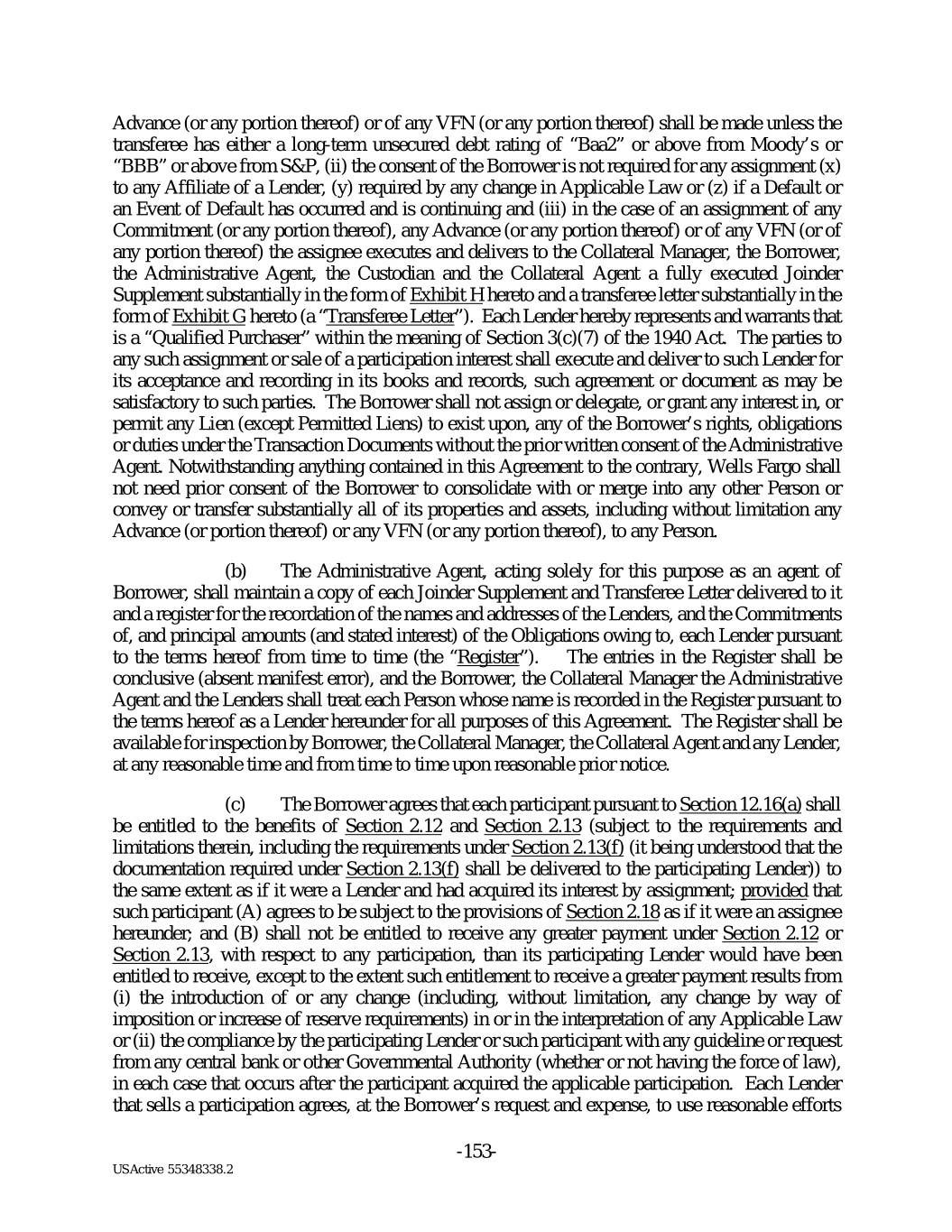 Advance (or any portion thereof) or of any VFN (or any portion thereof) shall be made unless the transferee has either a long-term unsecured debt rating of “Baa2” or above from Moody’s or “BBB” or above from S&P, (ii) the consent of the Borrower is not required for any assignment (x) to any Affiliate of a Lender, (y) required by any change in Applicable Law or (z) if a Default or an Event of Default has occurred and is continuing and (iii) in the case of an assignment of any Commitment (or any portion thereof), any Advance (or any portion thereof) or of any VFN (or of any portion thereof) the assignee executes and delivers to the Collateral Manager, the Borrower, the Administrative Agent, the Custodian and the Collateral Agent a fully executed Joinder Supplement substantially in the form of Exhibit H hereto and a transferee letter substantially in the form of Exhibit G hereto (a “Transferee Letter”). Each Lender hereby represents and warrants that is a “Qualified Purchaser” within the meaning of Section 3(c)(7) of the 1940 Act. The parties to any such assignment or sale of a participation interest shall execute and deliver to such Lender for its acceptance and recording in its books and records, such agreement or document as may be satisfactory to such parties. The Borrower shall not assign or delegate, or grant any interest in, or permit any Lien (except Permitted Liens) to exist upon, any of the Borrower’s rights, obligations or duties under the Transaction Documents without the prior written consent of the Administrative Agent. Notwithstanding anything contained in this Agreement to the contrary, Wells Fargo shall not need prior consent of the Borrower to consolidate with or merge into any other Person or convey or transfer substantially all of its properties and assets, including without limitation any Advance (or portion thereof) or any VFN (or any portion thereof), to any Person. (b) The Administrative Agent, acting solely for this purpose as an agent of Borrower, shall maintain a copy of each Joinder Supplement and Transferee Letter delivered to it and a register for the recordation of the names and addresses of the Lenders, and the Commitments of, and principal amounts (and stated interest) of the Obligations owing to, each Lender pursuant to the terms hereof from time to time (the “Register”). The entries in the Register shall be conclusive (absent manifest error), and the Borrower, the Collateral Manager the Administrative Agent and the Lenders shall treat each Person whose name is recorded in the Register pursuant to the terms hereof as a Lender hereunder for all purposes of this Agreement. The Register shall be available for inspection by Borrower, the Collateral Manager, the Collateral Agent and any Lender, at any reasonable time and from time to time upon reasonable prior notice. (c) The Borrower agrees that each participant pursuant to Section 12.16(a) shall be entitled to the benefits of Section 2.12 and Section 2.13 (subject to the requirements and limitations therein, including the requirements under Section 2.13(f) (it being understood that the documentation required under Section 2.13(f) shall be delivered to the participating Lender)) to the same extent as if it were a Lender and had acquired its interest by assignment; provided that such participant (A) agrees to be subject to the provisions of Section 2.18 as if it were an assignee hereunder; and (B) shall not be entitled to receive any greater payment under Section 2.12 or Section 2.13, with respect to any participation, than its participating Lender would have been entitled to receive, except to the extent such entitlement to receive a greater payment results from (i) the introduction of or any change (including, without limitation, any change by way of imposition or increase of reserve requirements) in or in the interpretation of any Applicable Law or (ii) the compliance by the participating Lender or such participant with any guideline or request from any central bank or other Governmental Authority (whether or not having the force of law), in each case that occurs after the participant acquired the applicable participation. Each Lender that sells a participation agrees, at the Borrower’s request and expense, to use reasonable efforts -153- USActive 55348338.2