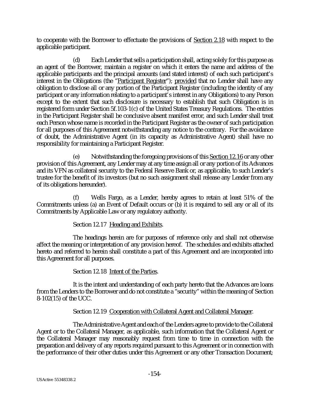 to cooperate with the Borrower to effectuate the provisions of Section 2.18 with respect to the applicable participant. (d) Each Lender that sells a participation shall, acting solely for this purpose as an agent of the Borrower, maintain a register on which it enters the name and address of the applicable participants and the principal amounts (and stated interest) of each such participant’s interest in the Obligations (the “Participant Register”); provided that no Lender shall have any obligation to disclose all or any portion of the Participant Register (including the identity of any participant or any information relating to a participant’s interest in any Obligations) to any Person except to the extent that such disclosure is necessary to establish that such Obligation is in registered form under Section 5f.103-1(c) of the United States Treasury Regulations. The entries in the Participant Register shall be conclusive absent manifest error, and such Lender shall treat each Person whose name is recorded in the Participant Register as the owner of such participation for all purposes of this Agreement notwithstanding any notice to the contrary. For the avoidance of doubt, the Administrative Agent (in its capacity as Administrative Agent) shall have no responsibility for maintaining a Participant Register. (e) Notwithstanding the foregoing provisions of this Section 12.16 or any other provision of this Agreement, any Lender may at any time assign all or any portion of its Advances and its VFN as collateral security to the Federal Reserve Bank or, as applicable, to such Lender’s trustee for the benefit of its investors (but no such assignment shall release any Lender from any of its obligations hereunder). (f) Wells Fargo, as a Lender, hereby agrees to retain at least 51% of the Commitments unless (a) an Event of Default occurs or (b) it is required to sell any or all of its Commitments by Applicable Law or any regulatory authority. Section 12.17 Heading and Exhibits. The headings herein are for purposes of reference only and shall not otherwise affect the meaning or interpretation of any provision hereof. The schedules and exhibits attached hereto and referred to herein shall constitute a part of this Agreement and are incorporated into this Agreement for all purposes. Section 12.18 Intent of the Parties. It is the intent and understanding of each party hereto that the Advances are loans from the Lenders to the Borrower and do not constitute a “security” within the meaning of Section 8-102(15) of the UCC. Section 12.19 Cooperation with Collateral Agent and Collateral Manager. The Administrative Agent and each of the Lenders agree to provide to the Collateral Agent or to the Collateral Manager, as applicable, such information that the Collateral Agent or the Collateral Manager may reasonably request from time to time in connection with the preparation and delivery of any reports required pursuant to this Agreement or in connection with the performance of their other duties under this Agreement or any other Transaction Document; -154- USActive 55348338.2